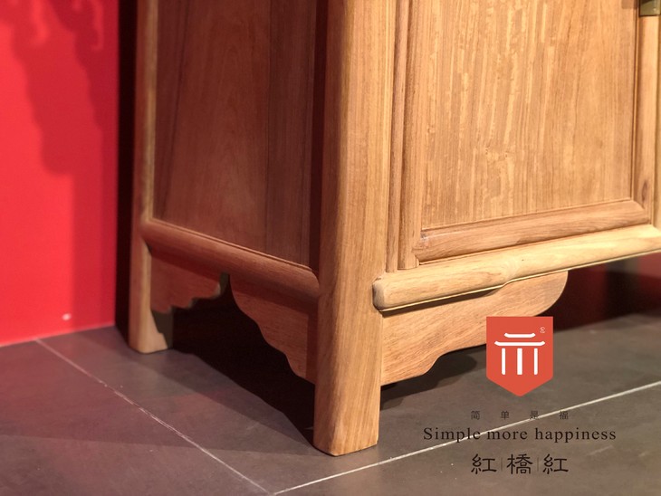 此二联橱两端有翘头,飞檐耸然;橱面攒框镶面心,面下设抽屉两具,安铜活;屉下供储藏的“闷仓”,提供了充足的储物功能。整器侧脚显著,仅挂牙及牙条起线装饰,余均光素,是典型的明式风格。上下横枨两端加宽,留做臼窝,使用了圆角柜的木轴门,柜门一木双开。底部腿足设有素牙条,整体线条简洁,神态质朴浑厚。