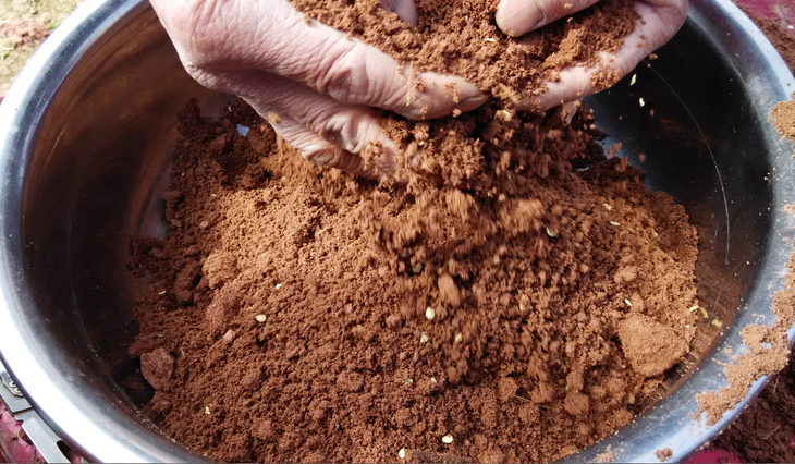 将辣椒种子与红沙土拌均匀