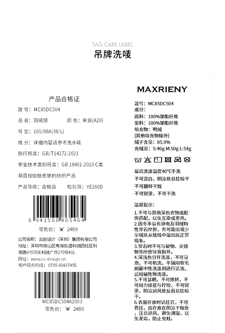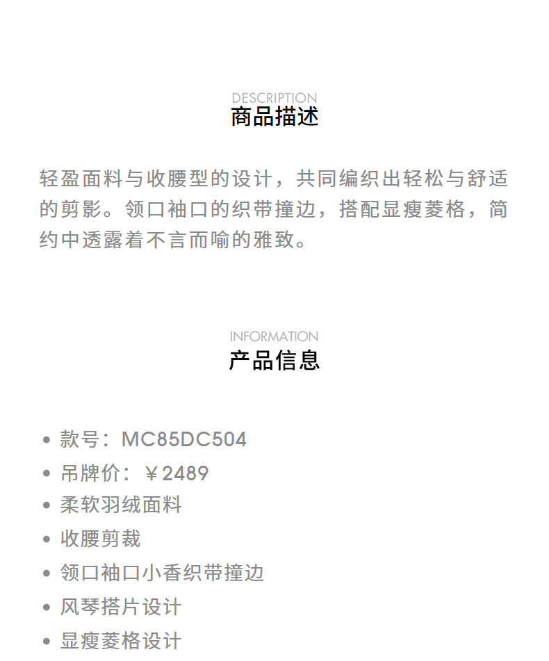 玛克门店发货:MAXRIENY精致休闲羽绒(货号:MC85DC504)