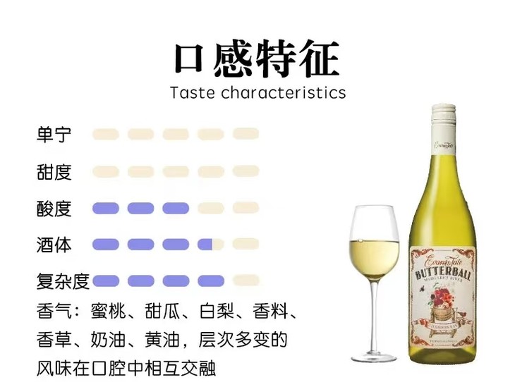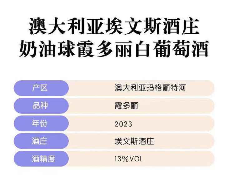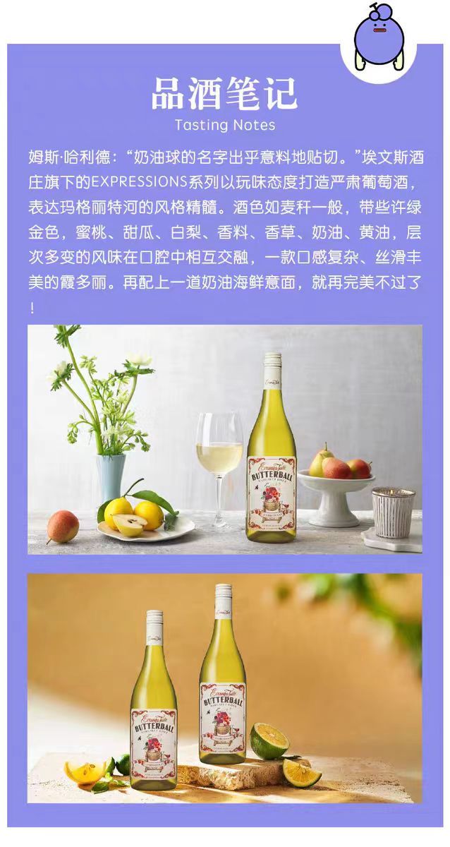 这款酒正如詹姆斯·哈利德所说:“奶油球的名字出乎意料地贴切。”埃文斯酒庄旗下的EXPRESSIONS系列以玩味态度打造严肃葡萄酒,表达玛格丽特河的风格精髓。它不是清新轻盈高酸风格的干白,香气丰富且具有复杂度,是一款明显经过苹果酸乳酸发酵的酒款,保留了非常多的苹乳转换带来的香气,好喝,特别是对于不喜欢高酸干白的酒友来说,非常友好,再看价格,性价比高,果断推荐!