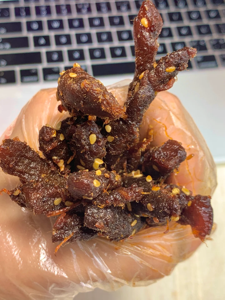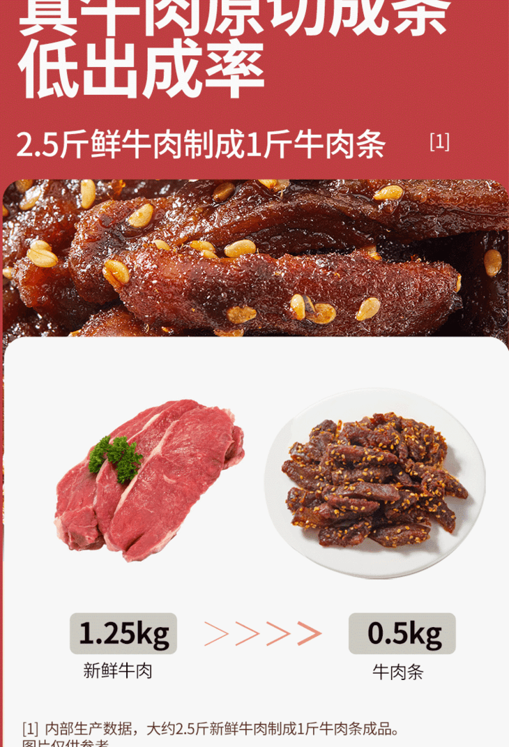幸福口袋牛肉条的用料真的是没得挑,2.5斤生牛肉才出1斤肉条,牛肉成本就摆在这了,真的高。