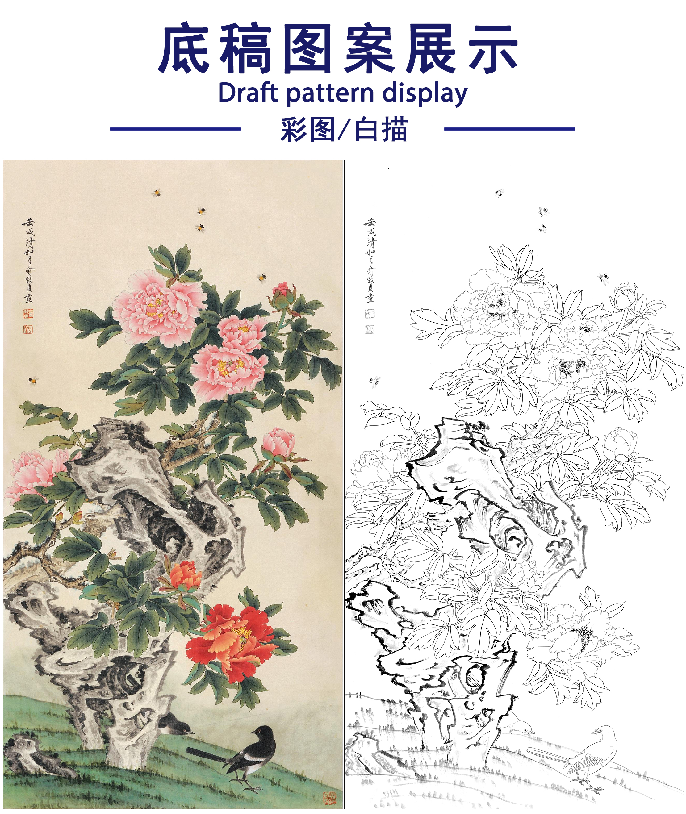 俞致贞花鸟工笔画白描底稿《富贵双喜》牡丹喜鹊临摹勾线高清打印稿ZZ62