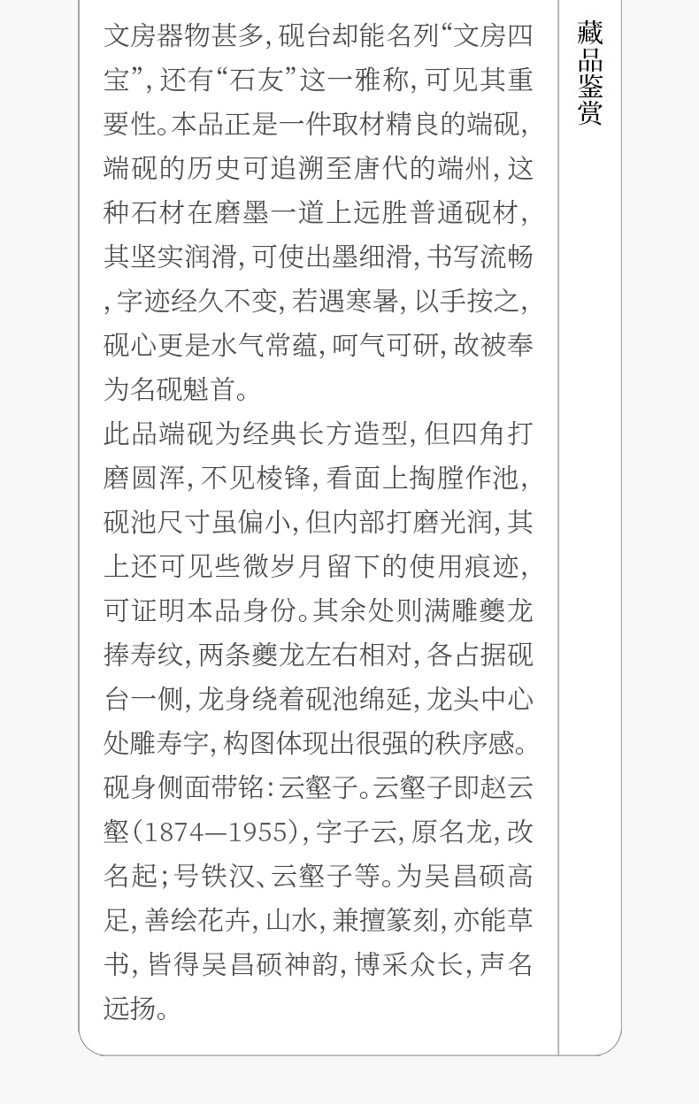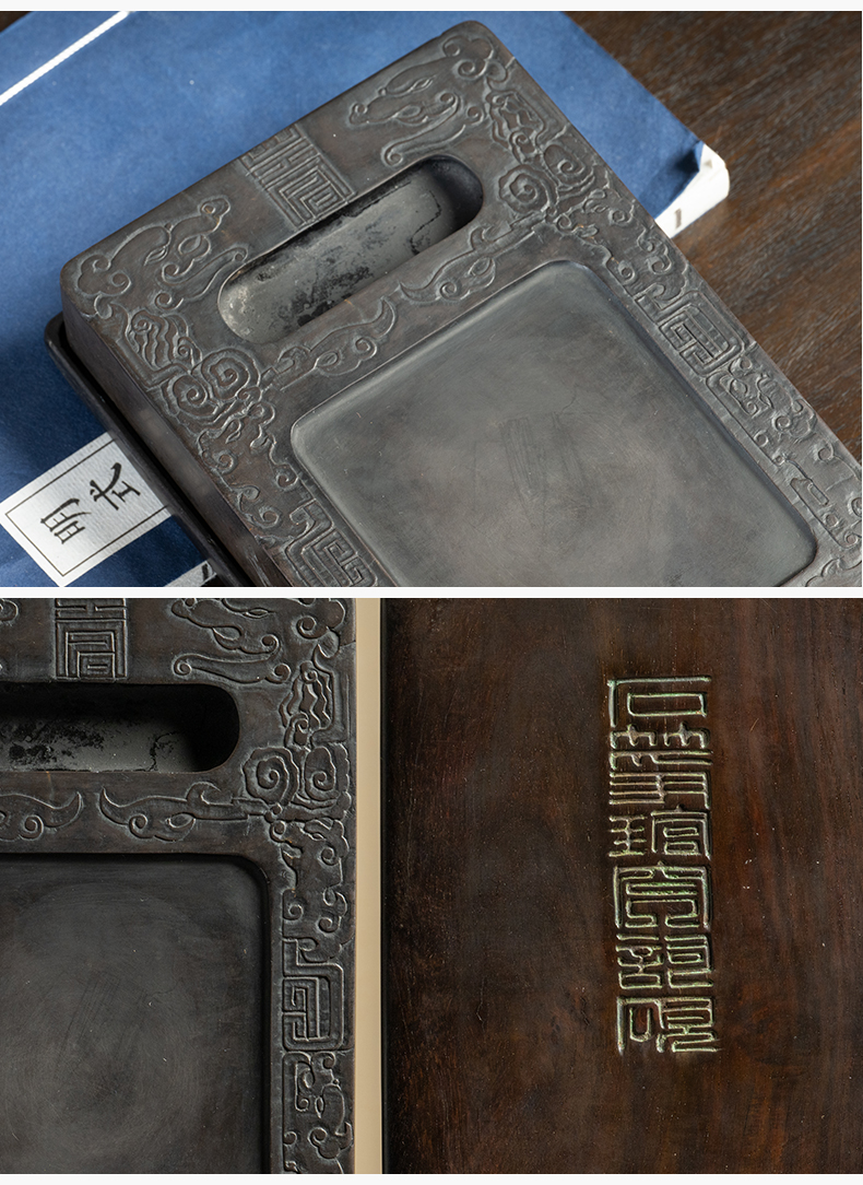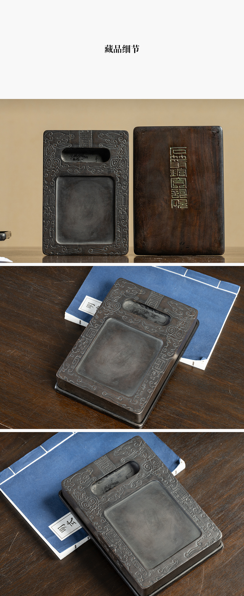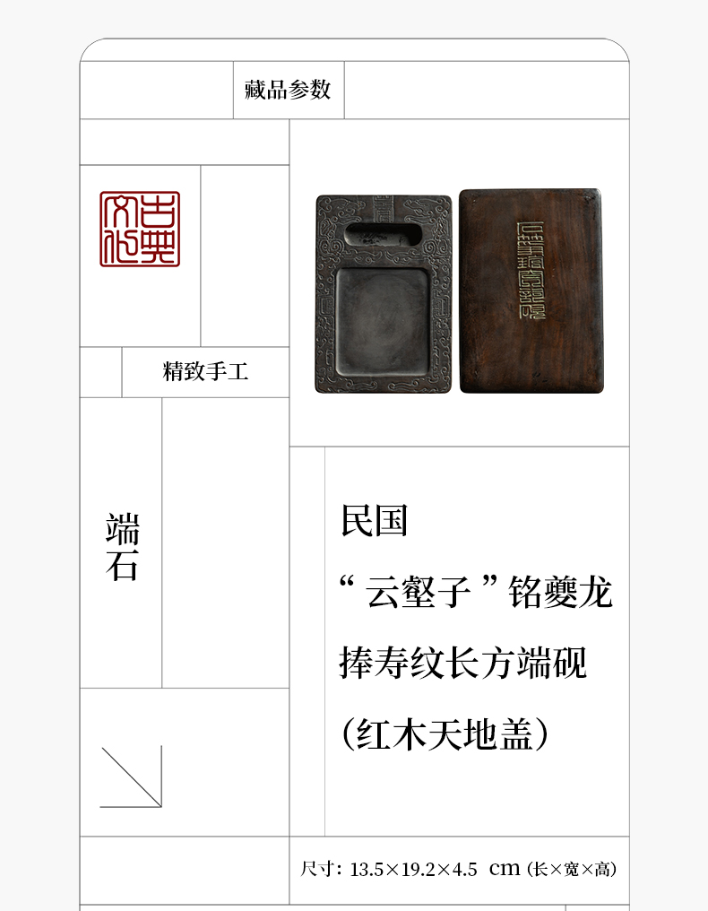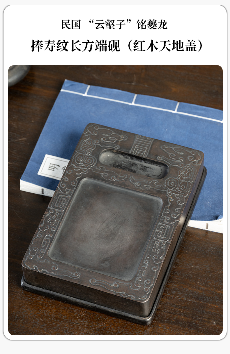 民国 “云壑子”铭夔龙捧寿纹长方端砚(红木天地盖)