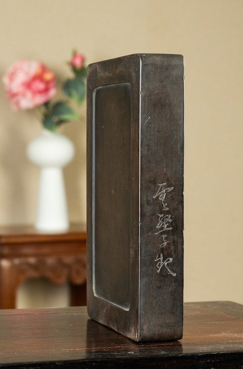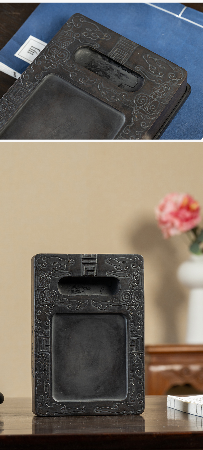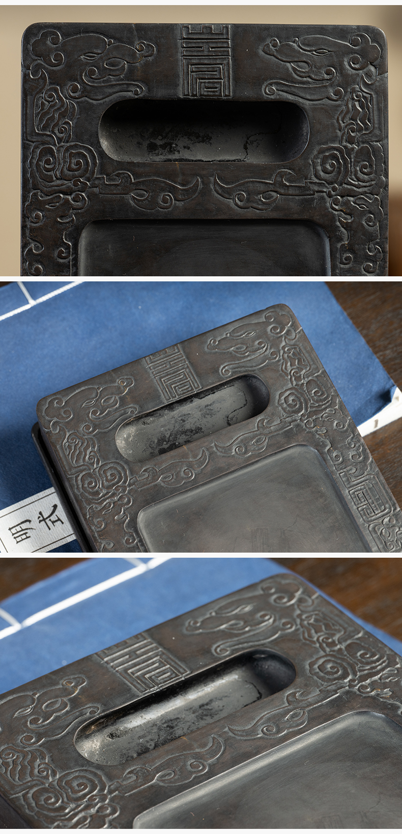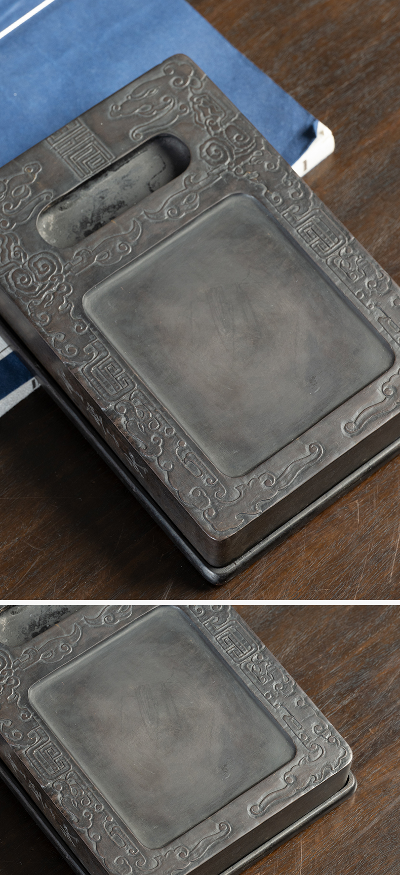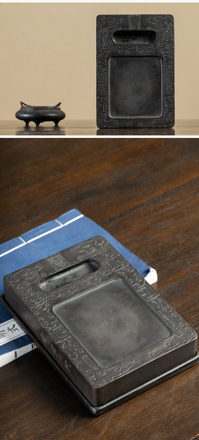 民国 “云壑子”铭夔龙捧寿纹长方端砚(红木天地盖)