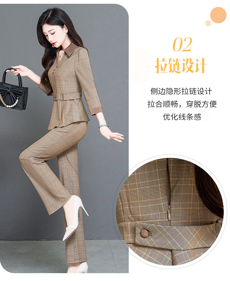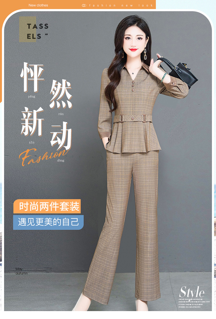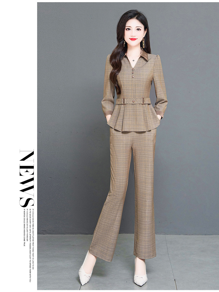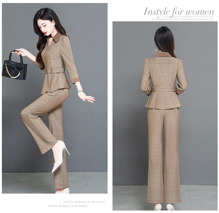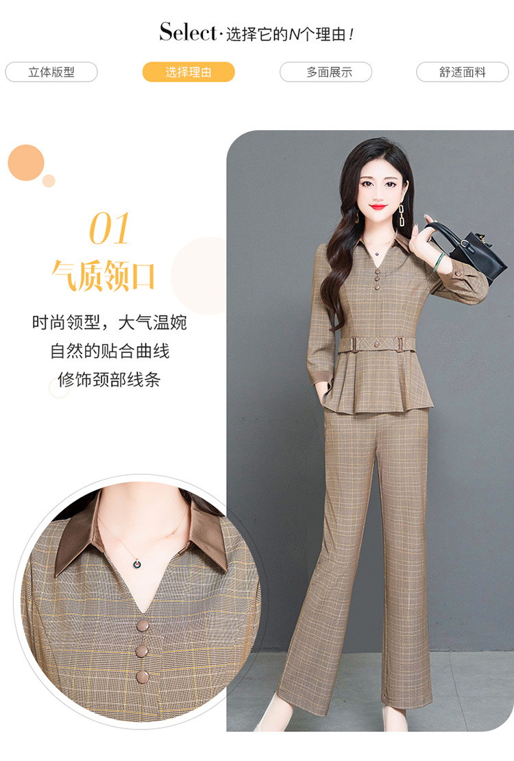 DD-时尚格纹两件套秋季新款职业女装长袖上衣直筒长裤优雅气质套装