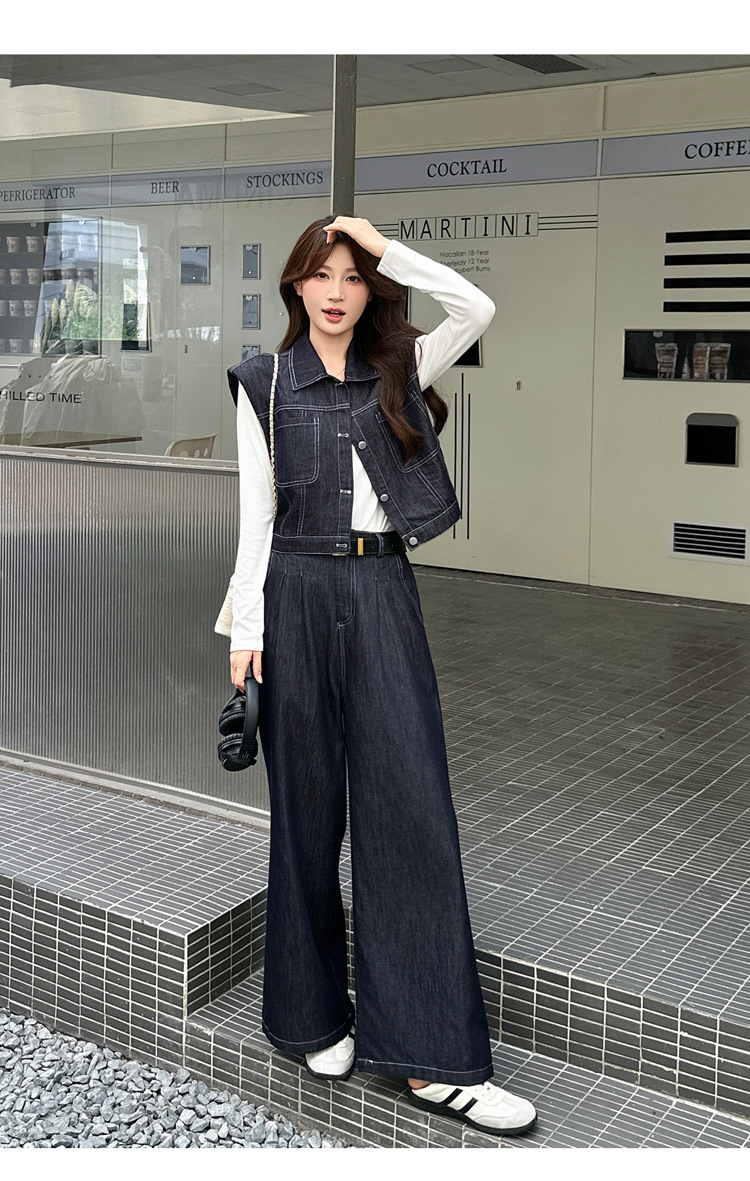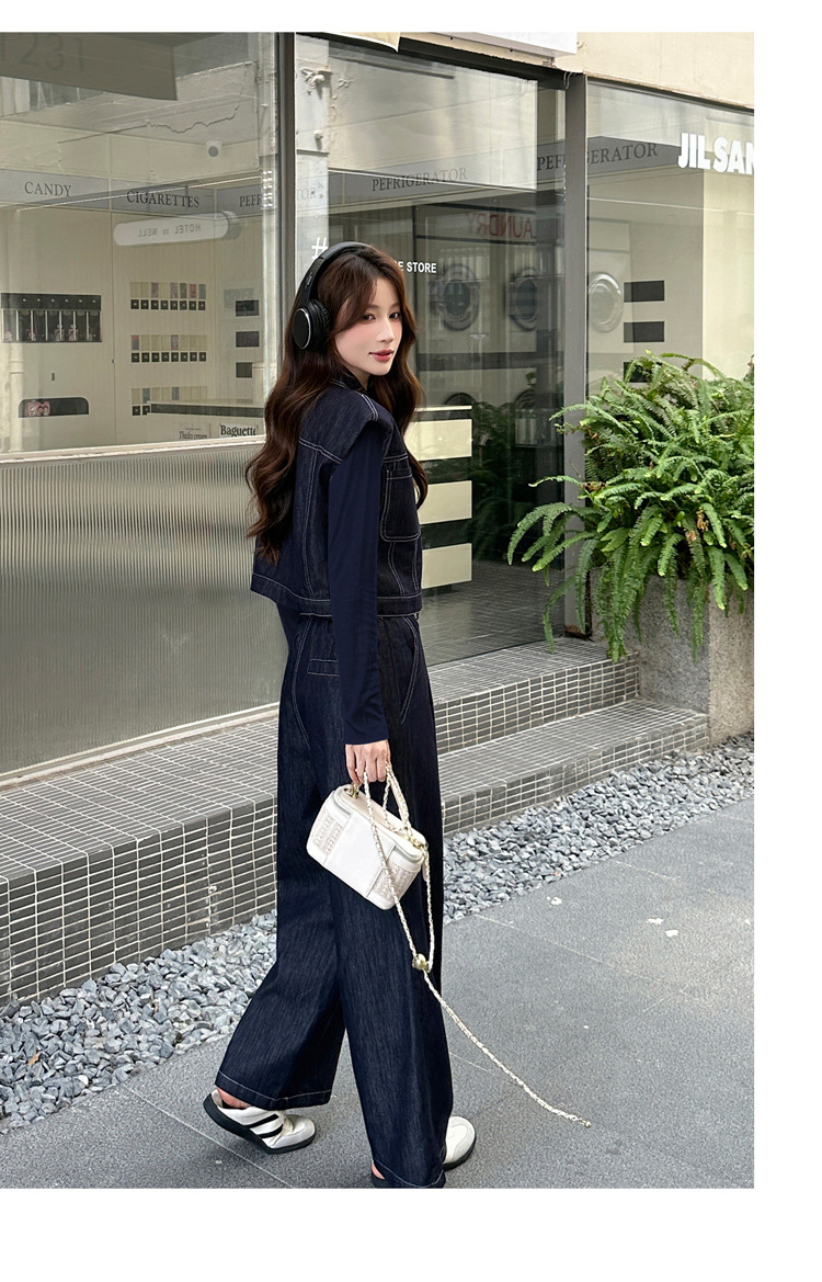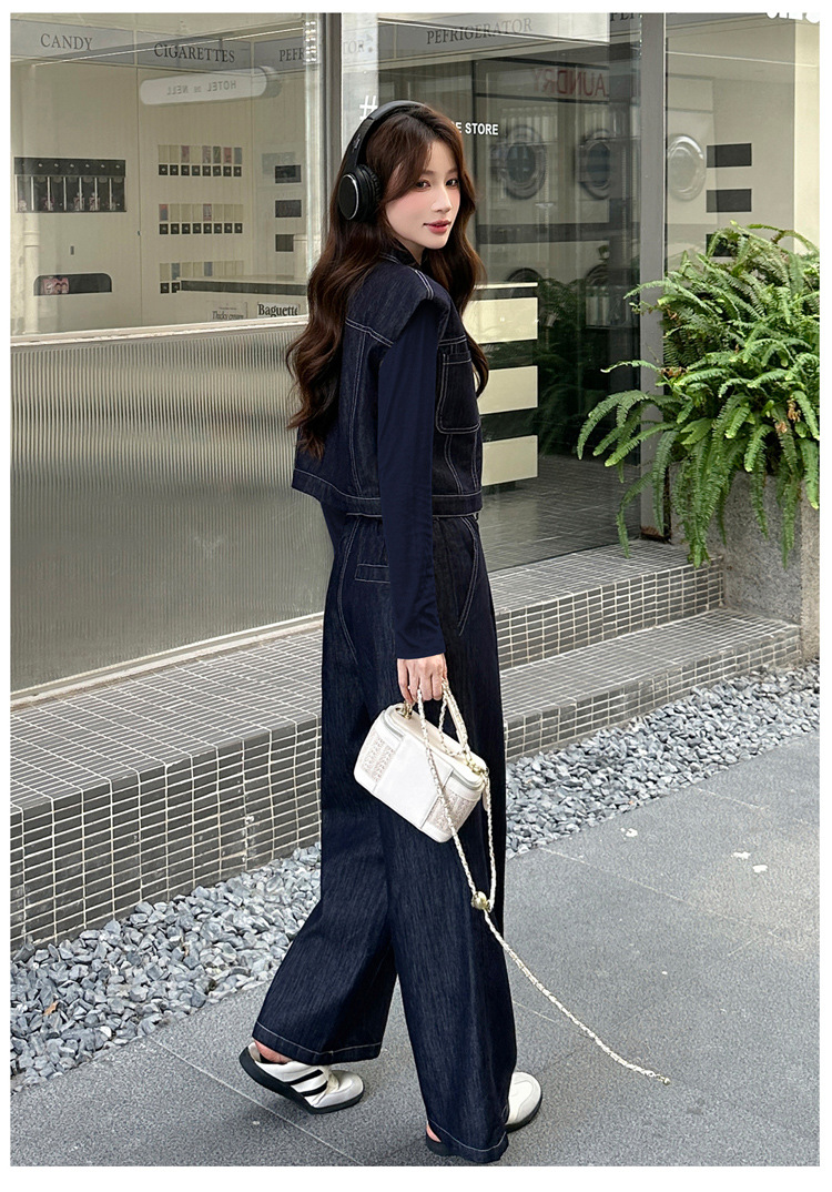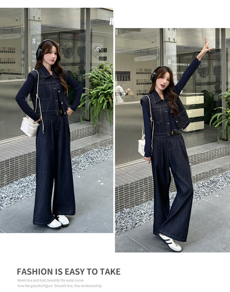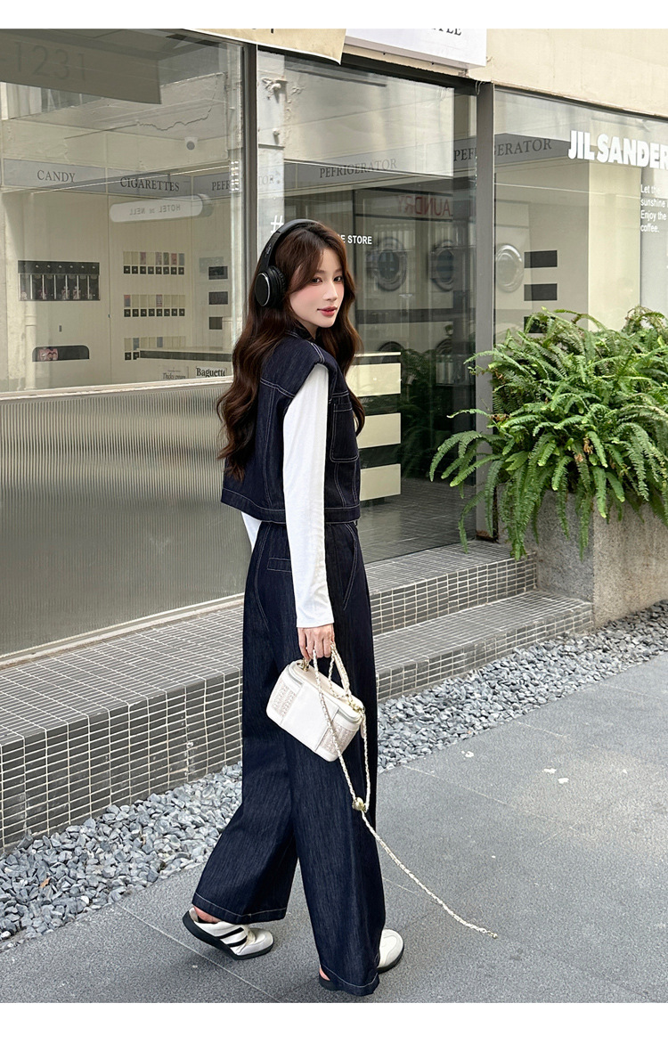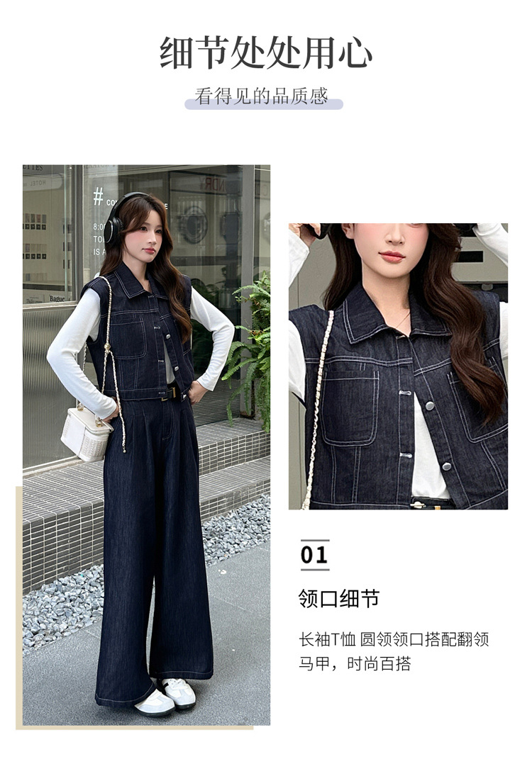 HR YDYX9370复古港风牛仔套装裤时尚休闲马甲上衣阔腿裤三件套