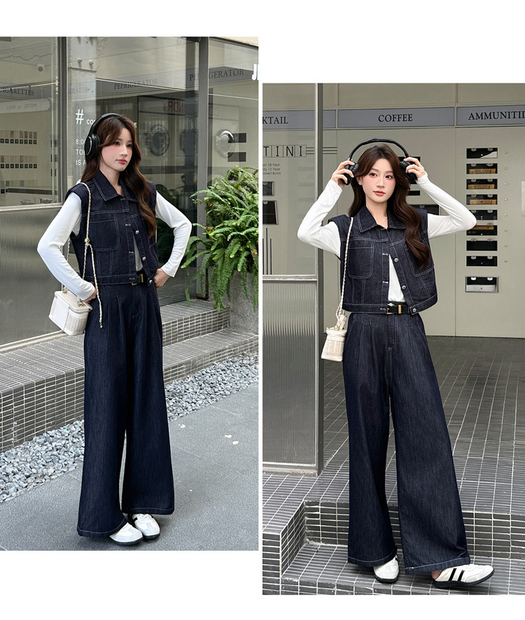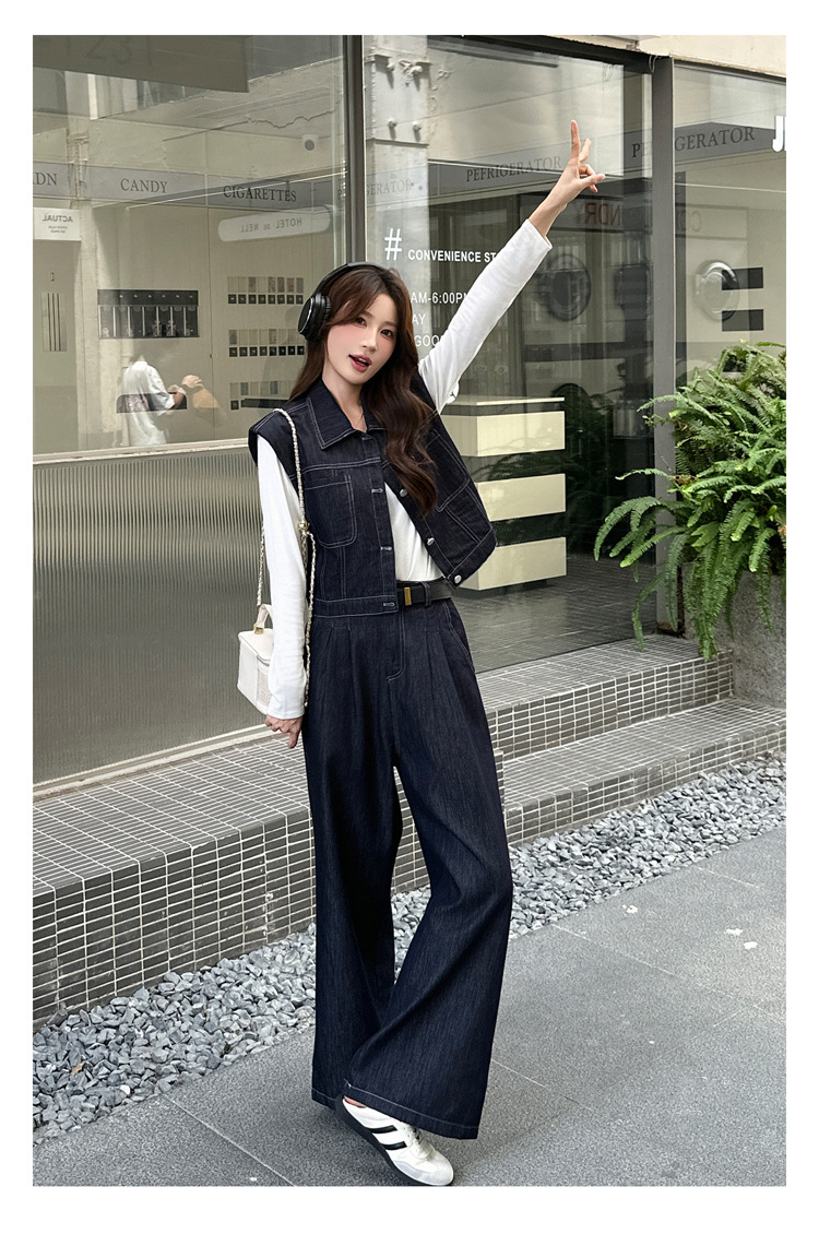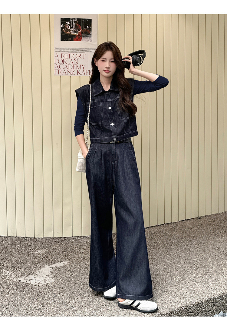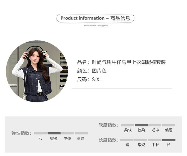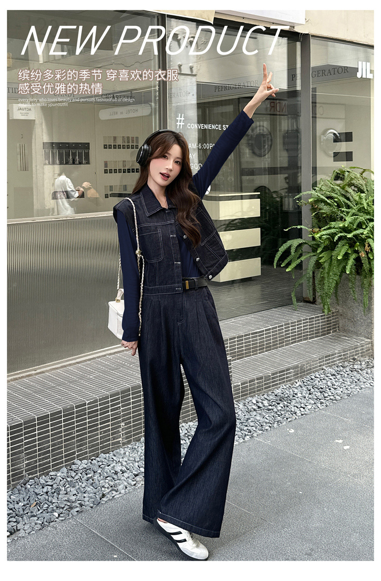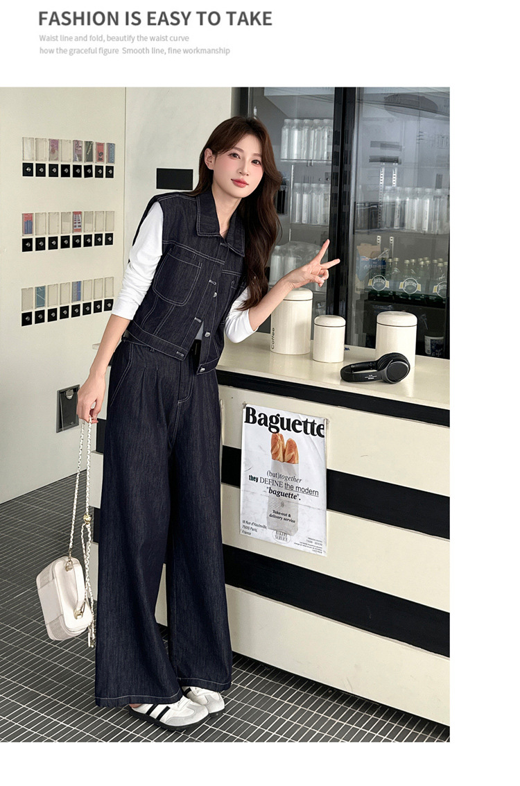 HR YDYX9370复古港风牛仔套装裤时尚休闲马甲上衣阔腿裤三件套
