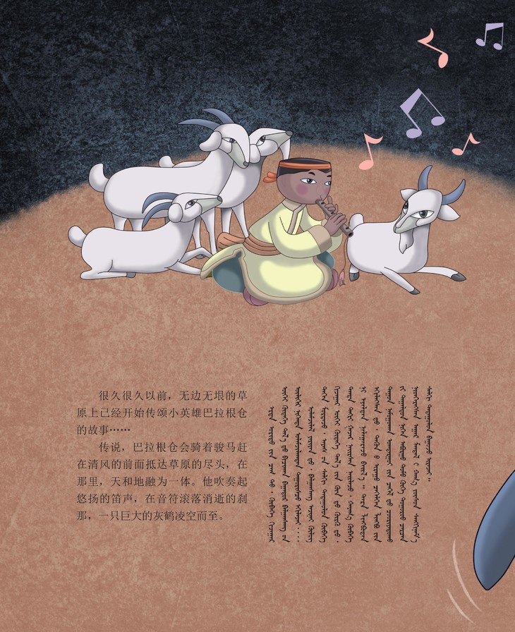 本套丛书是专为3-6岁蒙古族儿童打造的汉蒙双语图画书,源自蒙古族民间广为传颂的小英雄巴拉跟仓的故事,以我国优秀的传统版画风格为艺术表现形式,故事针对学龄前蒙古族儿童的阅读与感知特点进行改编,为蒙古族孩子们以绘本的形式呈现出一个活灵活现的小英雄——巴拉跟仓。本书是丛书中的一册,讲述很久很久以前,草原上便开始传颂小英雄巴拉根仓的故事;据说他会骑着骏马赶在清风的前面到达草场的尽头,在那里,天和地还没有分离;他斜倚马背缓缓吹奏长笛,在音符滚落空寂的刹那,一只巨大的灰鹤划破凝滞随风降下……