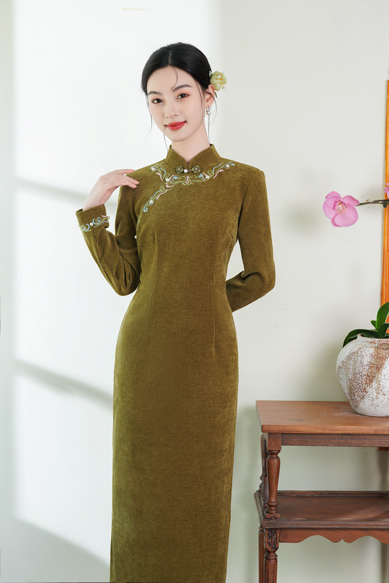 2025年秋季新款改良旗袍日常绣花雪尼尔长款年轻款修身中高端旗袍 商品图1