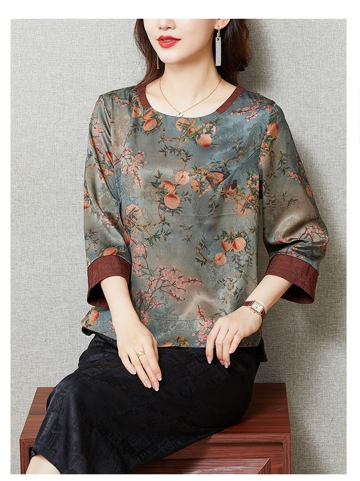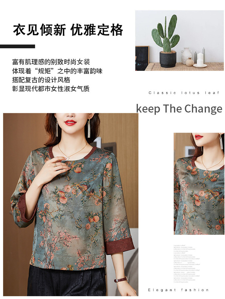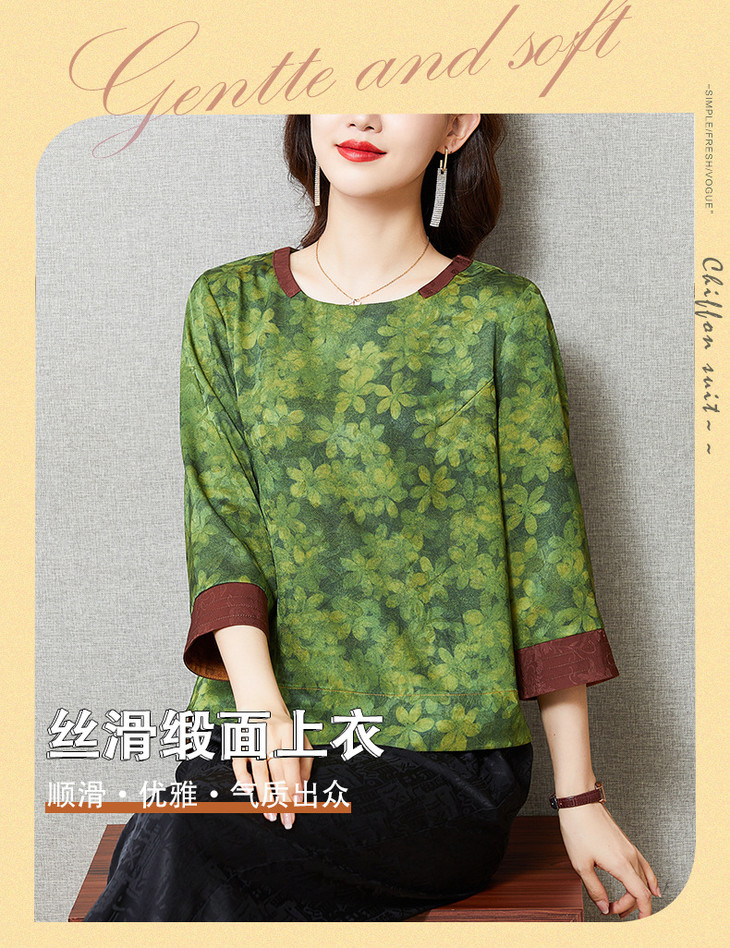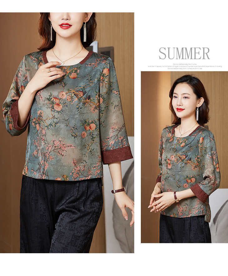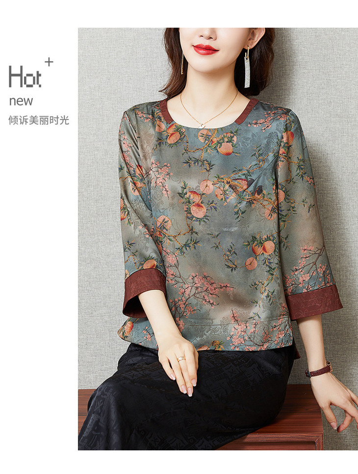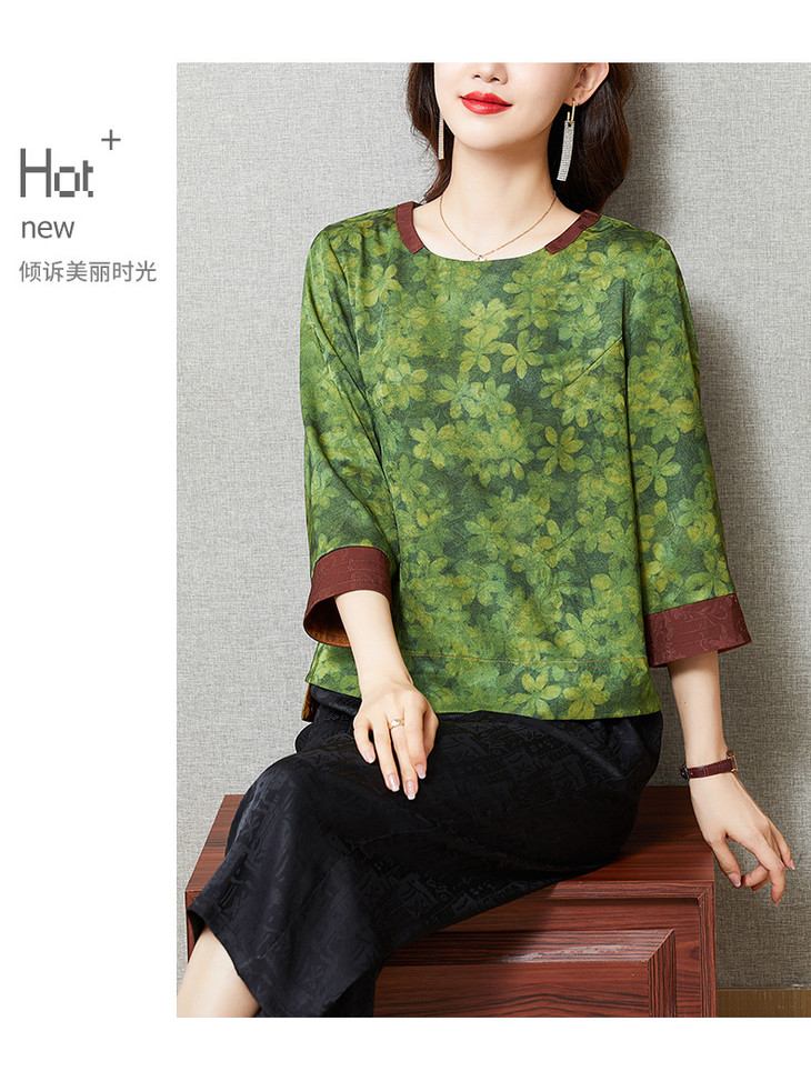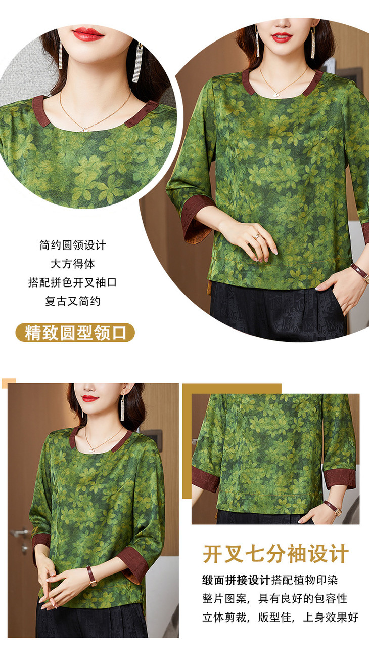 KQL422H2096 2022秋季新款七分袖圆领印花宽松上衣仿真丝桑蚕丝香云纱T恤