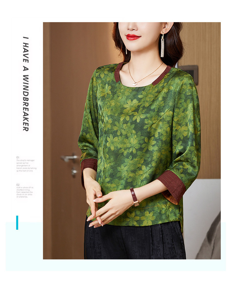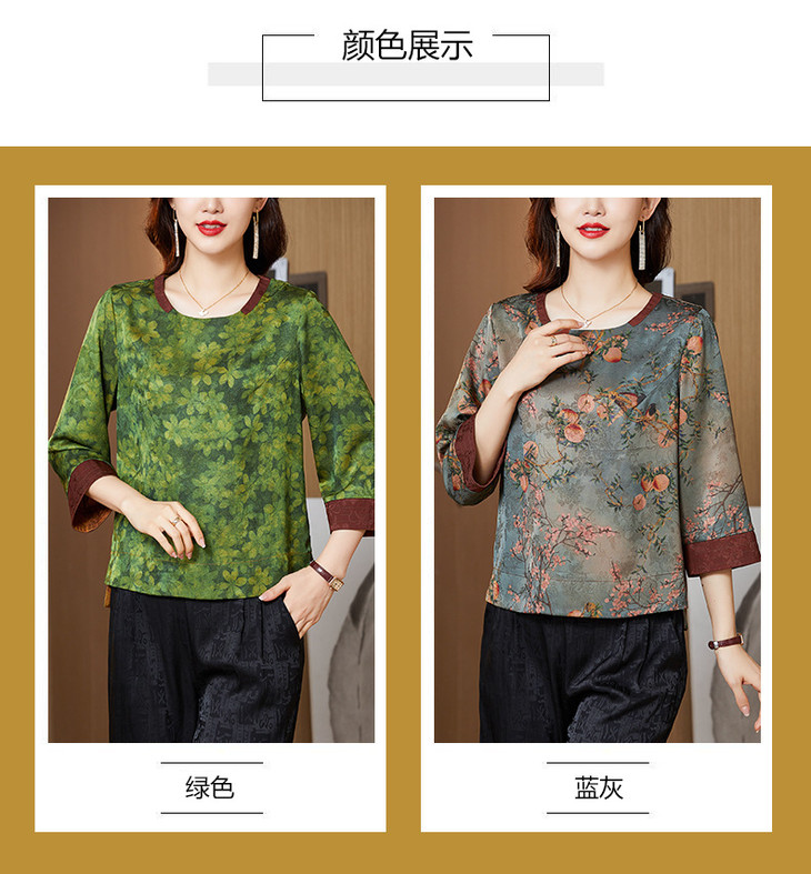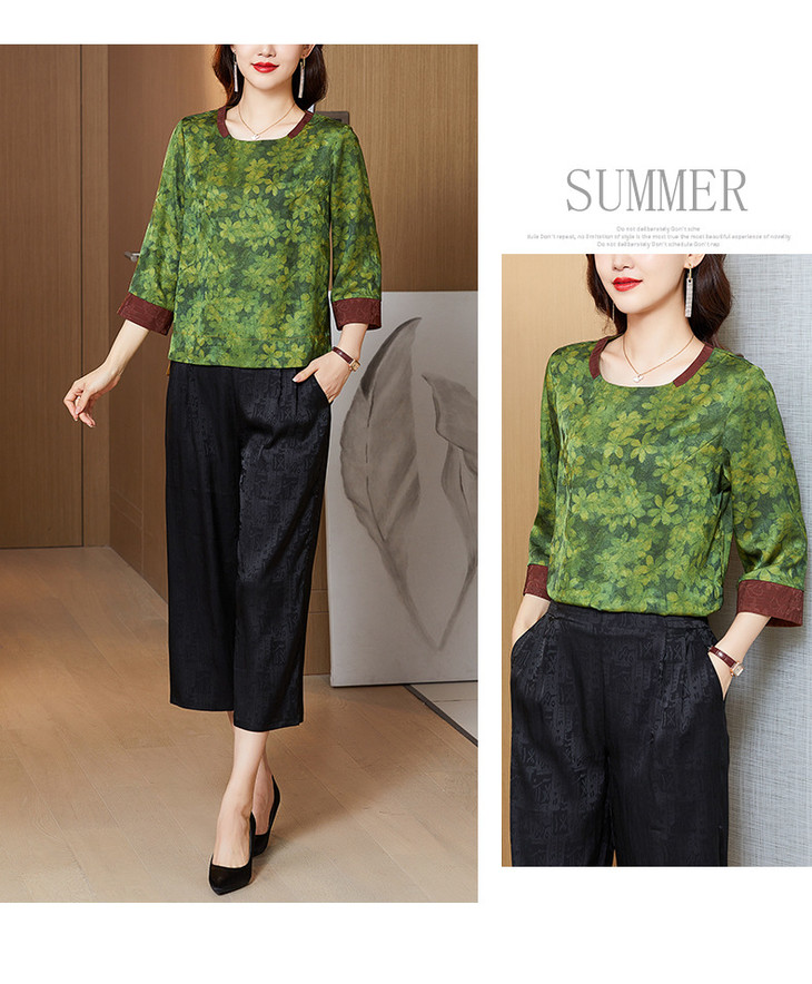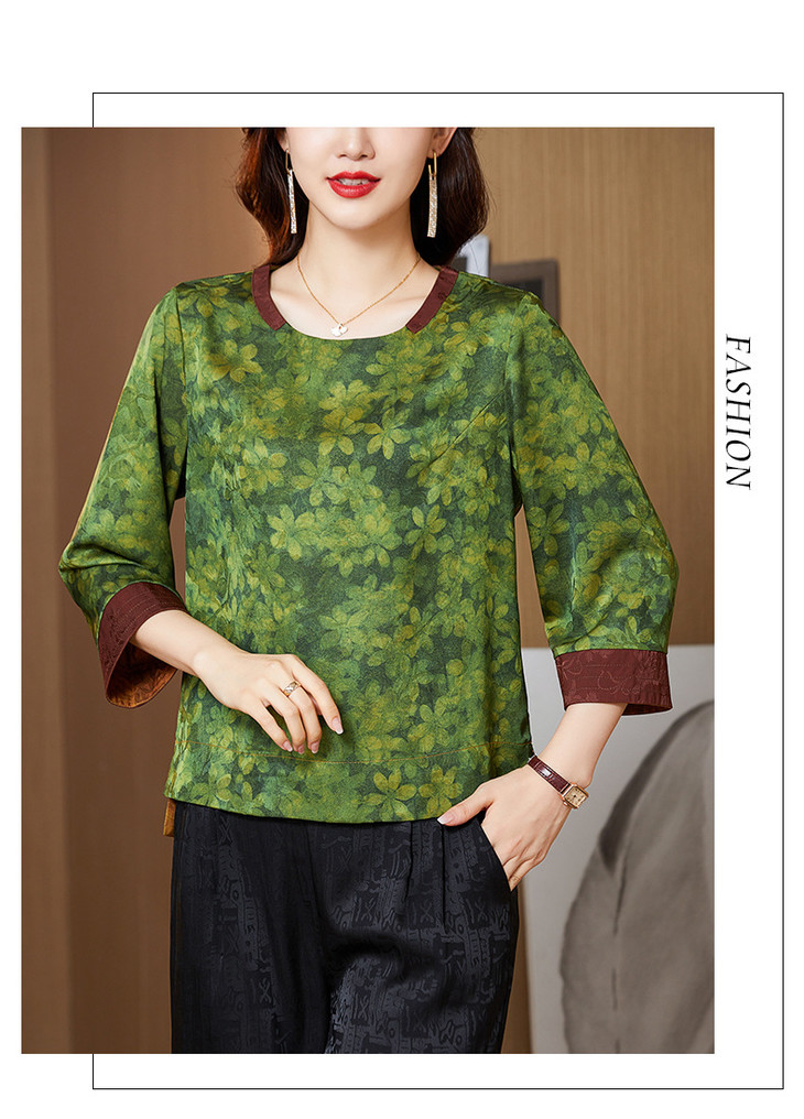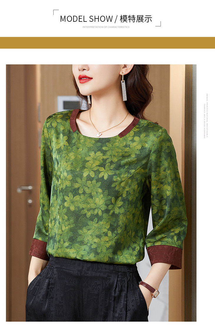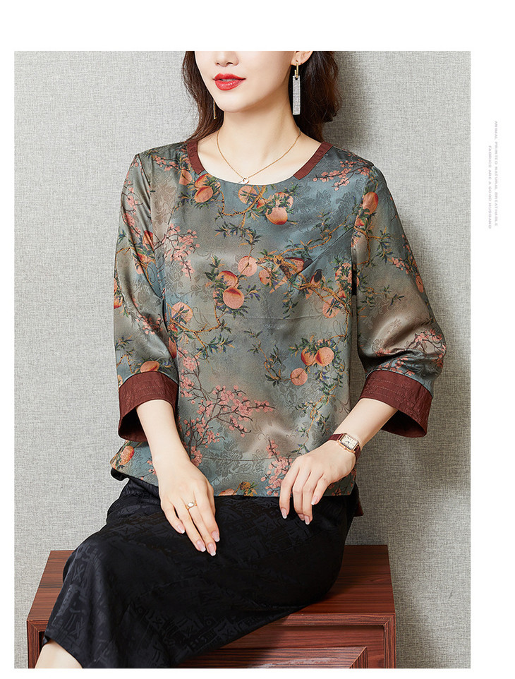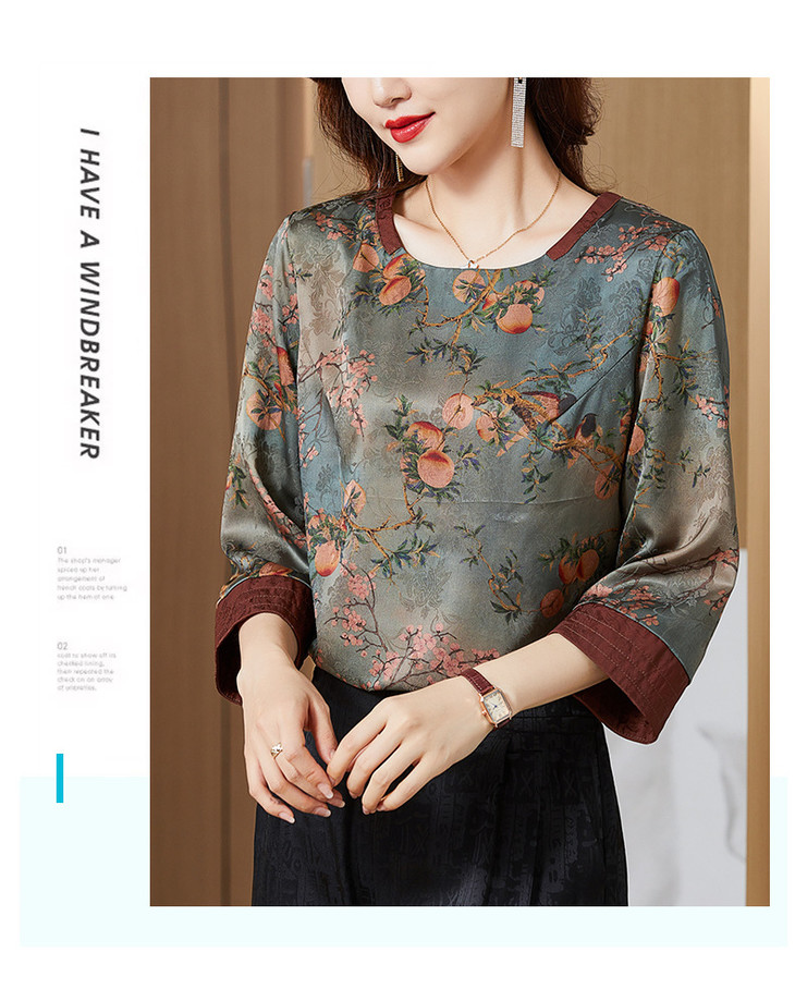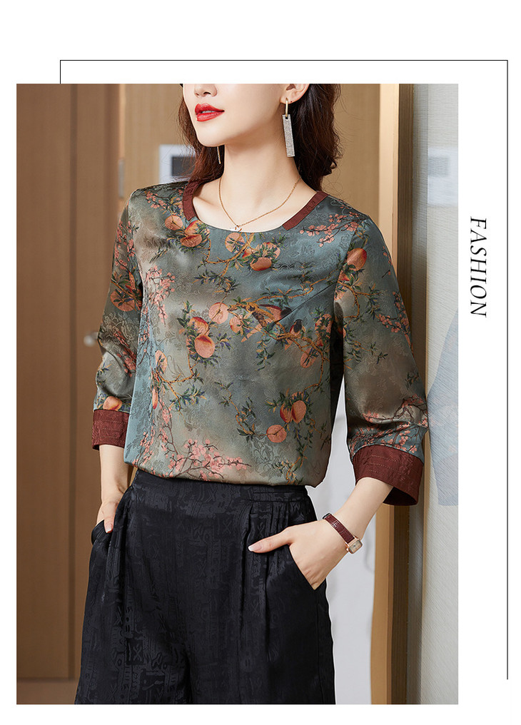 KQL422H2096 2022秋季新款七分袖圆领印花宽松上衣仿真丝桑蚕丝香云纱T恤