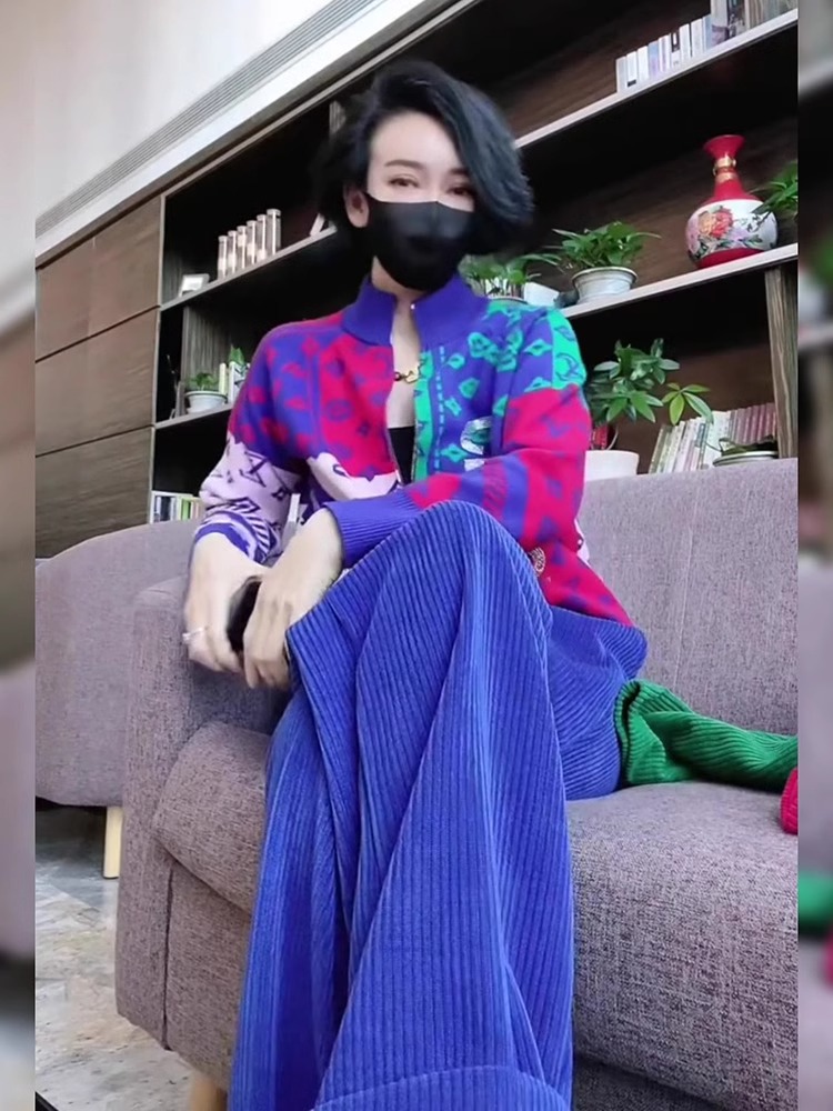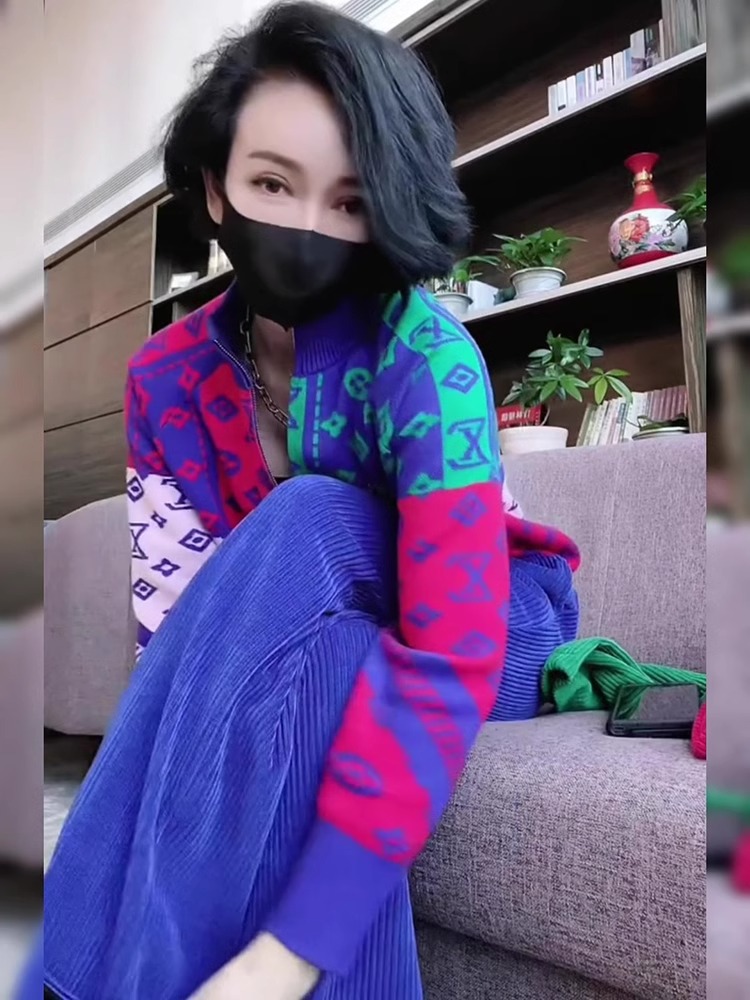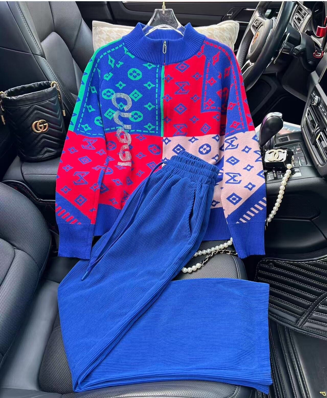 丁摩 蓝色休闲运动套装女秋装高端印花针织开衫长裤搭配两件套5ZF-8283