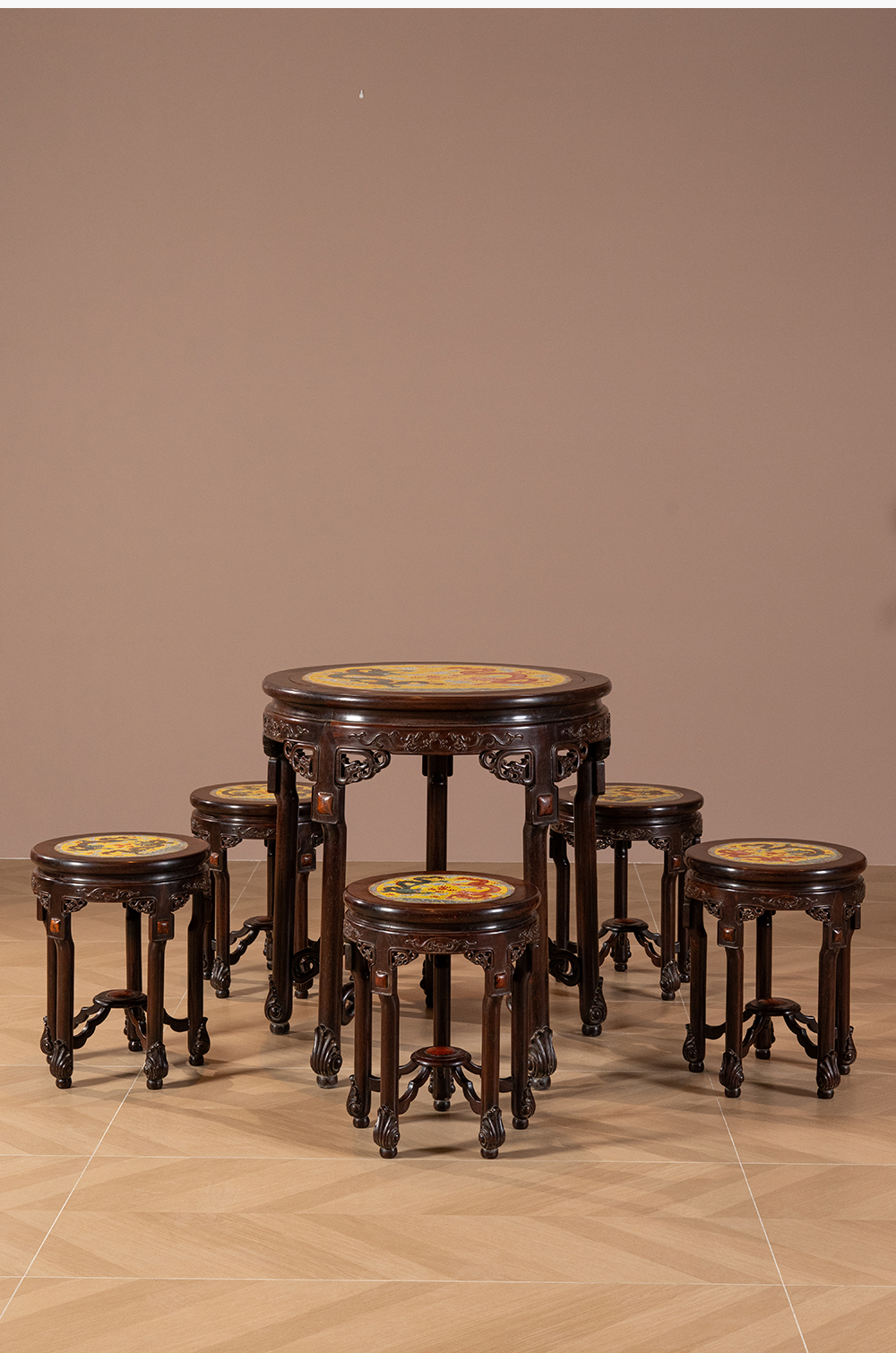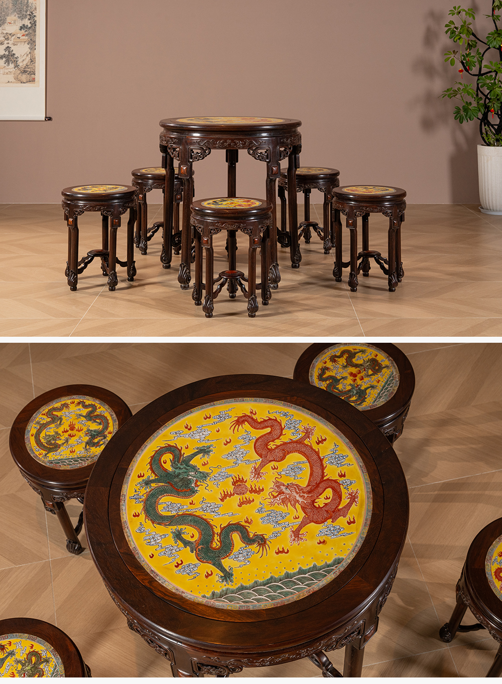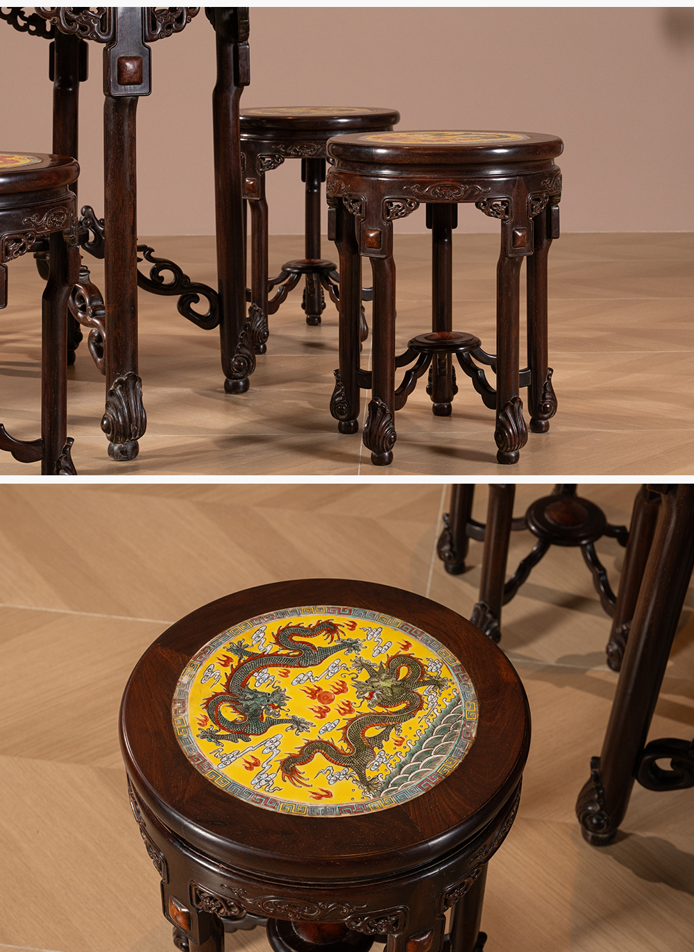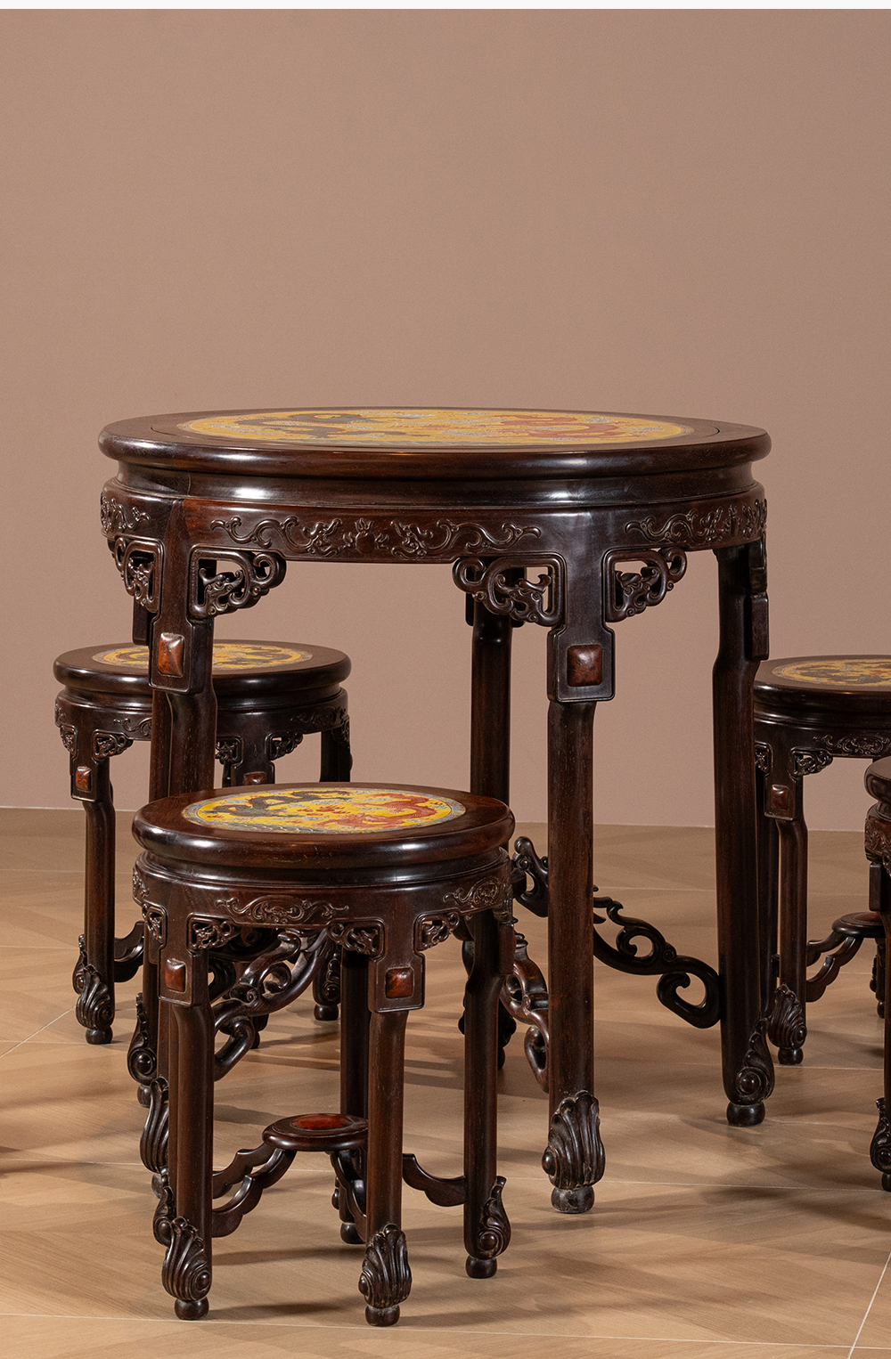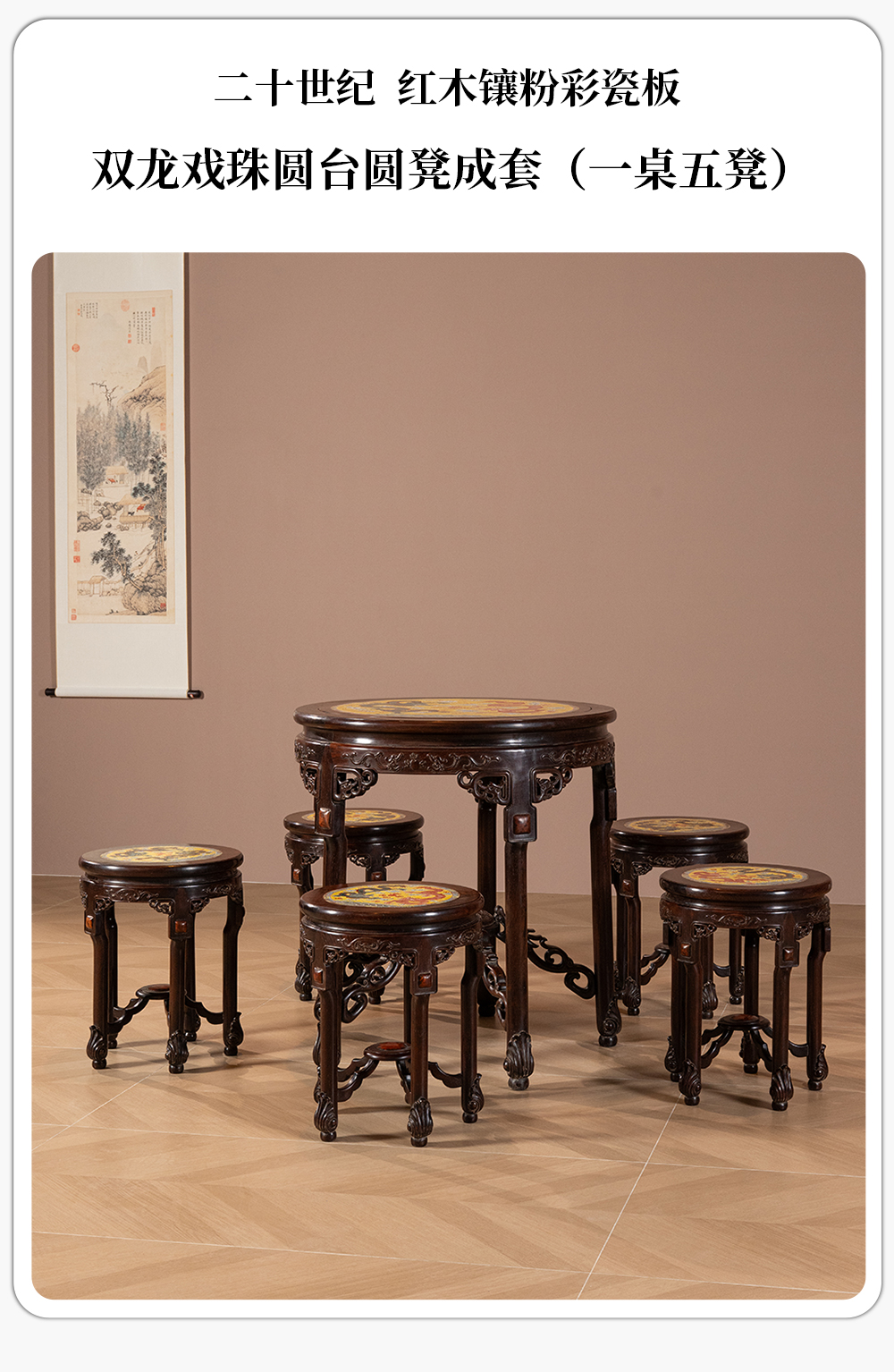 二十世纪 红木镶粉彩瓷板双龙戏珠圆台圆凳成套(一桌五凳)