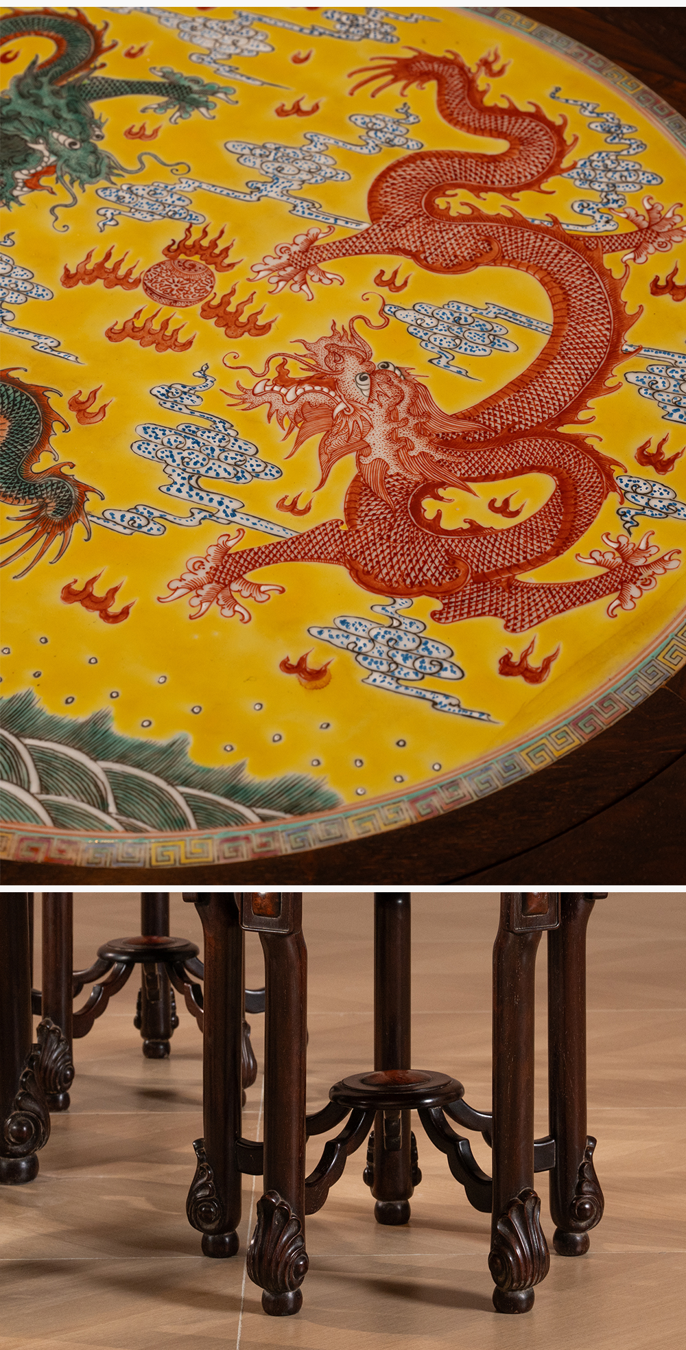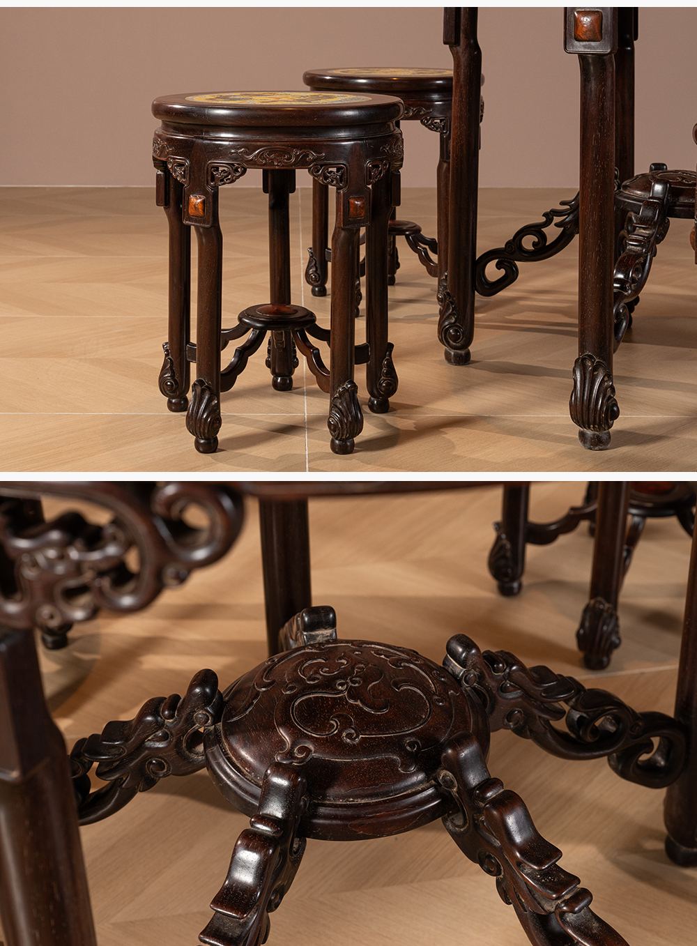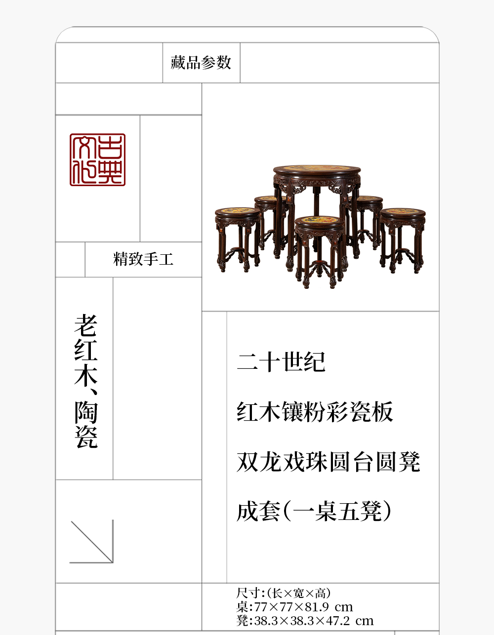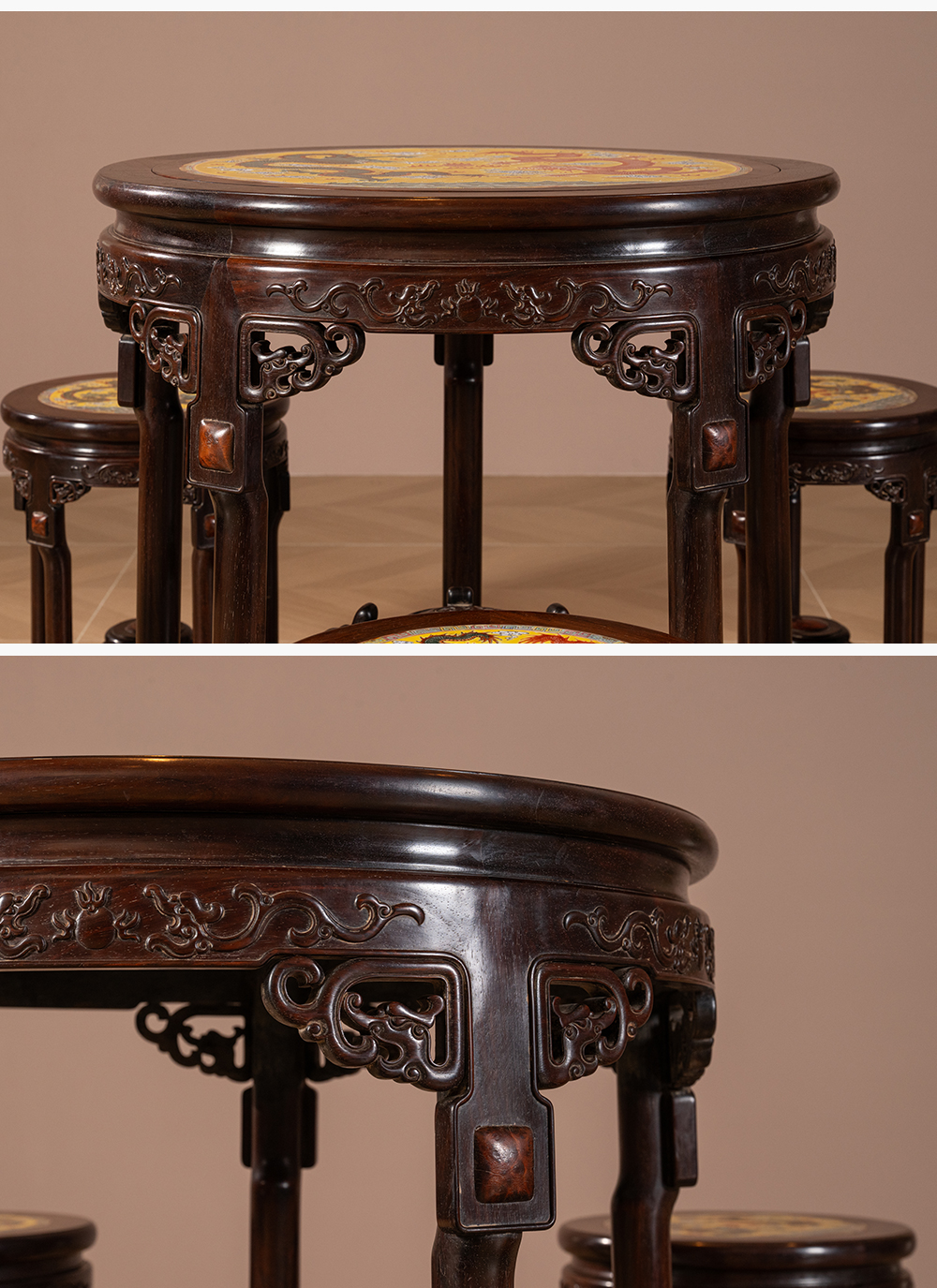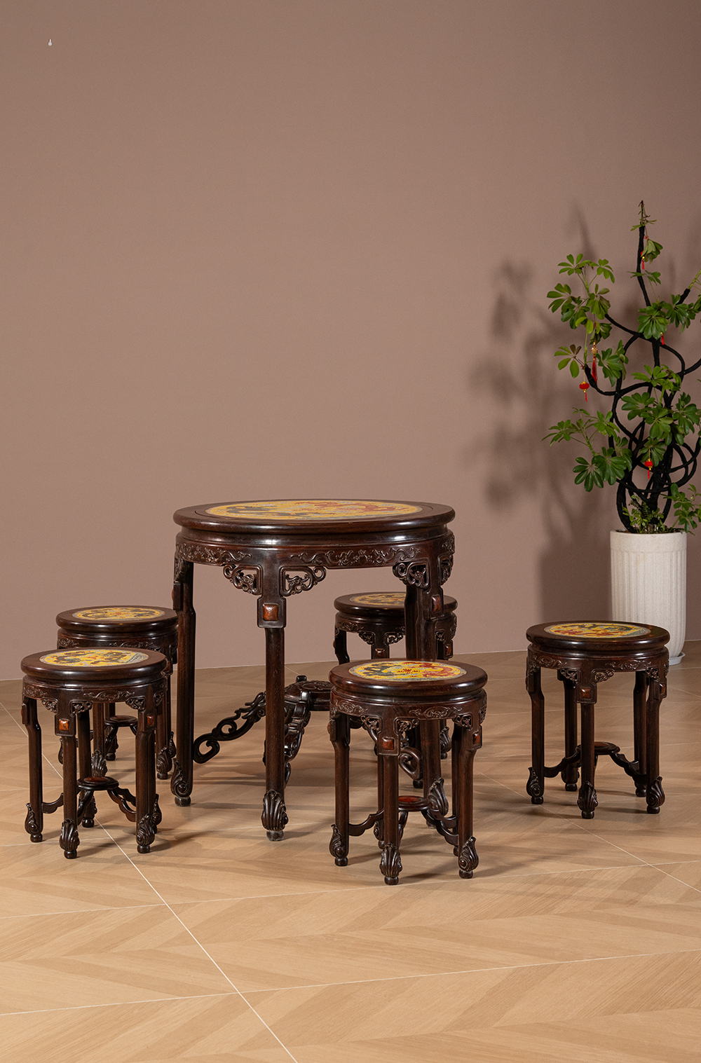 二十世纪 红木镶粉彩瓷板双龙戏珠圆台圆凳成套(一桌五凳)