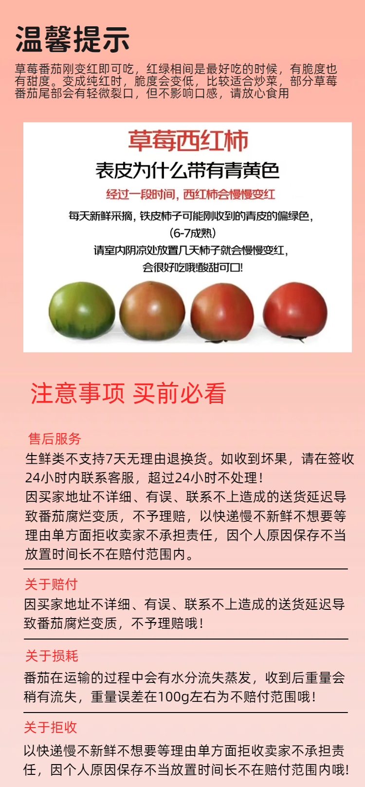 ③生鲜果蔬产品不支持退货退款,收到货后有任何质量问题,在12小时之内拍照联系客服进行售后理赔(提供快递单+包装箱+坏果图),售后方式按比例赔付(赔付金额=付款金额/产品总个数*坏果个数)。感谢您的信任,祝您购物愉快!