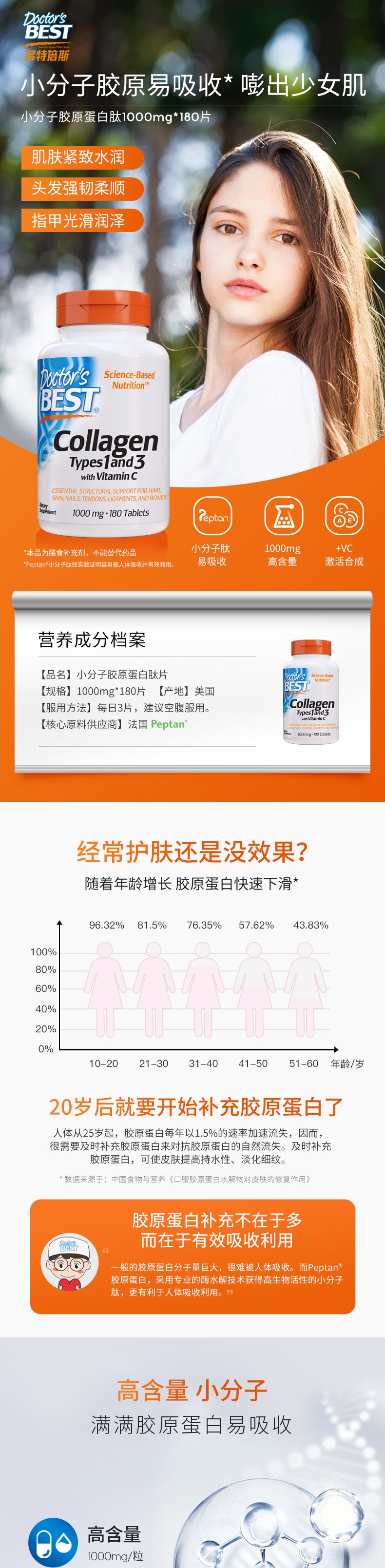 【胶原蛋白补充】水解胶原蛋白1型3型180颗片剂 【Doctor's Best多特倍斯】适用皮肤暗沉和皱纹增加 紧致嫩肤 护发养发 关节炎【下单后不可退货/退款】