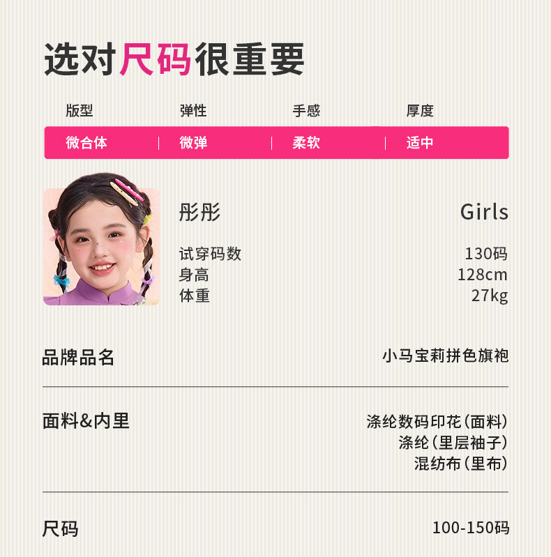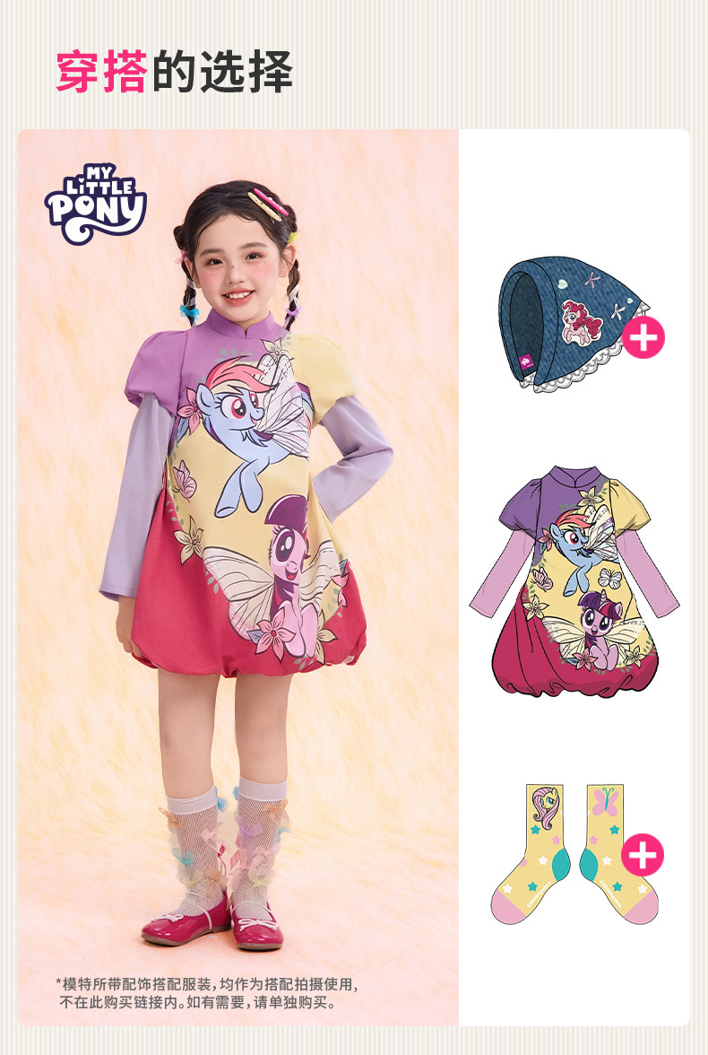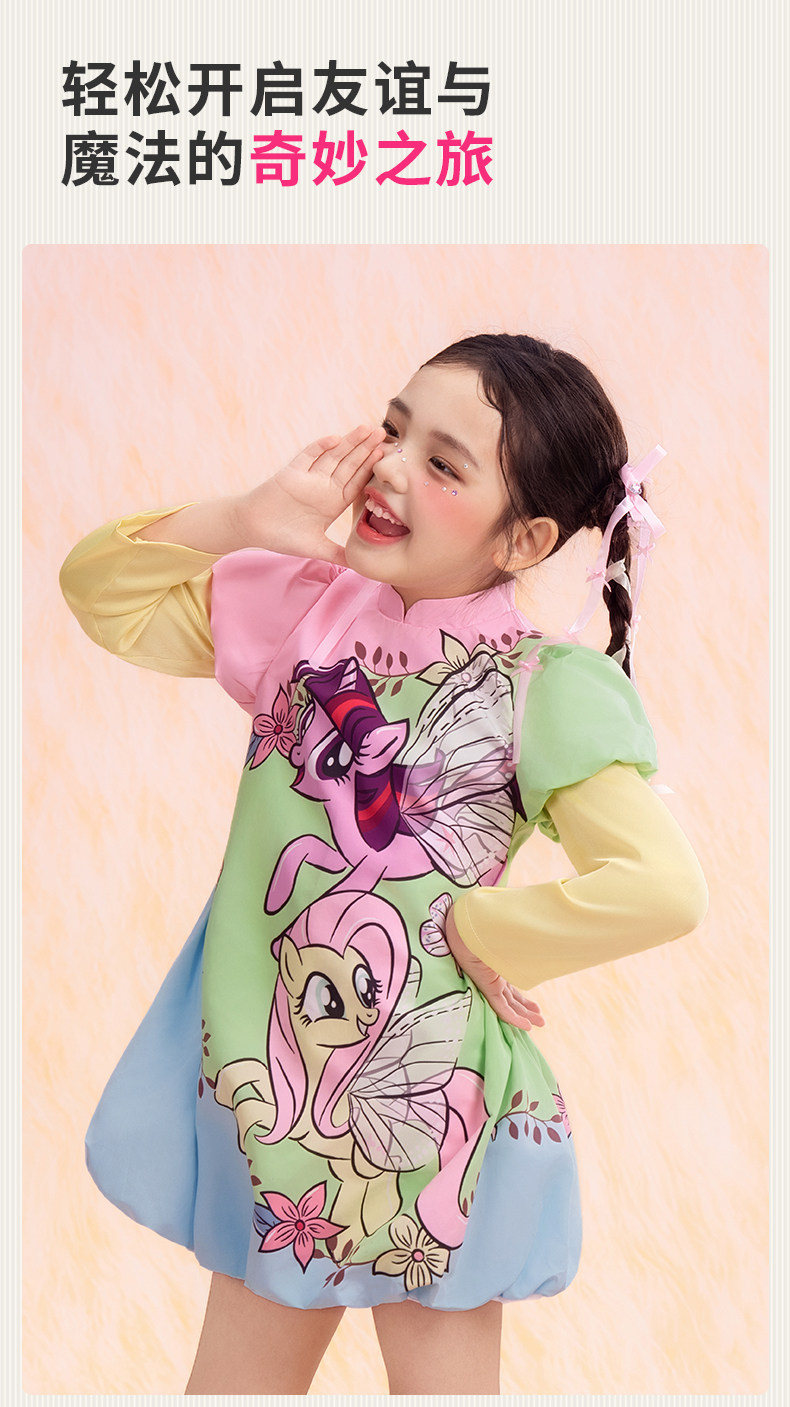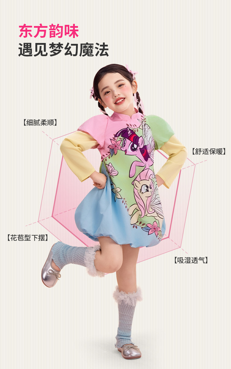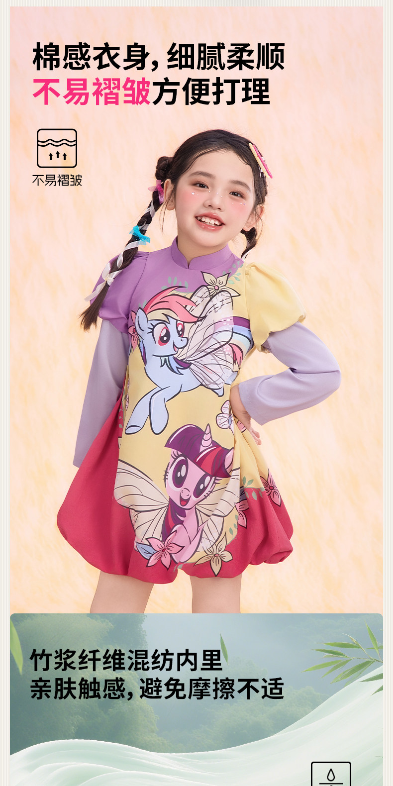 小马宝莉联名年衣童装拼色旗袍女孩春新款泡泡袖小马宝莉拼色旗袍N1261006D04