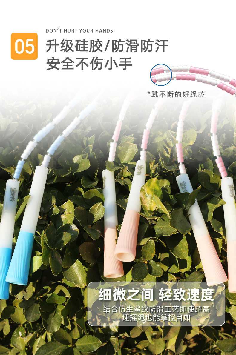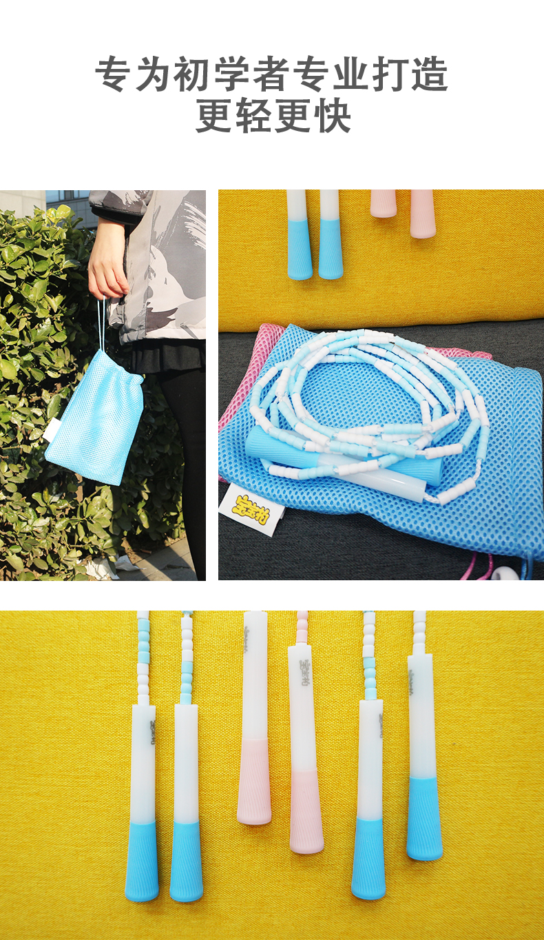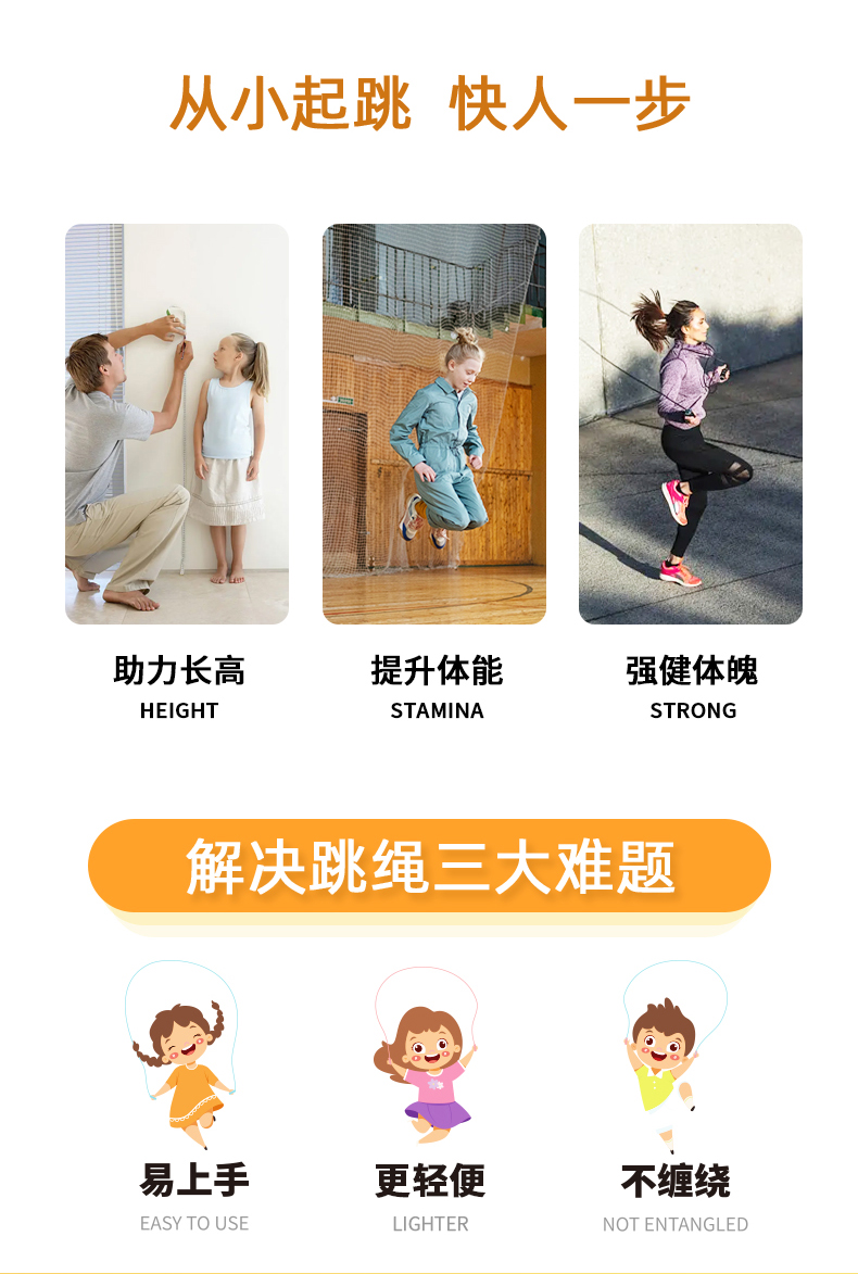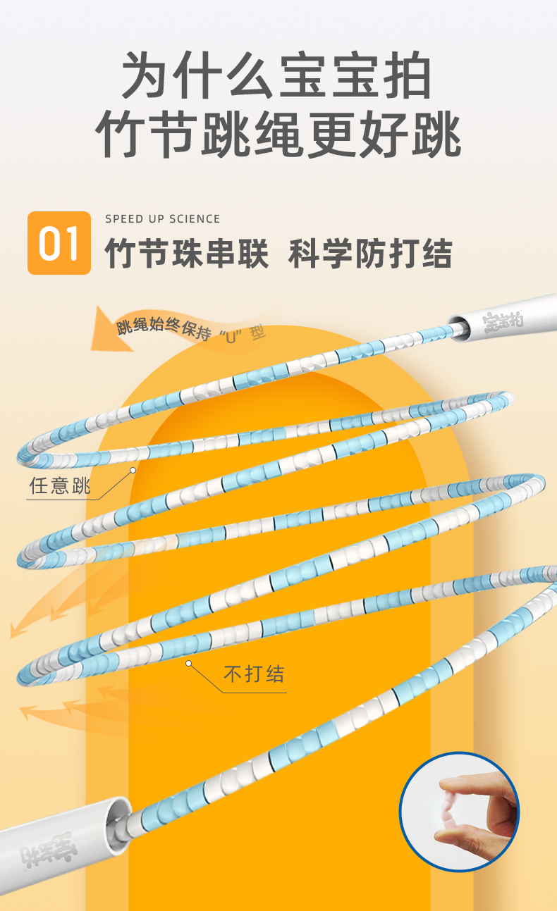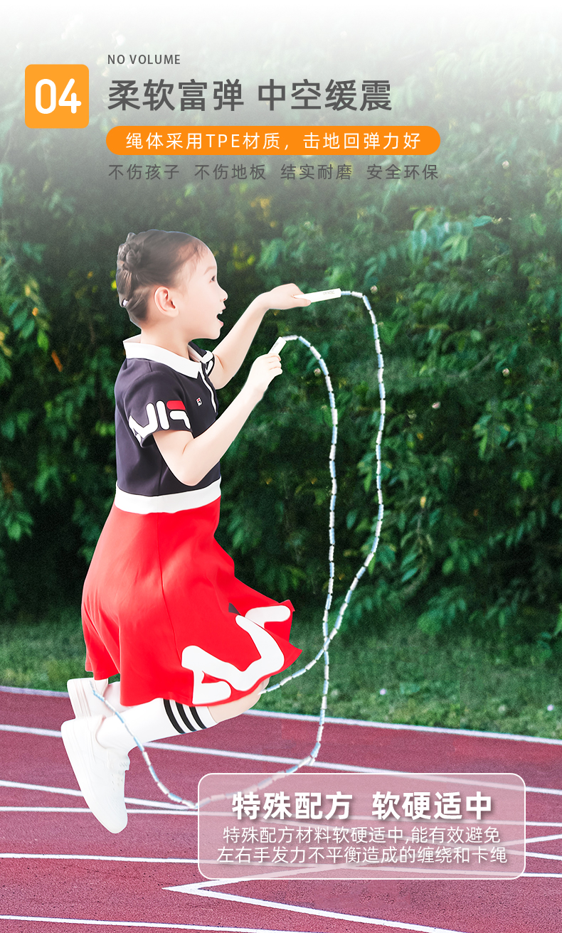 采用竹节结构设计,有效防止儿童受伤,适合初学者;不易缠绕,适合花式跳绳