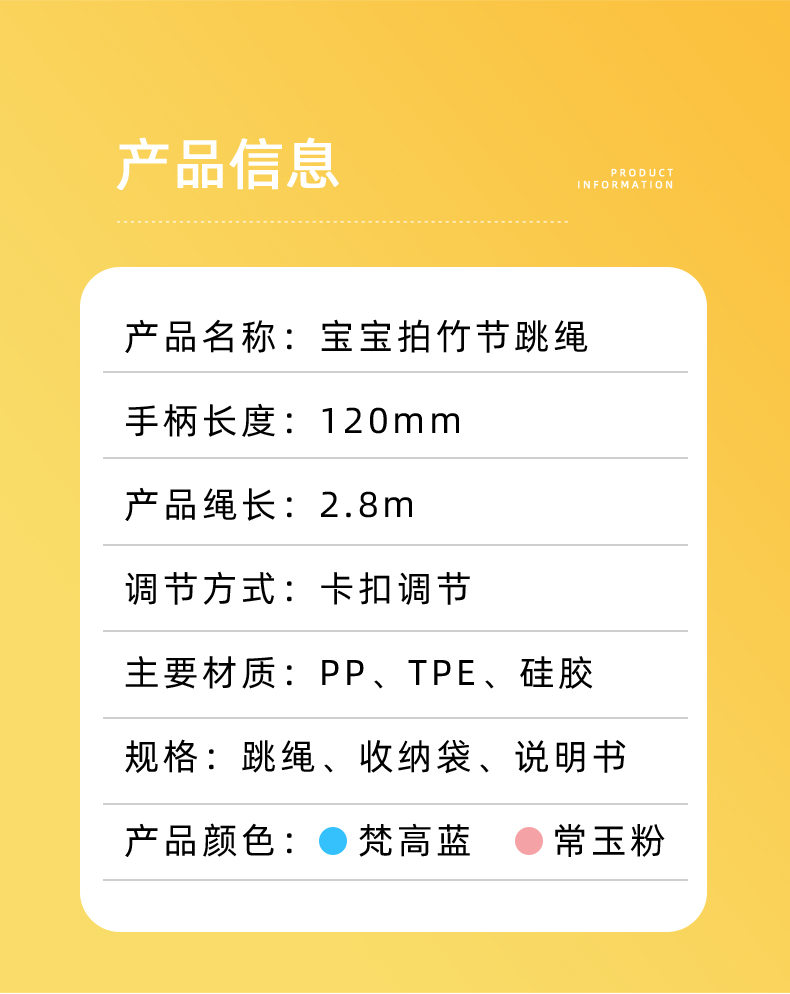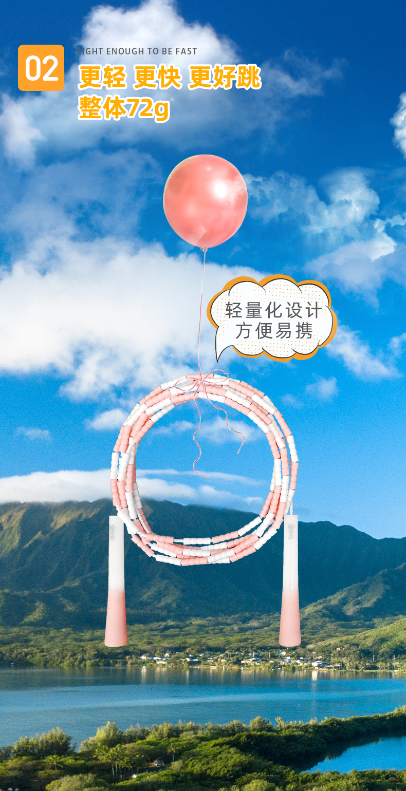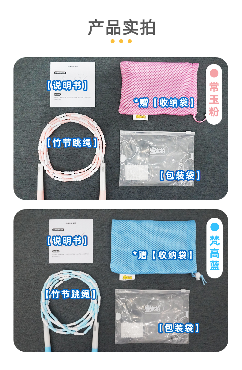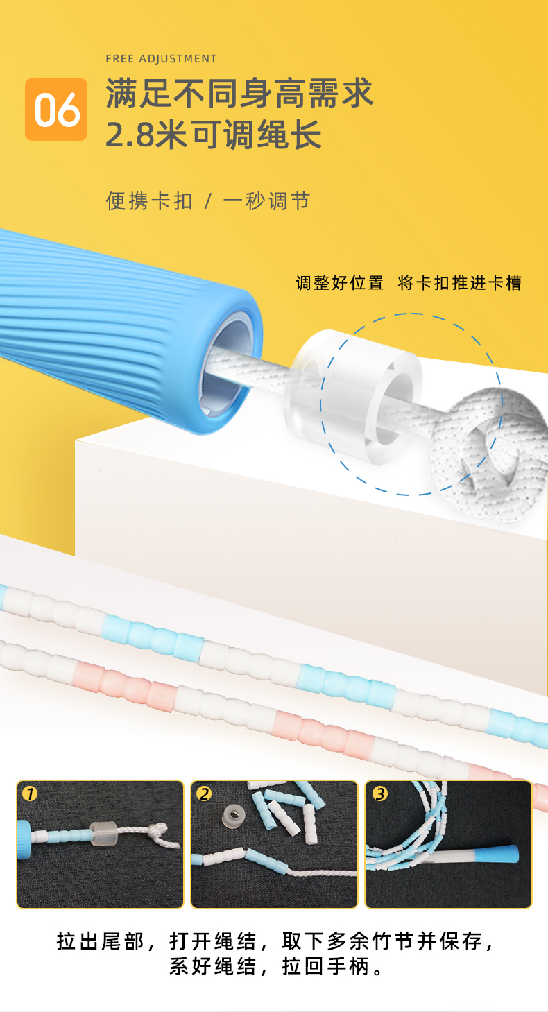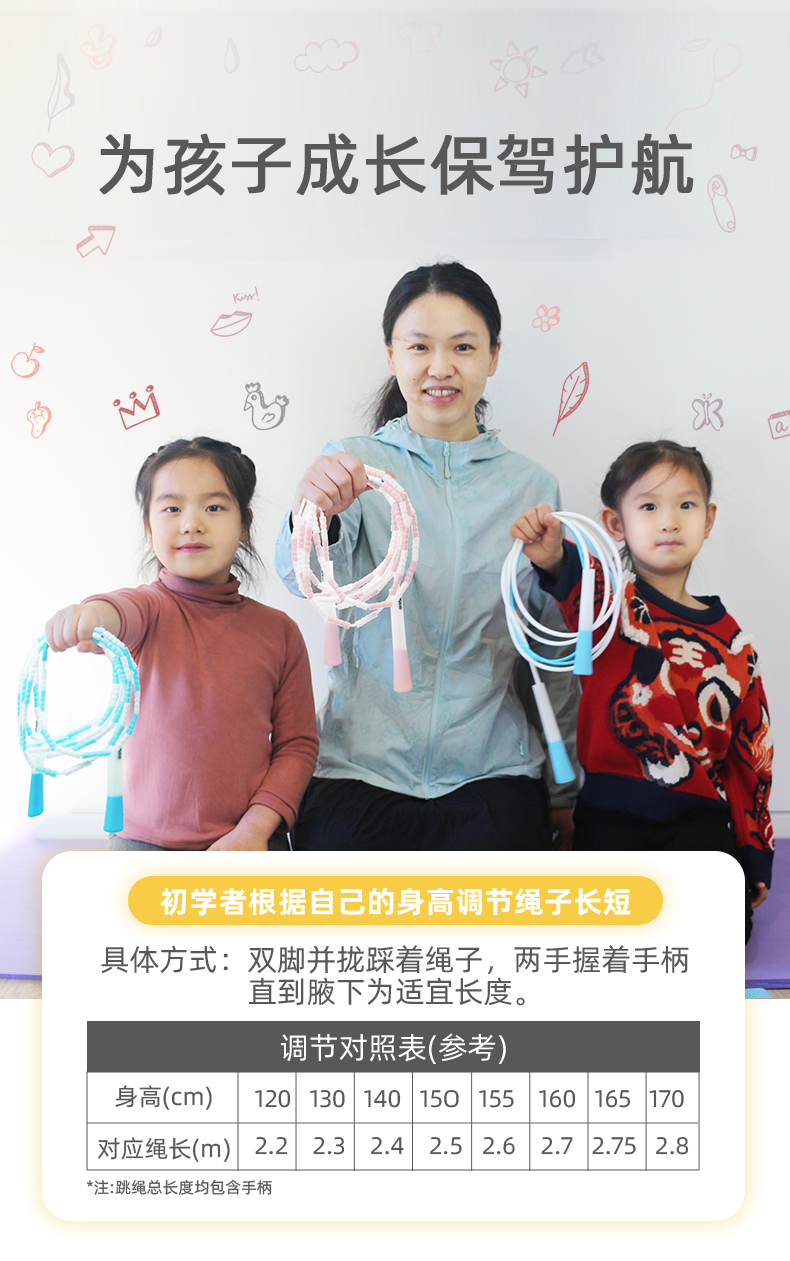 采用竹节结构设计,有效防止儿童受伤,适合初学者;不易缠绕,适合花式跳绳