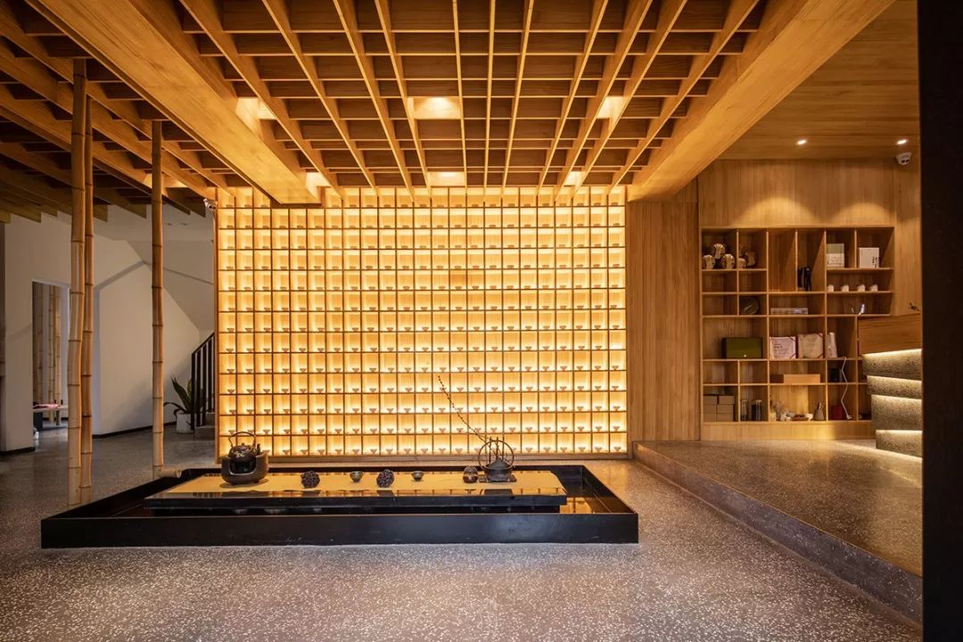 “重逢楼”白色镂空的建筑外观充满了现代艺术感,走进大厅,却是“竹林流水”的中式意境,还有随处可见的茶元素。