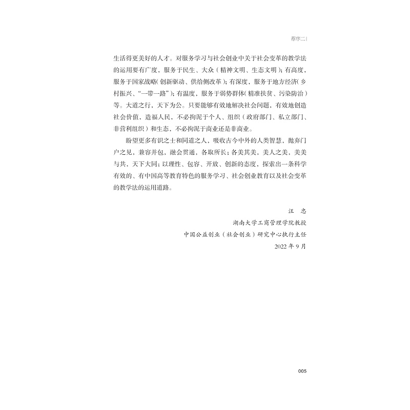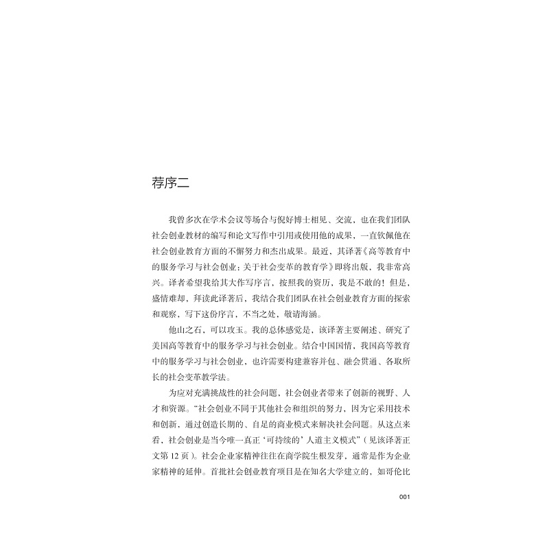 《高等教育中的服务学习与社会创业:一种社会变革的教育学》一书主要内容包括社会变革教育的全景展示、参与教学的组织、社会服务学习和社会创业教育的挑战、参与式教育的转机等内容。本书主要揭示了社会创业与服务学习的异同、美国高校如何推进社会创业教育和服务学习的融合以及该领域的经验和教训等。本书对我们国家这方面的改革具有重要的借鉴意义。本书是教育学和社会创业方面的结合研究,具有一定创新性,是目前研究的前沿领域。
