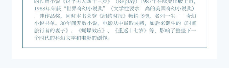他的长篇小说《这个男人四十三岁》(Replay)1987年在欧美出版上市,1988年荣huo“世界奇幻小说奖”(文学性要求zui高的美国奇幻小说奖)zui佳作品奖, 在距离shou次出版20年后,《这个男人四十三岁》再度荣登《纽约时报》畅销书榜。20年间无数小说、电影从中汲取灵感,如后来诞生的《时间旅行者的妻子》、《蝴蝶效应》、《重返十七岁》等,影响了整整下一个时代的科幻文学及电影的创作。