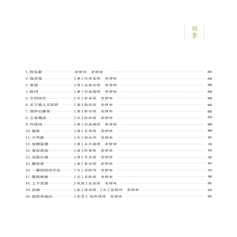 中国的传统文化经历了岁月的考验和提炼,留下来很多精华,闪耀着民族智慧与民族精神的灿烂光芒,古诗词就是其中的代表。本书是由德国籍作曲家老锣根据中国古诗词谱曲的合唱作品集。书中有《春晓》《花非花》《登鹳雀楼》《静夜思》等20首作品,用简谱和五线谱两种方式呈现,同时增加“中国乐理”“有邻说诗”“演唱提示”“作曲家说”这四个文字内容。作品集中将有龚琳娜的伴奏音频及演唱音频,以便读者更好地使用。此书出版将有利于弘扬传统文化,通过音乐,把优秀传统文化一代代传承下去。 |