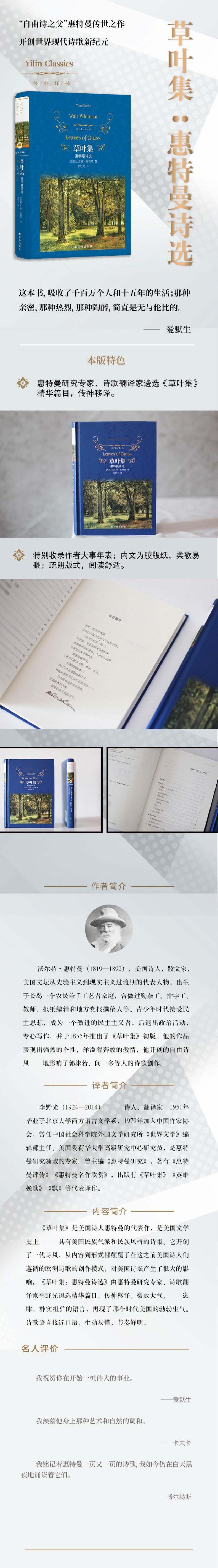 这本书,吸收了十五年的生活;那种亲密,那种热烈,那种陶醉,简直是无与伦比的。—— 沃尔特·惠特曼