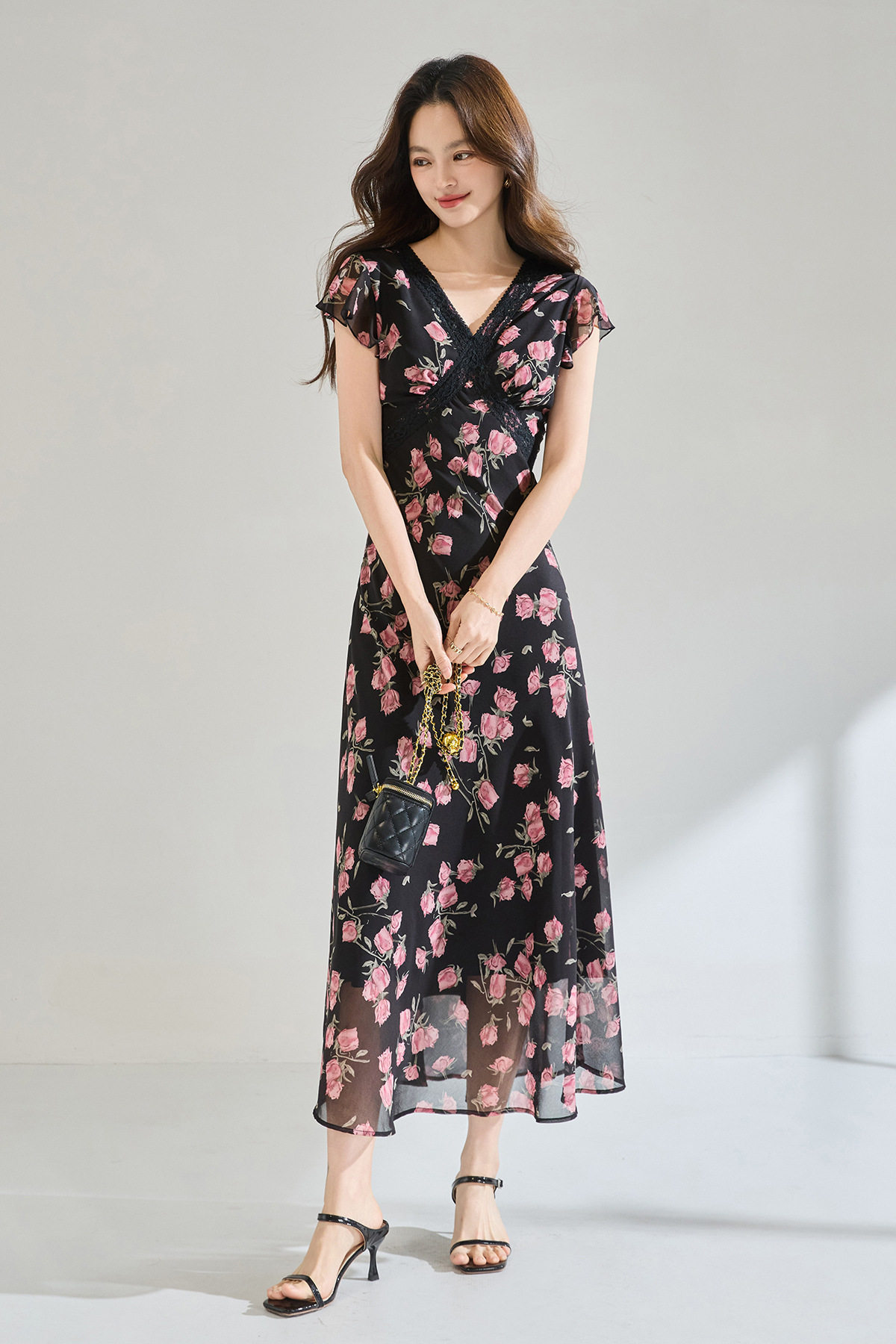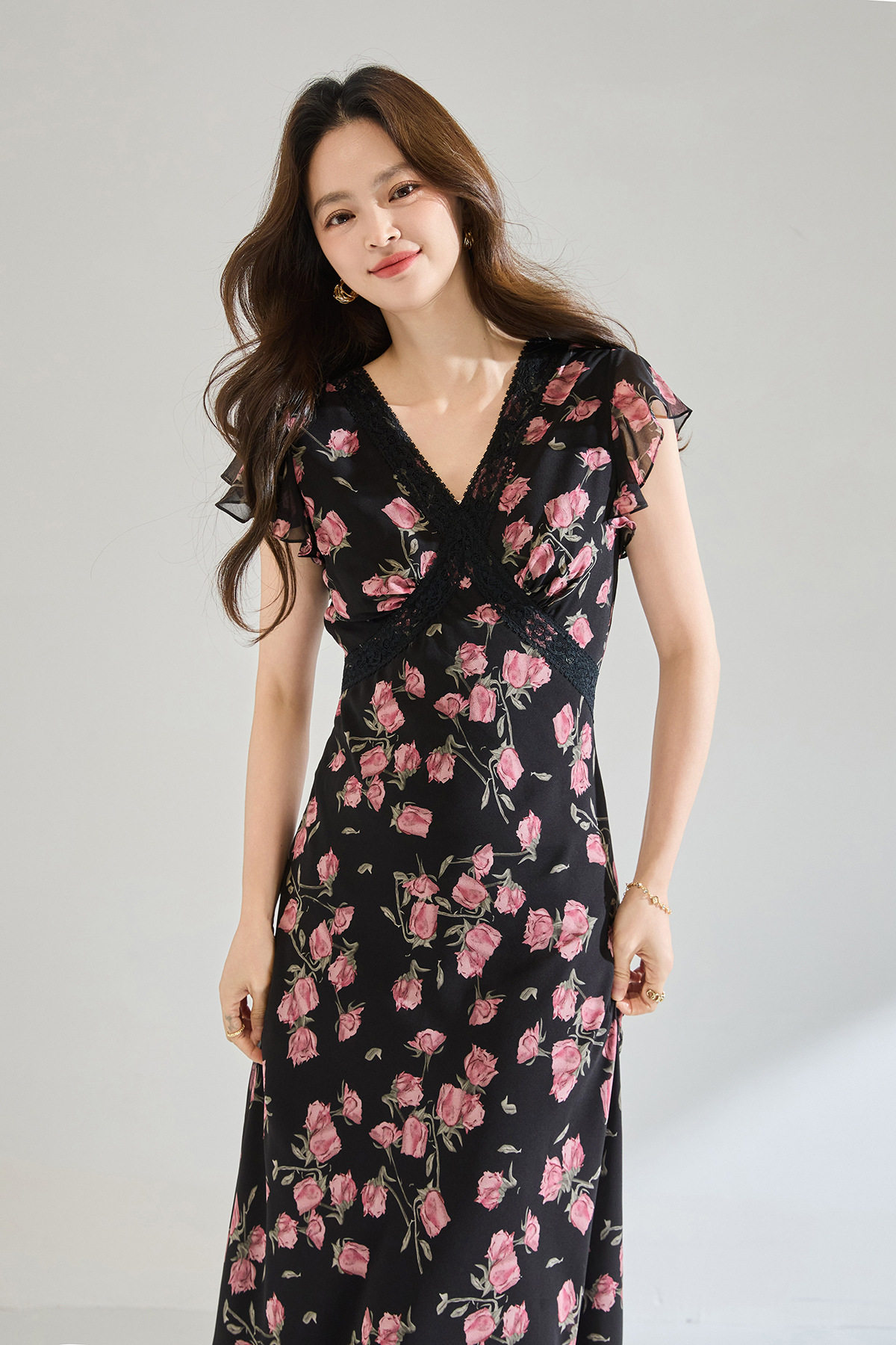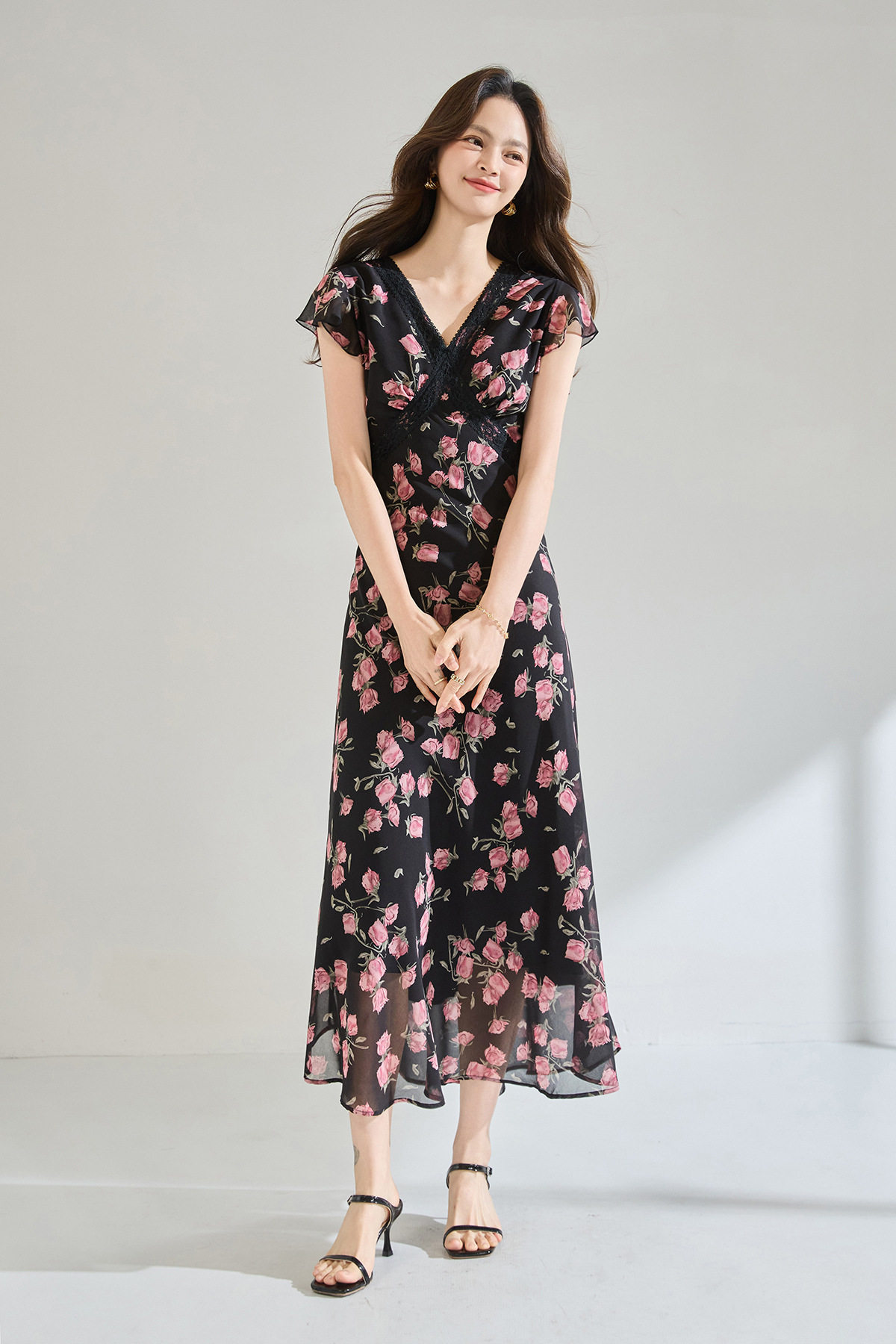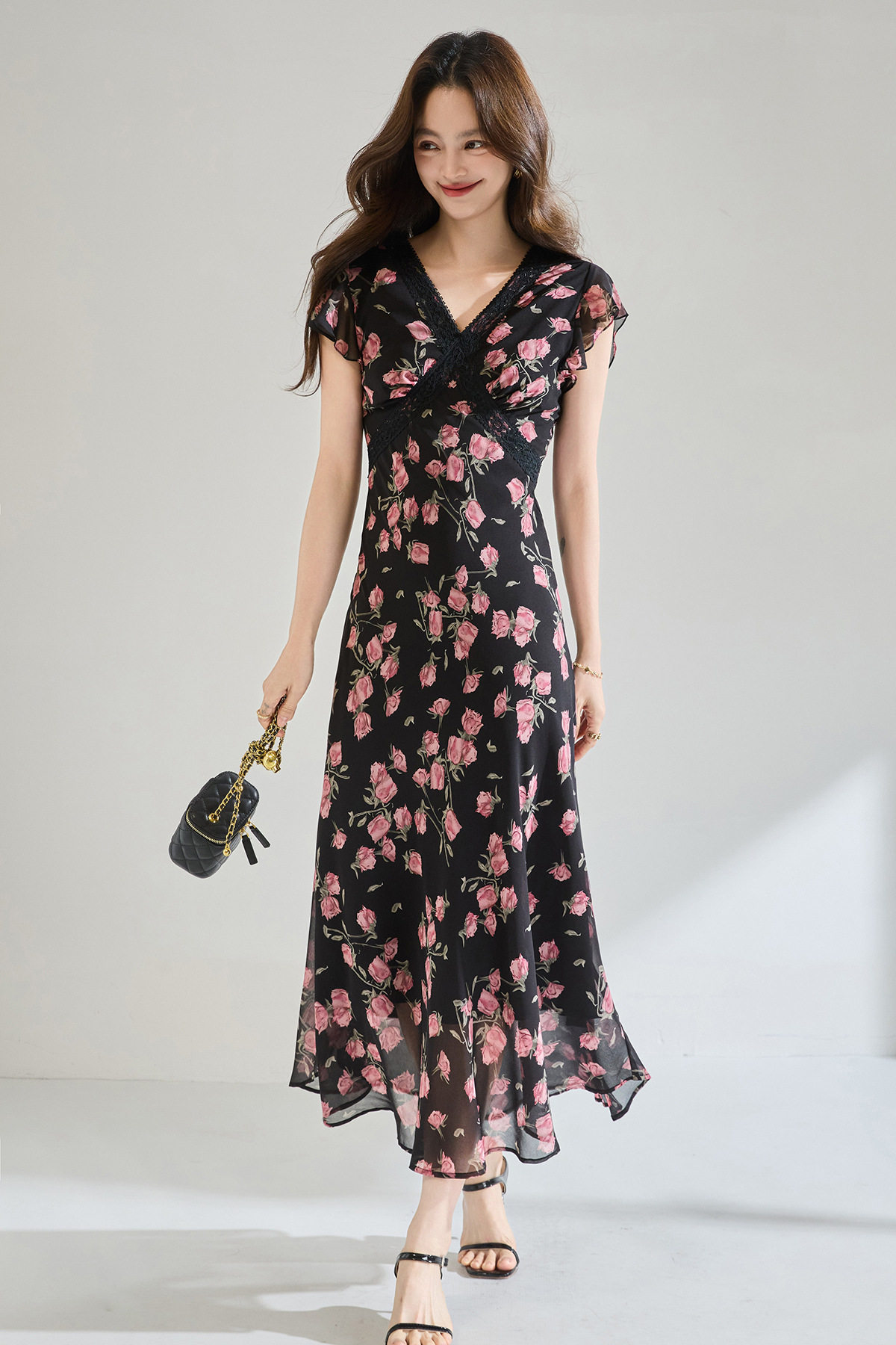 「高货sh」全新升级【铂金会员275/天猫369/差价94】(12409)洛诗琳玫瑰印花雪纺连衣裙2026法式蕾丝花边V领收腰显瘦裙