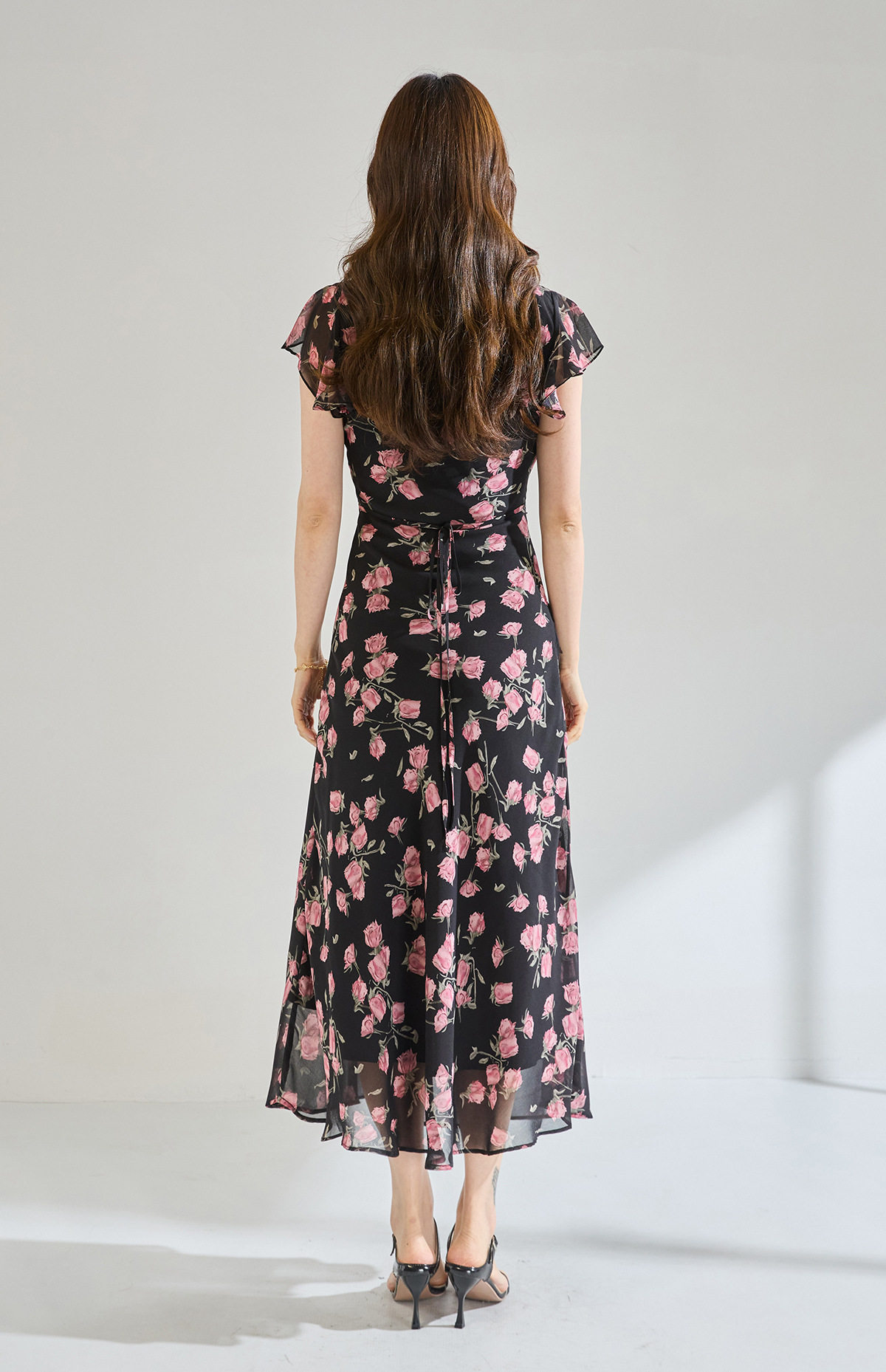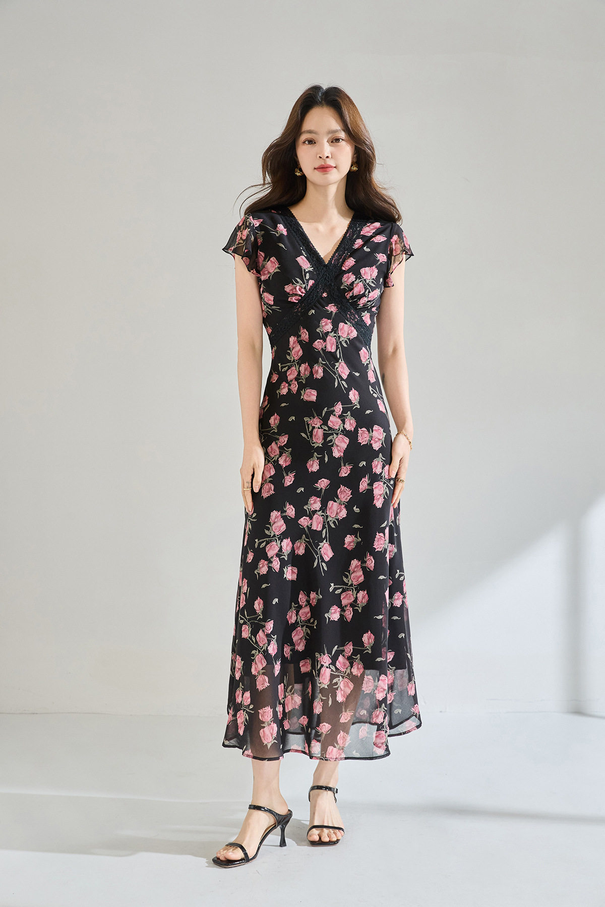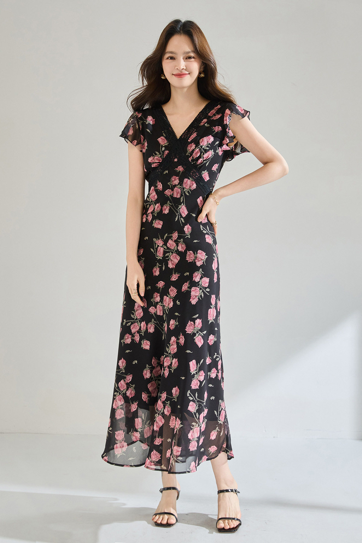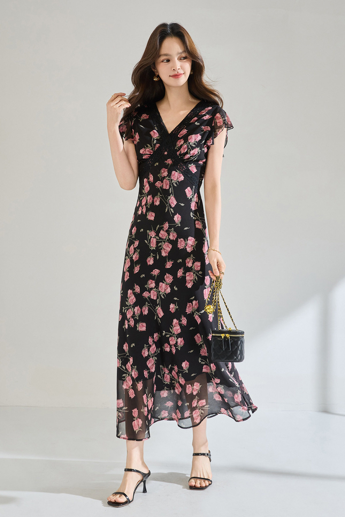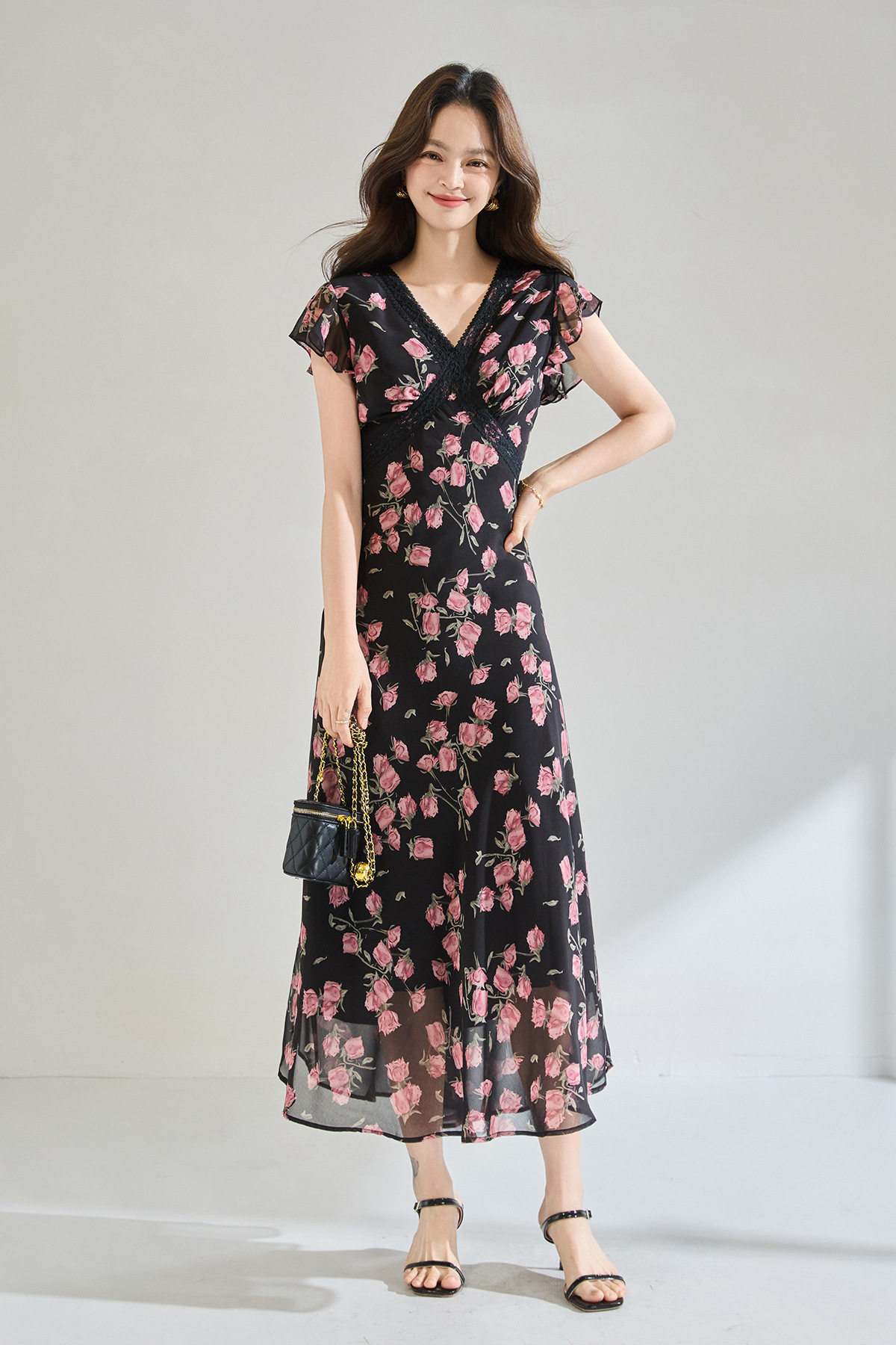 「高货sh」全新升级【铂金会员275/天猫369/差价94】(12409)洛诗琳玫瑰印花雪纺连衣裙2026法式蕾丝花边V领收腰显瘦裙
