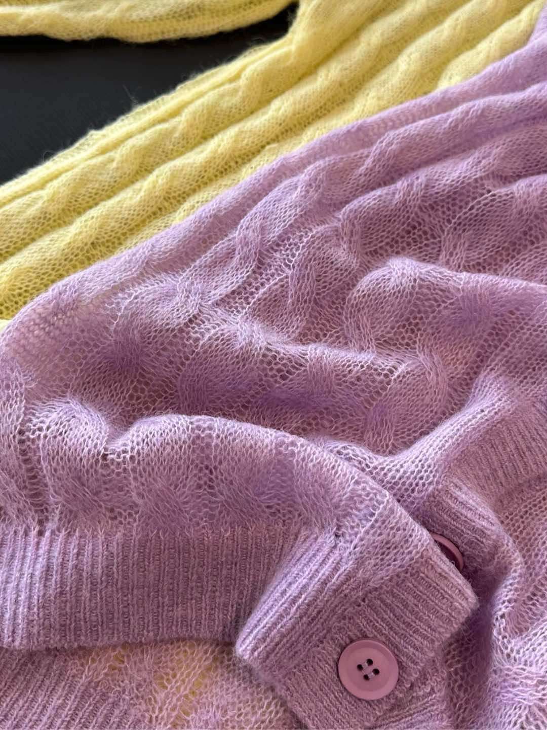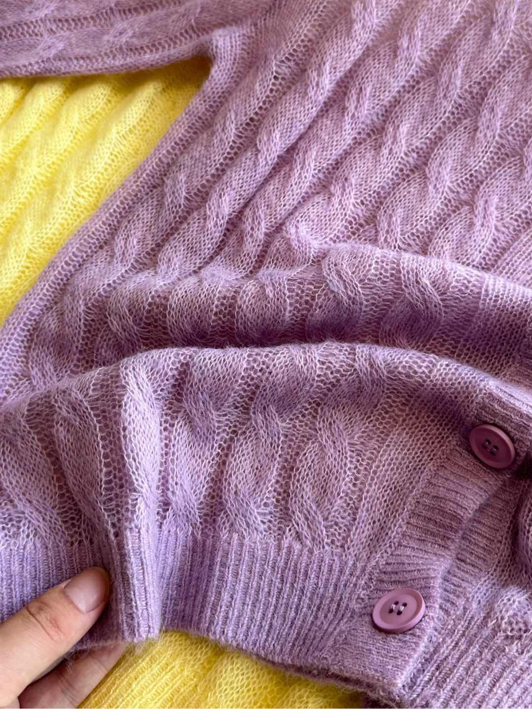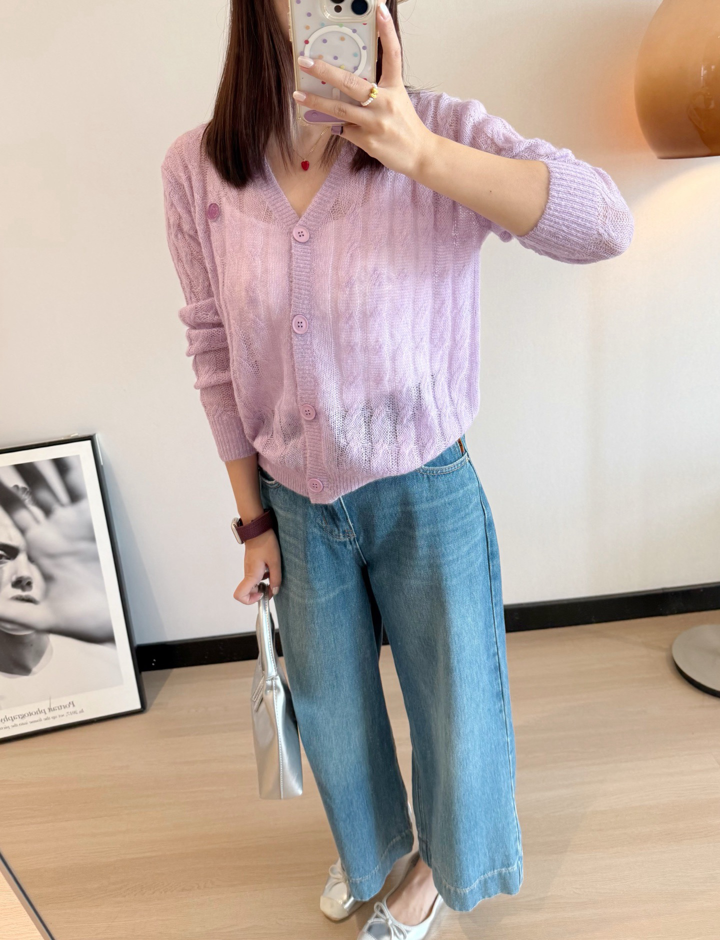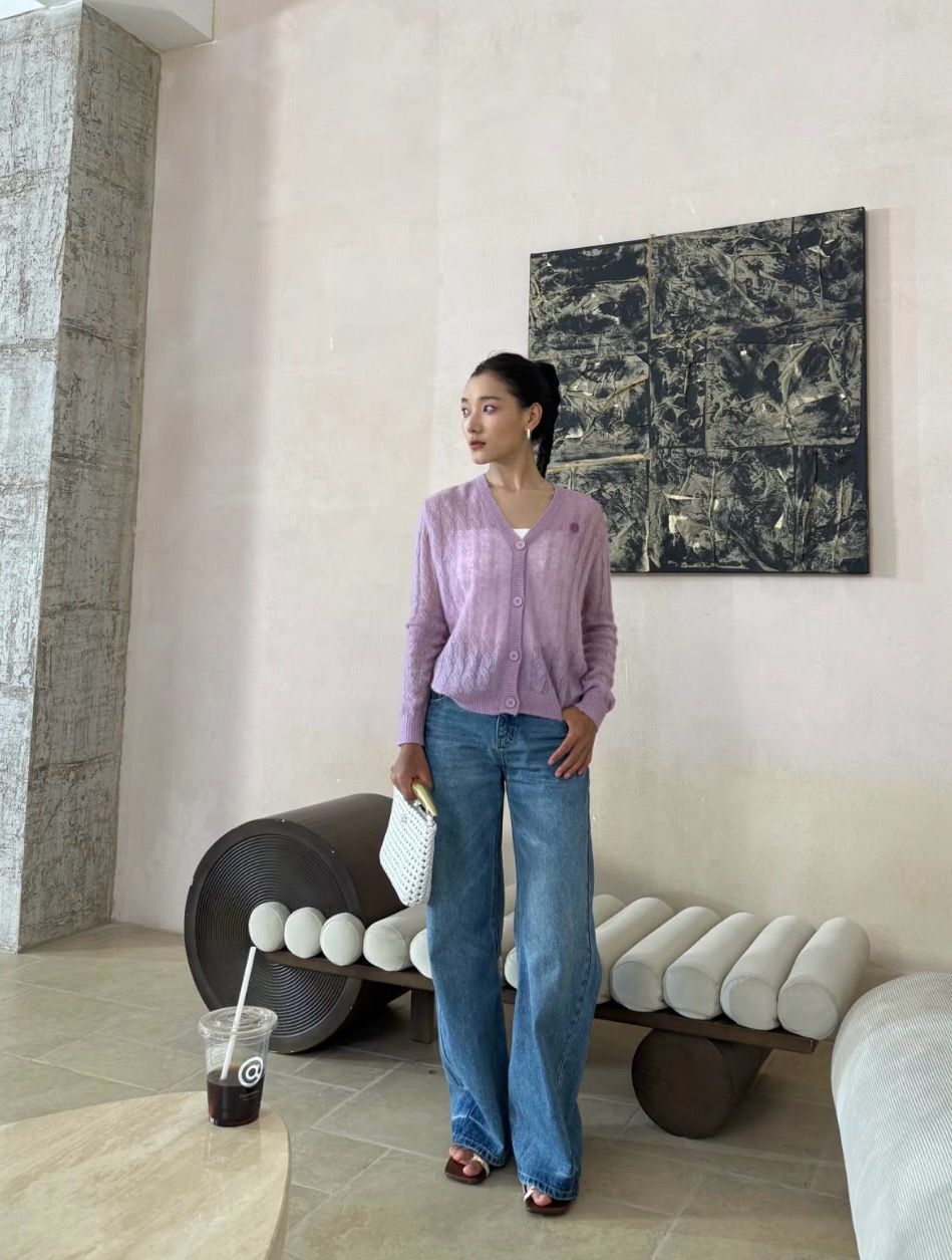 仿佛第二层皮肤般,温柔地贴合每一寸皮肤,上身几乎感觉不到任何重量,每一针镂空纹理都均匀细腻,既有规律又带着手工温度,呈现若隐若现的朦胧微透感。温温柔柔的香芋紫,不挑人,对各种肤色和各种搭配的适配度99.99%