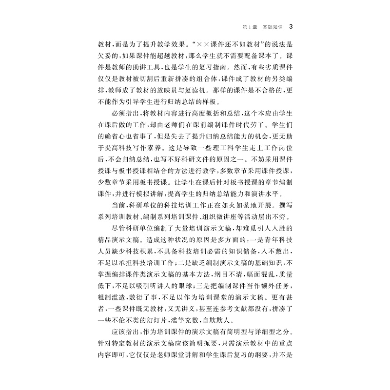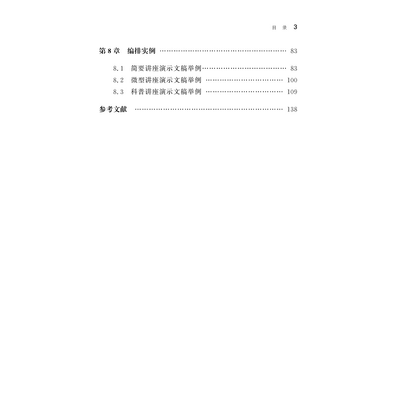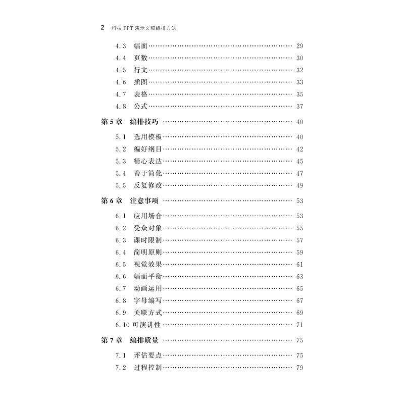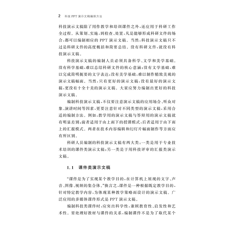 本书介绍用于科技汇报、学术交流或技术沟通等场合的科技PPT演示文稿技术内容的编辑与排版方法。书稿分析了科技演示文稿的存在问题,阐述了科技演示文稿的编排原则、要素编排、编排技巧、注意事项和编排质量。书中还提供了三个不同类型科技演示文稿的编排实例。本书可作为科研人员编制科技PPT演示文稿的参考文献,也可作为在读研究生编排学位论文答辩PPT演示文稿的参考资料。