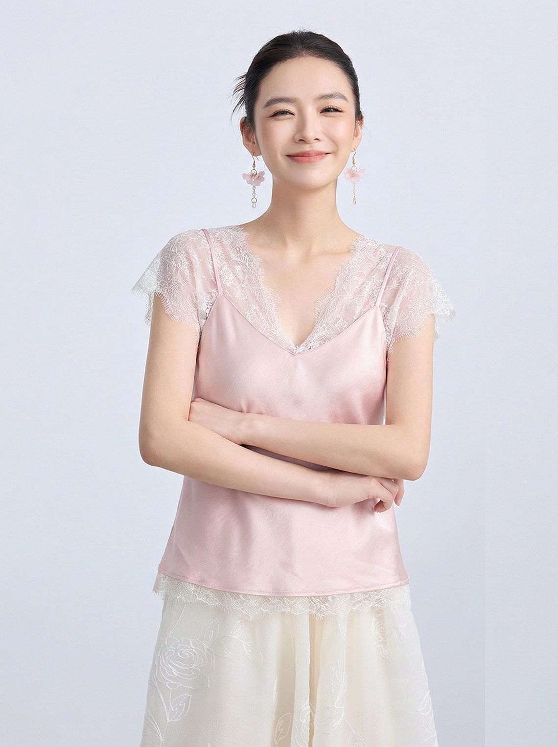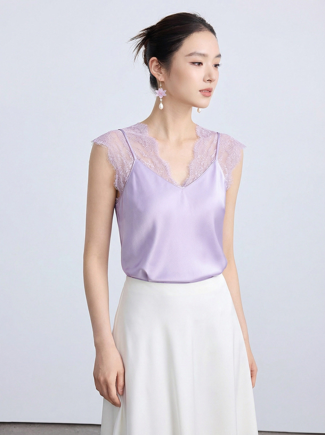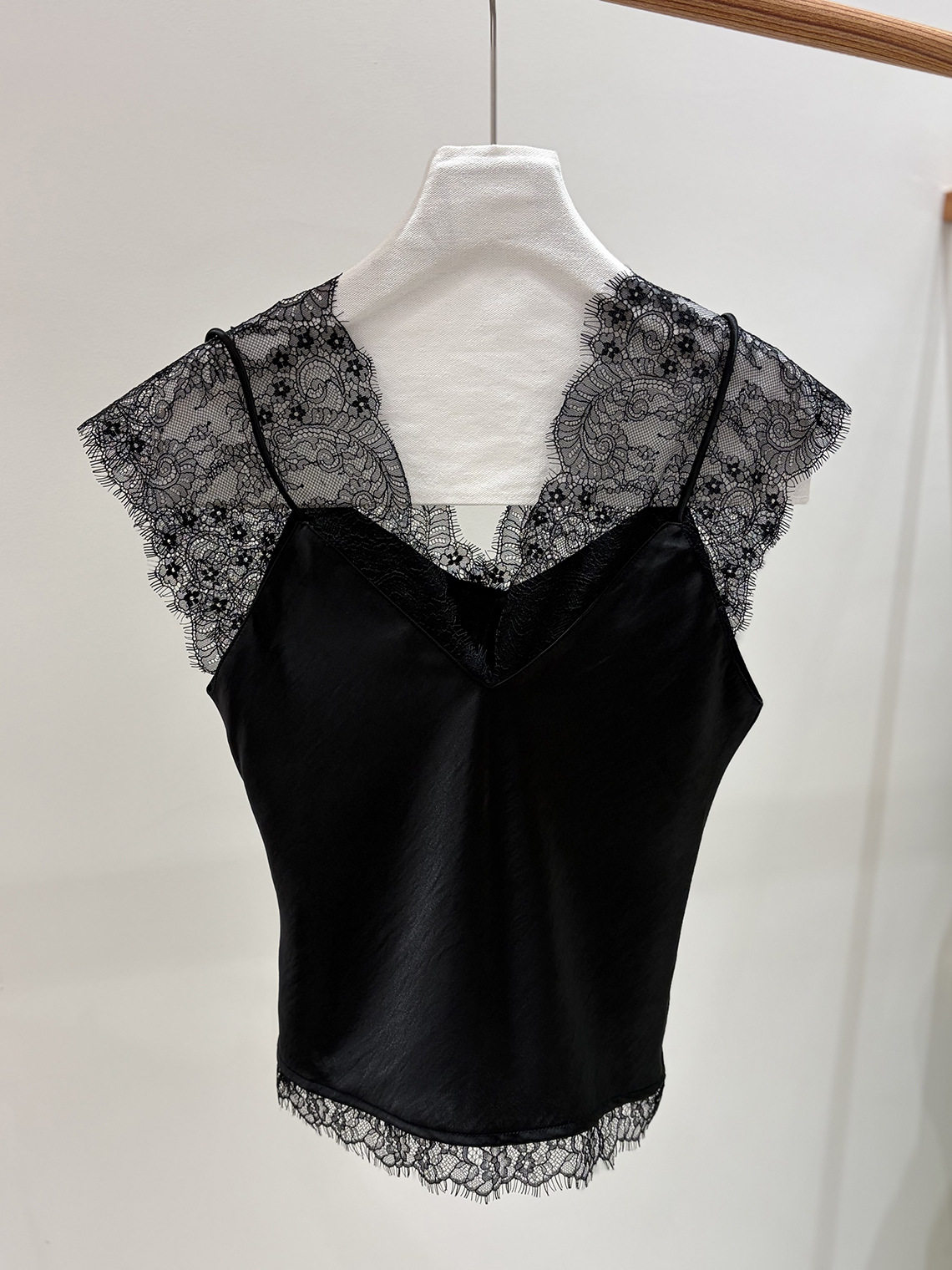 「自」全新升级【铂金会员146/天猫199/差价53】(13606)洛诗琳气质V领蕾丝背心2026夏季新款仿真丝修身显瘦打底上衣