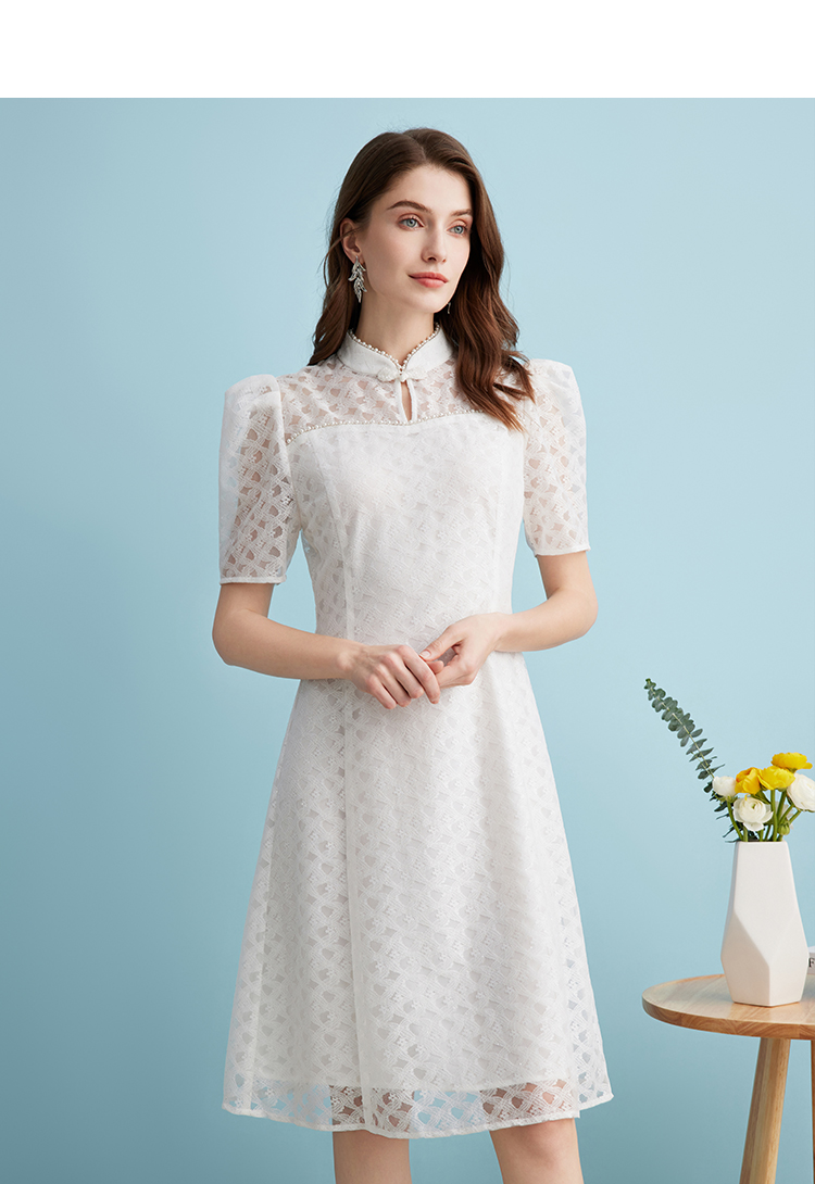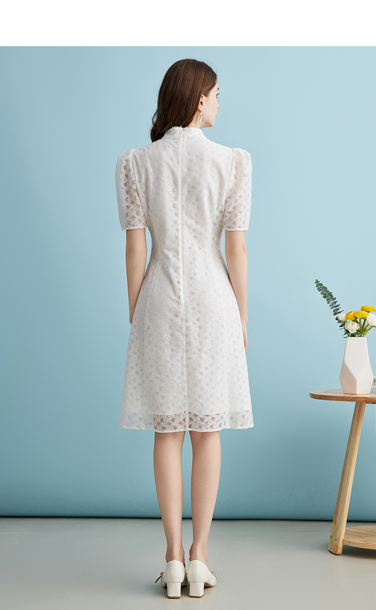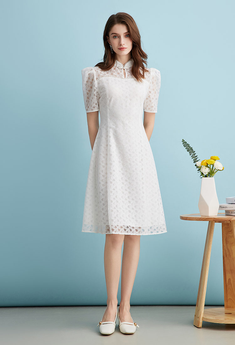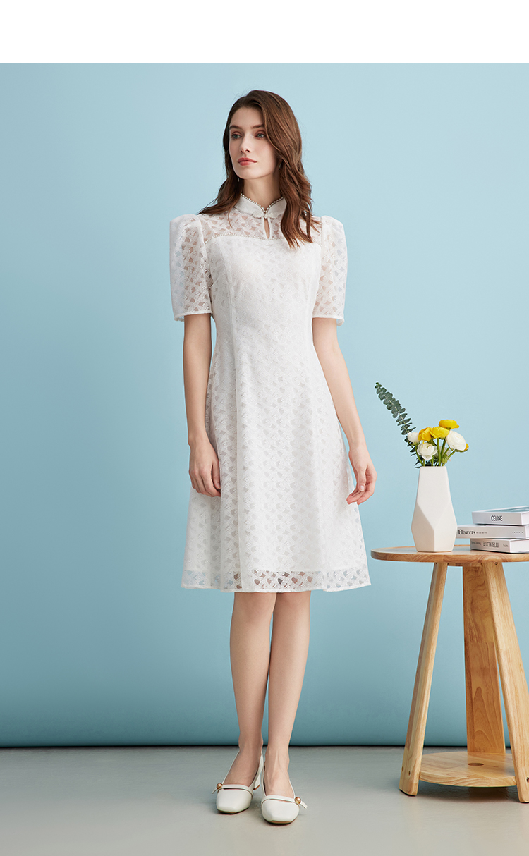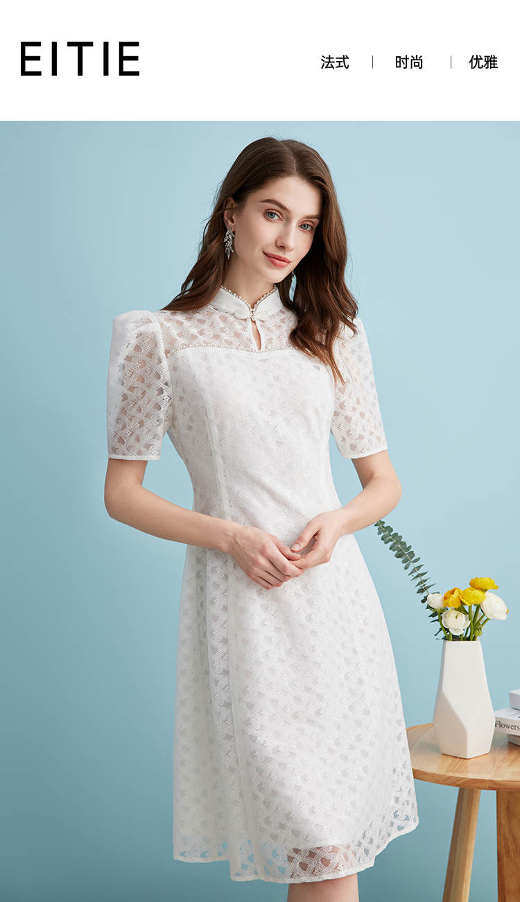 EITIE爱特爱温柔小白裙新中式立领盘扣泡泡袖连衣裙夏季新款B2407326