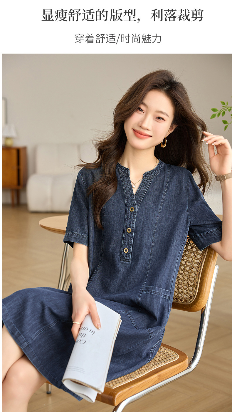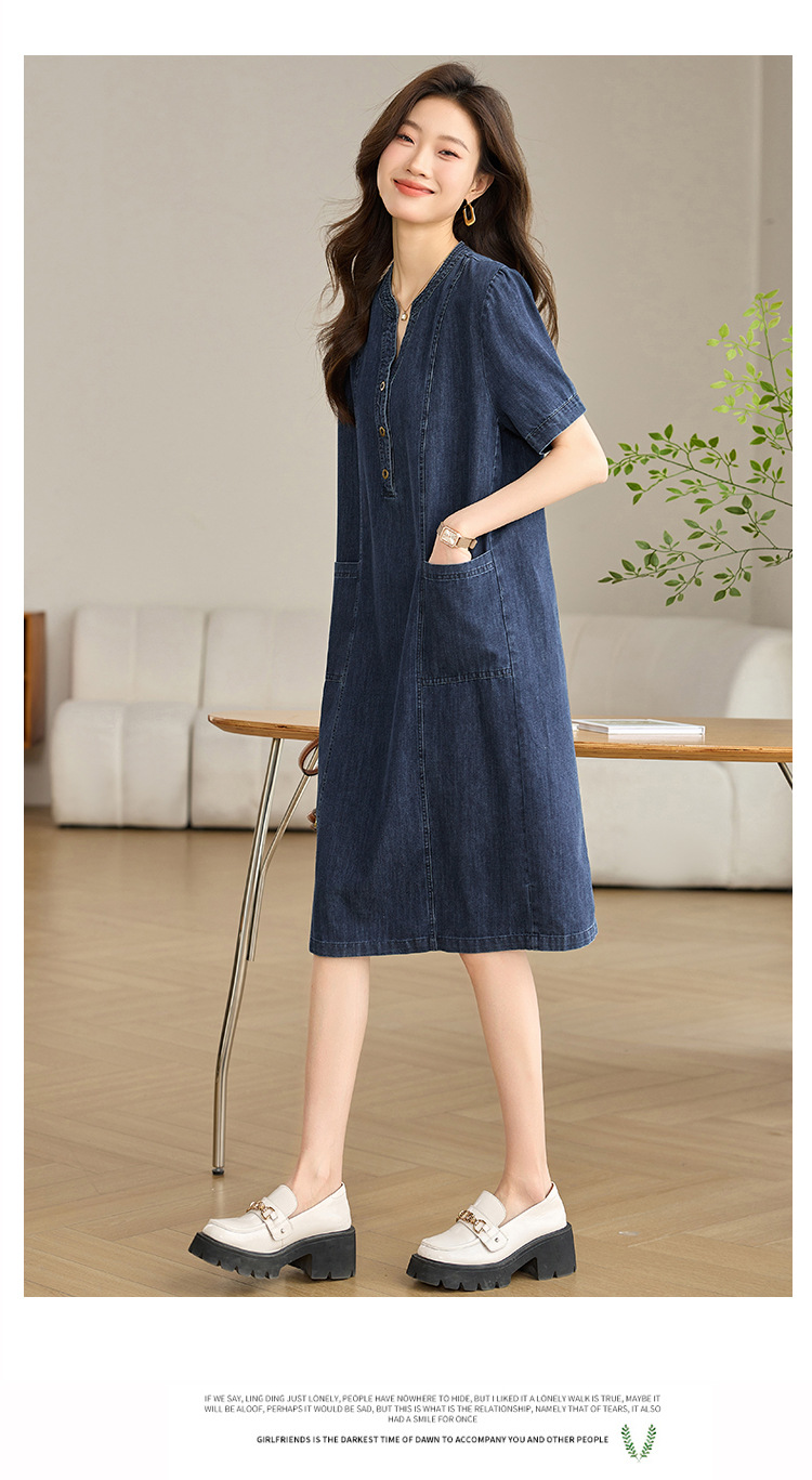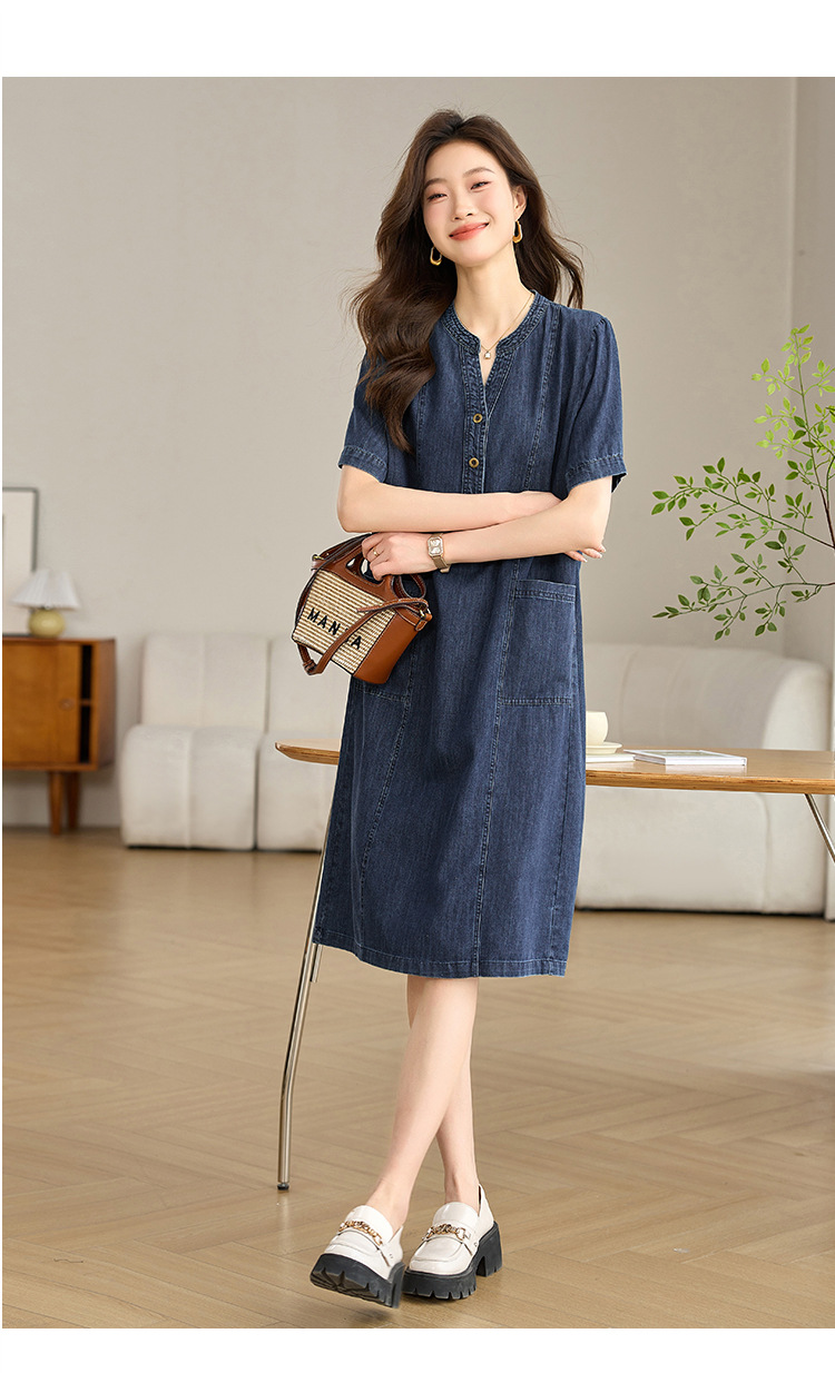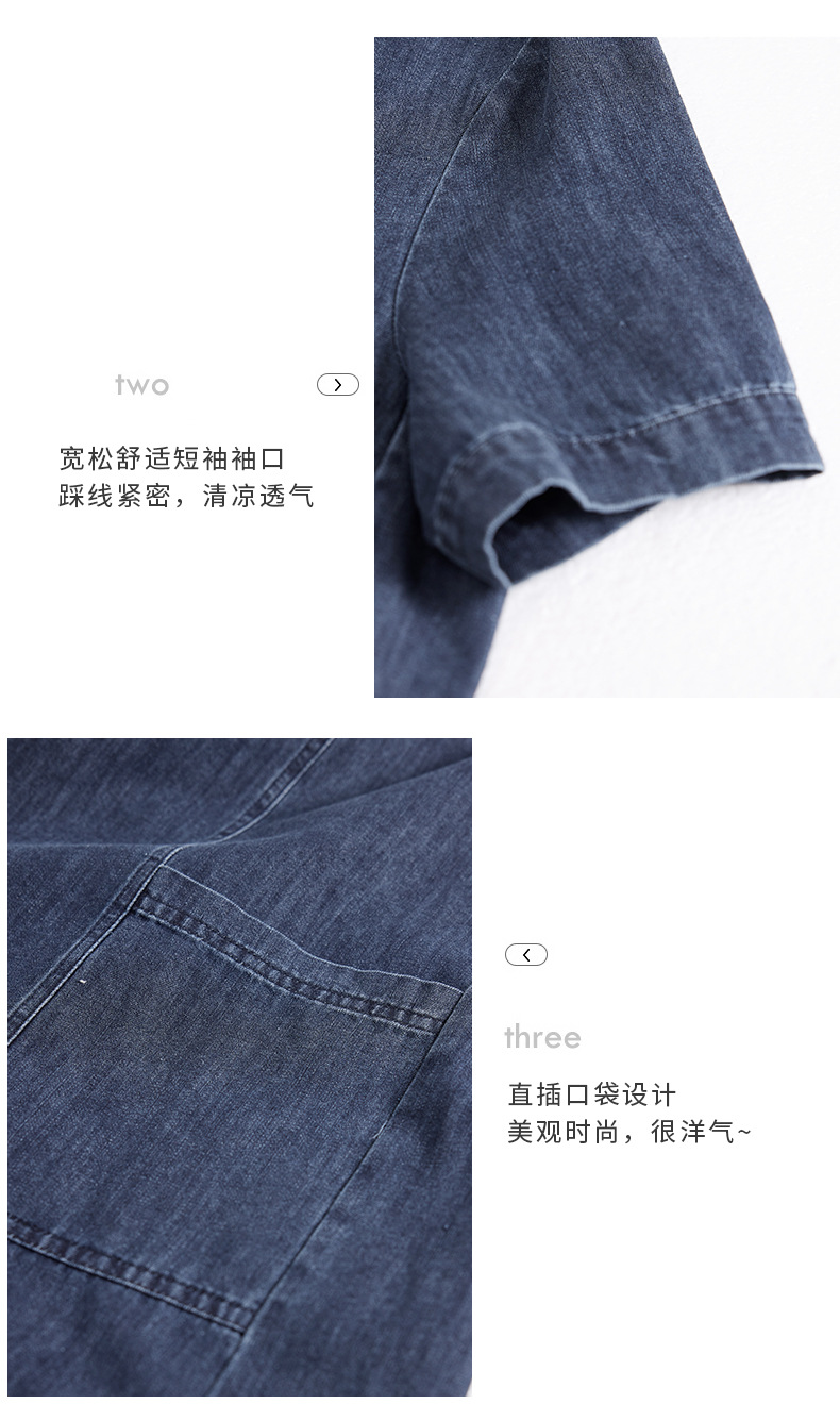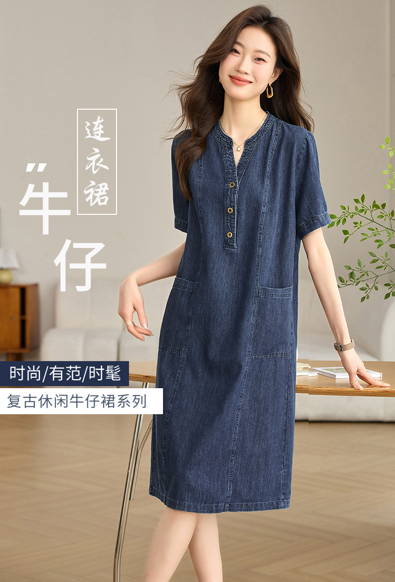 丁摩 复古薄款短袖牛仔连衣裙女夏季新款宽松显瘦遮肉休闲直筒裙子5ZF-8566