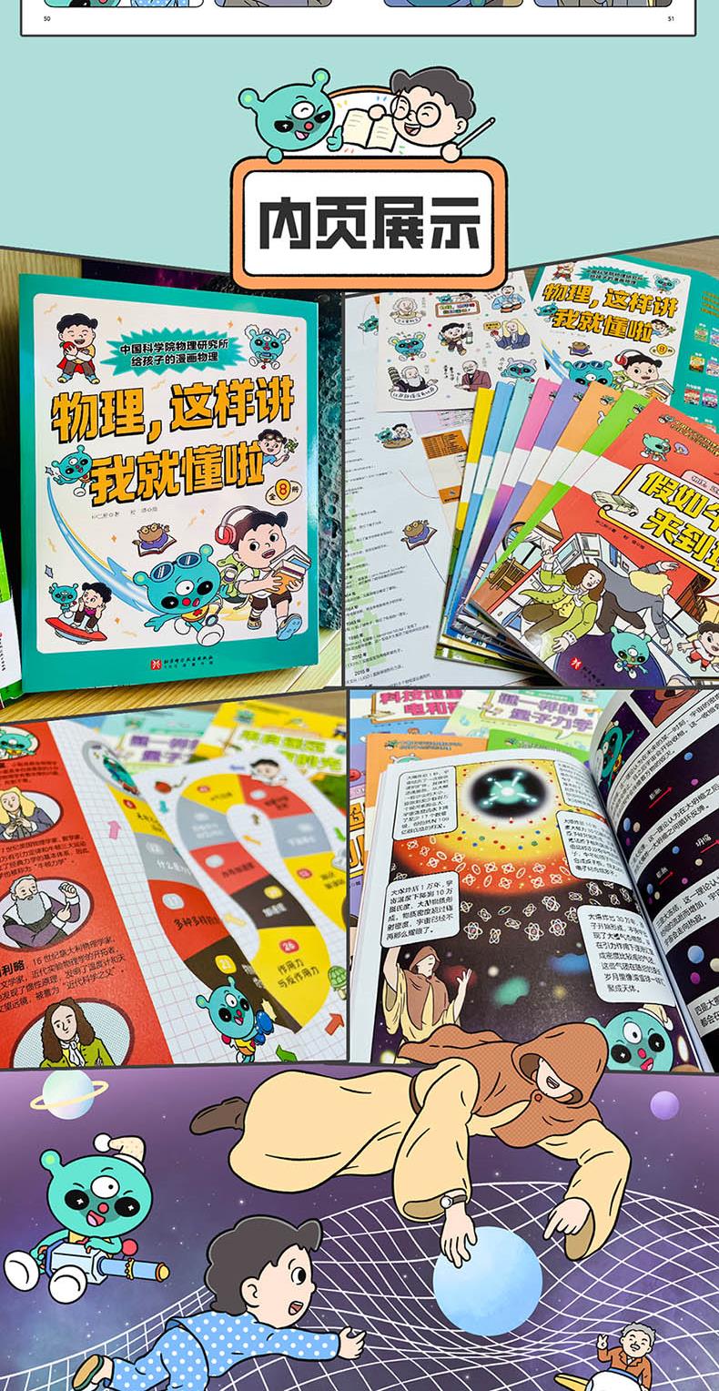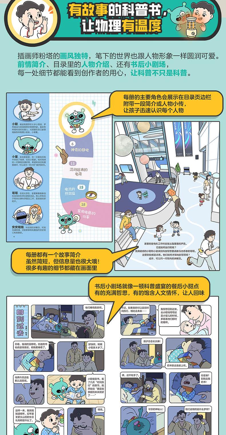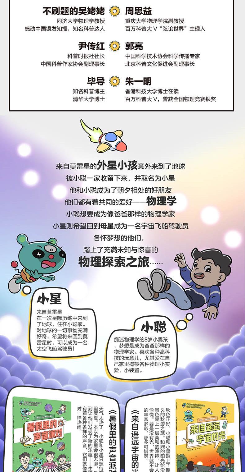这是一套由中科院物理所联合知名青年插画师粉塔共同创作的给7-12岁孩子讲解物理知识的科普漫画,共8册,涵盖物质、声、光、热、电磁、力、相对论和量子力学8大主题,兼顾经典物理和前沿科学,100个知识点紧扣新课标教材,用代入感强的生活场景和轻松有趣的故事情节,为孩子讲解生活中的物理现象。来自莫雷星的外星小孩意外来到了地球,被小聪一家收留下来,并取名为小星。他和小聪成为了朝夕相处的好朋友,而且他们都有着共同的爱好——物理学。小聪想要成为像爸爸那样的物理学家;小星则希望回到母星成为一名宇宙飞船驾驶员。各怀梦想的他们,踏上了充满未知与惊喜的物理探索之旅…… 《暑假里的声音派对》 天气太热了,小聪和小星只想待在家里度夏。 本以为家里会很无聊,没想到让他们发现了新的乐趣—— 生活里有着各种各样的声音,它们就像开派对一样热闹。 《来自遥远宇宙的光》 秋色正好,小聪和小星踏上了期待已久的秋游之旅。 和煦的阳......