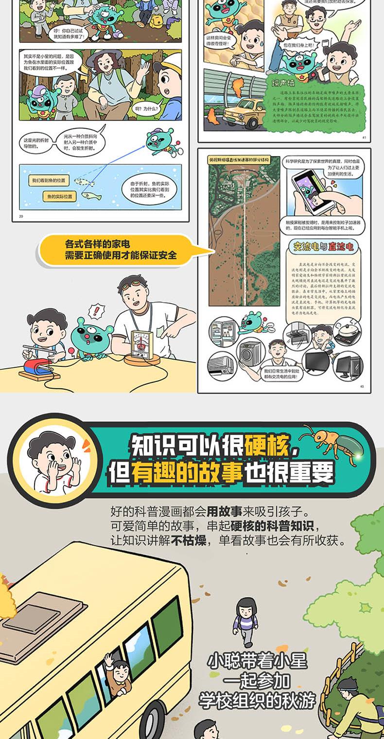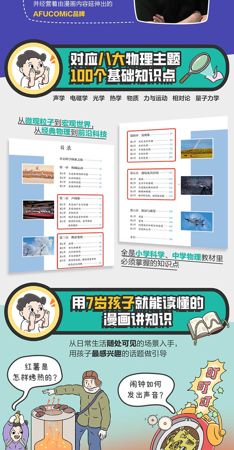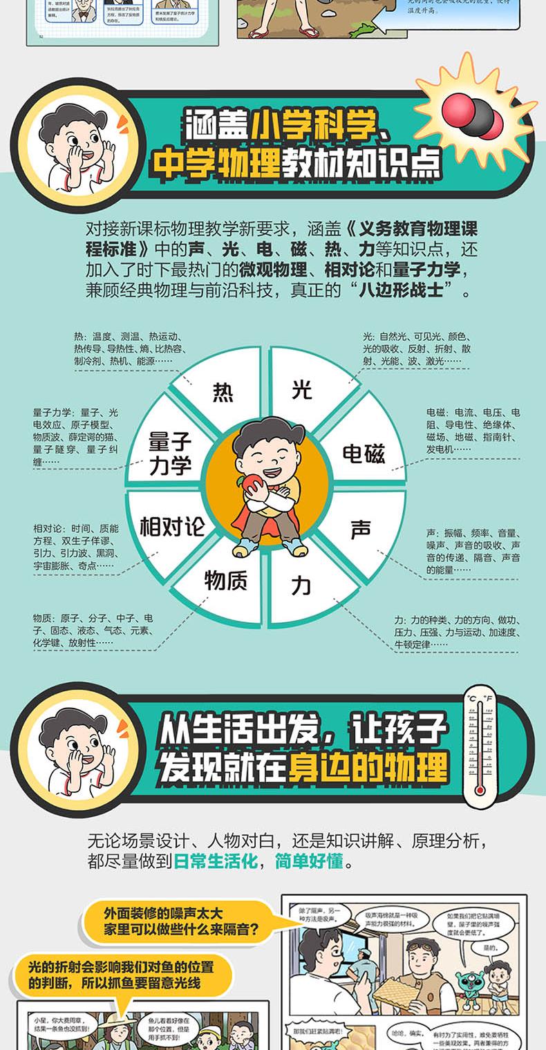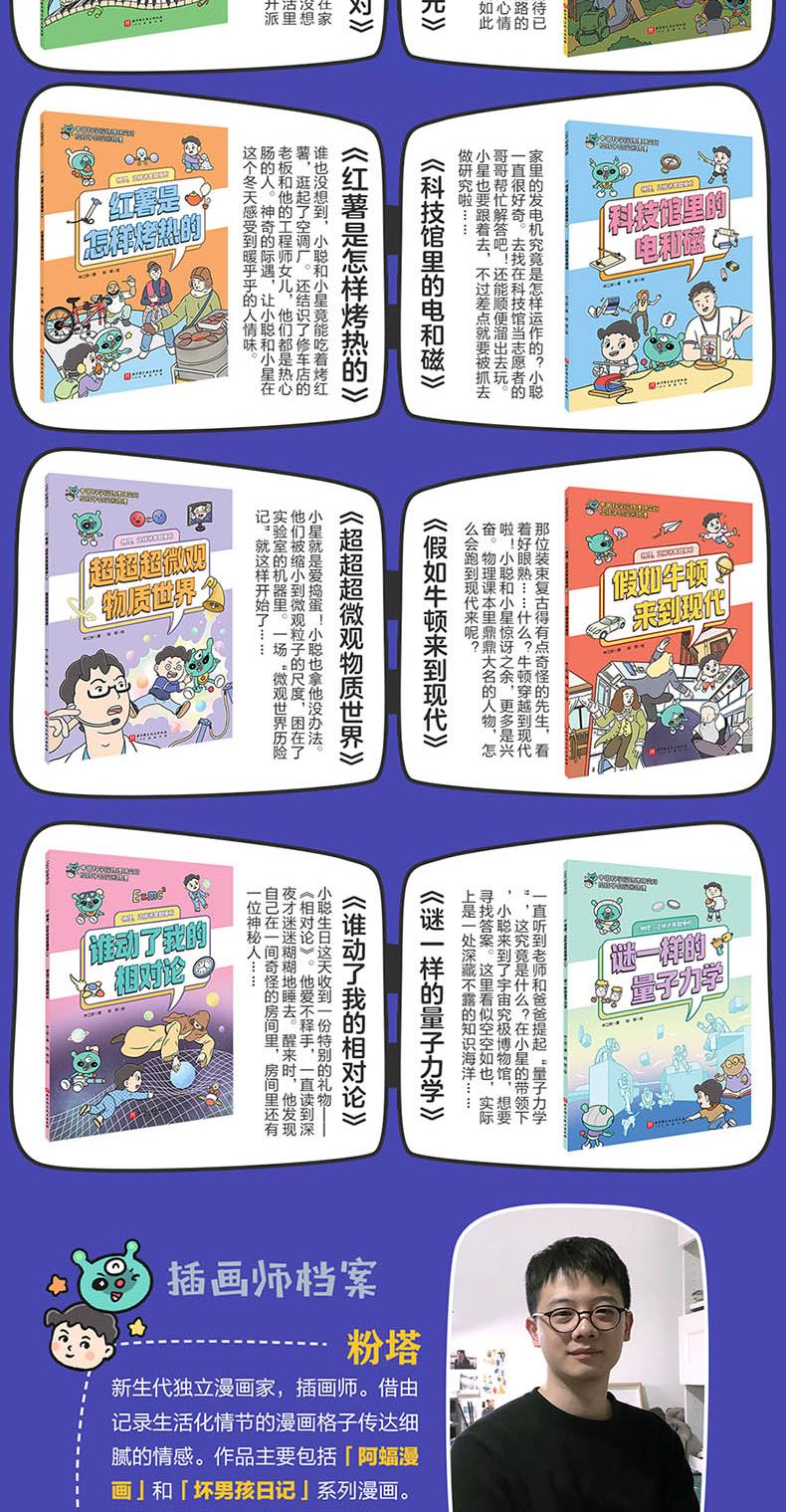 这是一套由中科院物理所联合知名青年插画师粉塔共同创作的给7-12岁孩子讲解物理知识的科普漫画,共8册,涵盖物质、声、光、热、电磁、力、相对论和量子力学8大主题,兼顾经典物理和前沿科学,100个知识点紧扣新课标教材,用代入感强的生活场景和轻松有趣的故事情节,为孩子讲解生活中的物理现象。来自莫雷星的外星小孩意外来到了地球,被小聪一家收留下来,并取名为小星。他和小聪成为了朝夕相处的好朋友,而且他们都有着共同的爱好——物理学。小聪想要成为像爸爸那样的物理学家;小星则希望回到母星成为一名宇宙飞船驾驶员。各怀梦想的他们,踏上了充满未知与惊喜的物理探索之旅…… 《暑假里的声音派对》 天气太热了,小聪和小星只想待在家里度夏。 本以为家里会很无聊,没想到让他们发现了新的乐趣—— 生活里有着各种各样的声音,它们就像开派对一样热闹。 《来自遥远宇宙的光》 秋色正好,小聪和小星踏上了期待已久的秋游之旅。 和煦的阳......