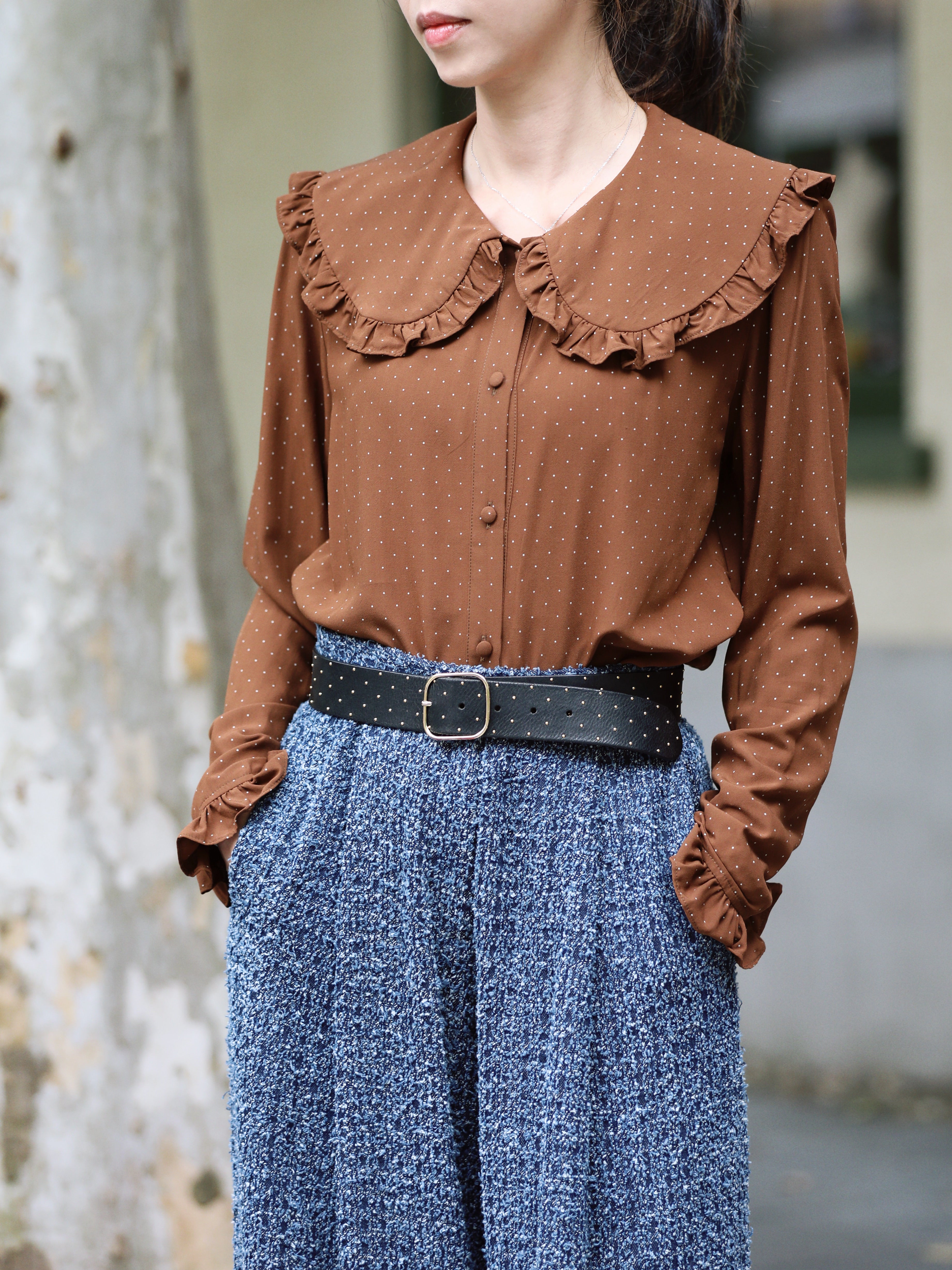 TYNVIE 棕色白点荷叶边领长袖衬衫