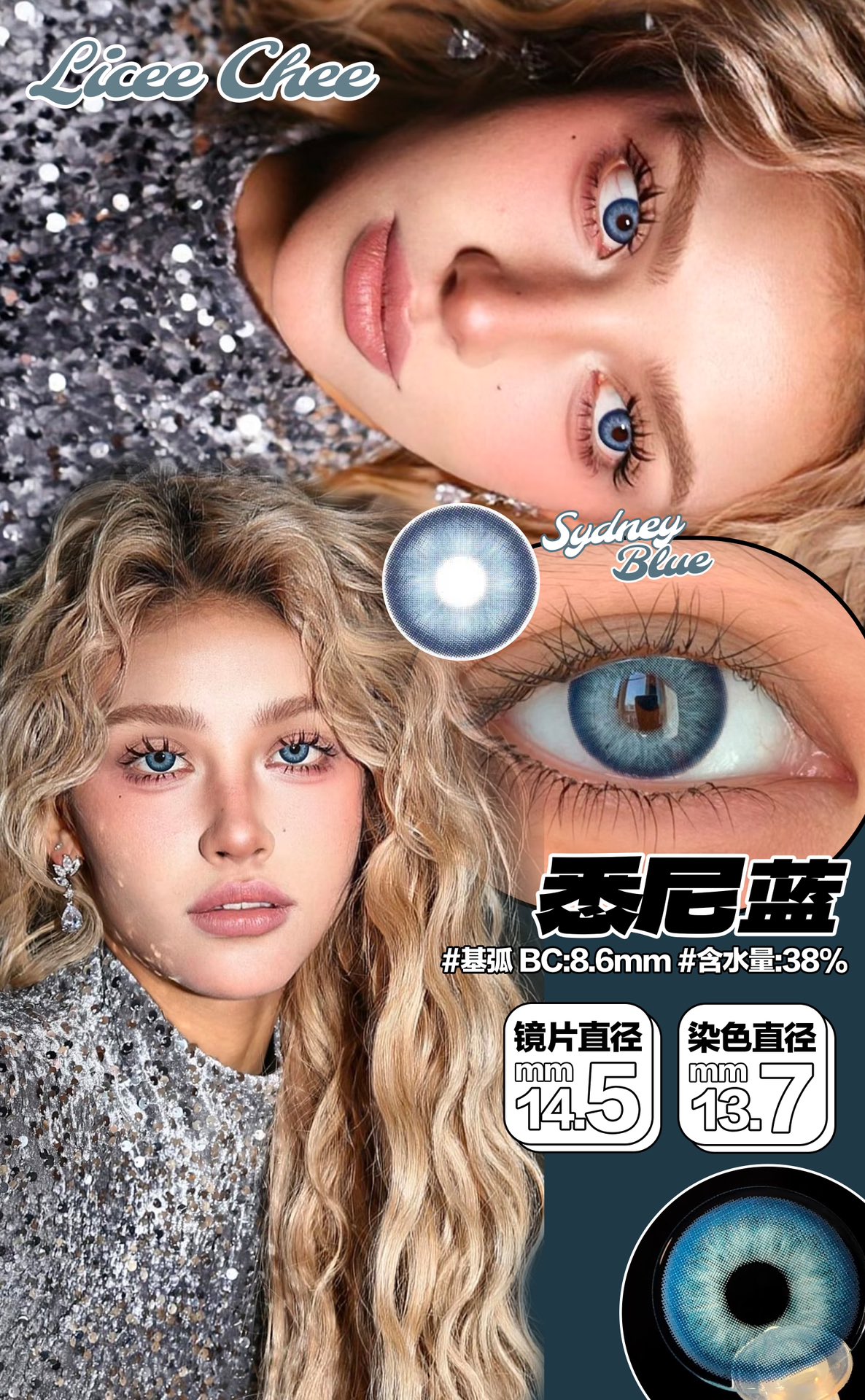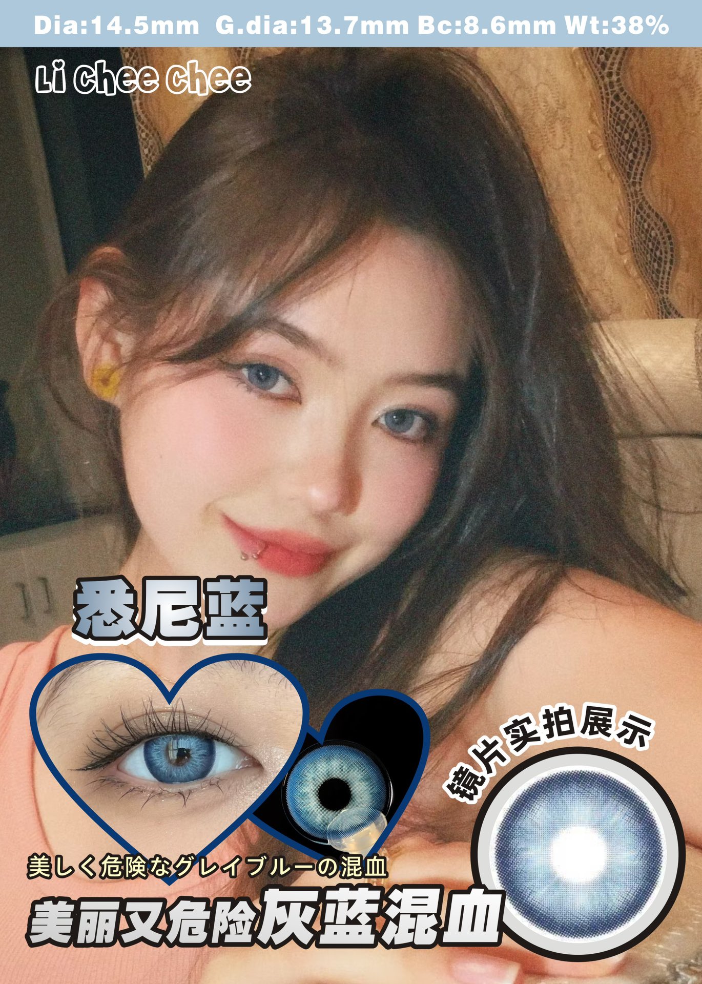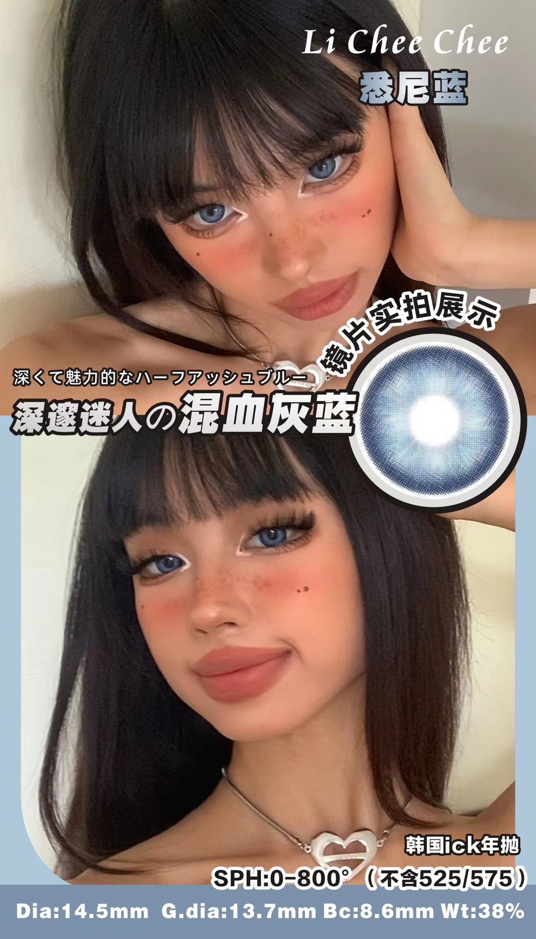 正品年抛| Licheechee系列悉尼蓝美瞳 | 直径14.5着色直径13.7 | 韩国产