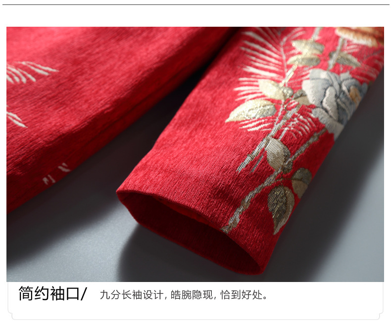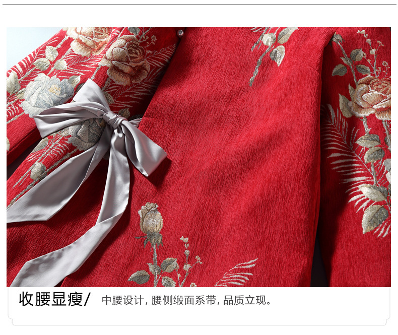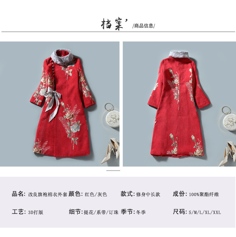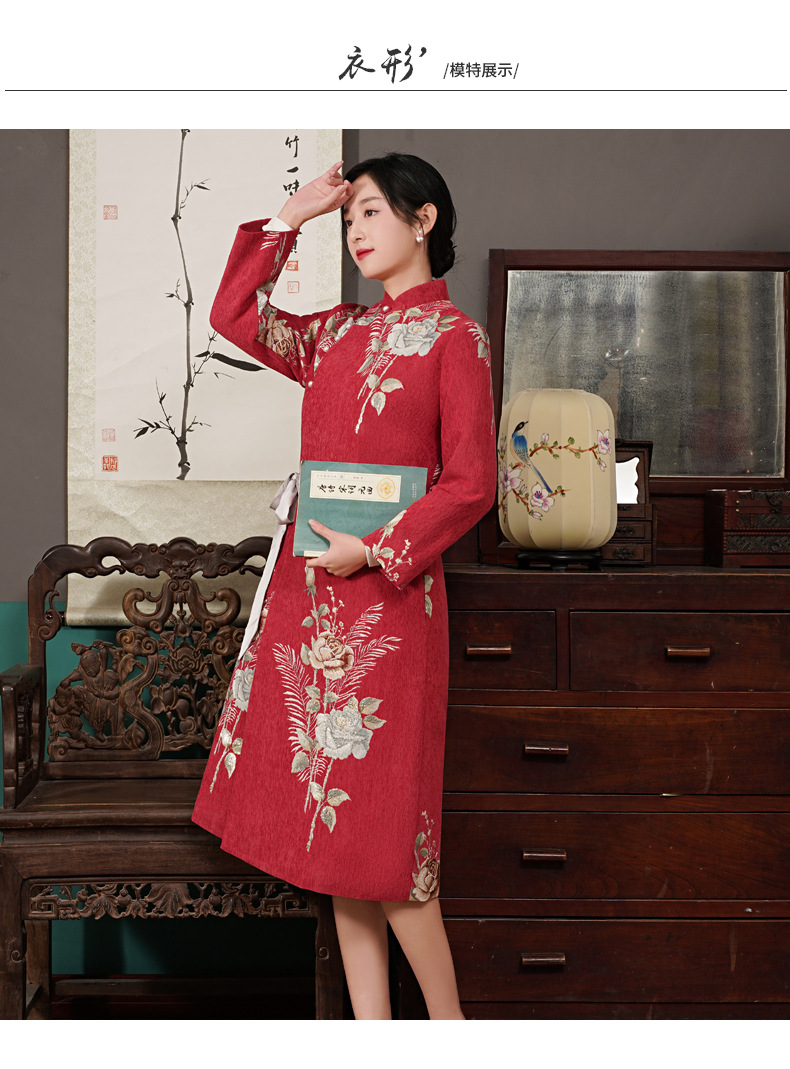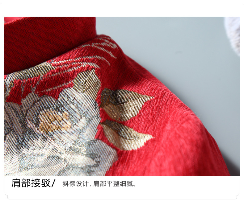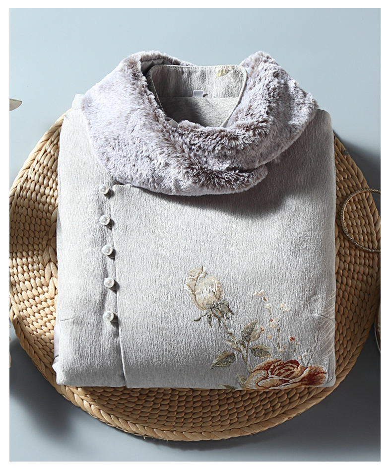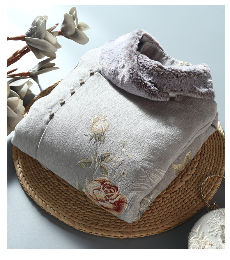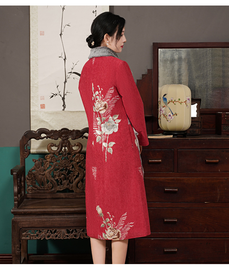 复古保暖,夹棉玫瑰提花立领中式兔毛领斜襟旗袍棉衣中长外套ZSM-211108
