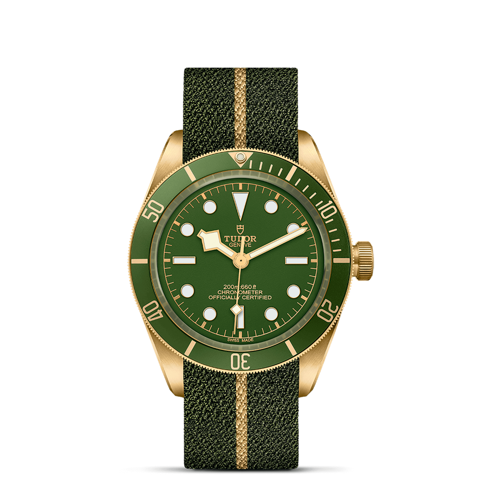 随表附送绿色织纹表带,饰以金色条纹,配18K黄金带扣