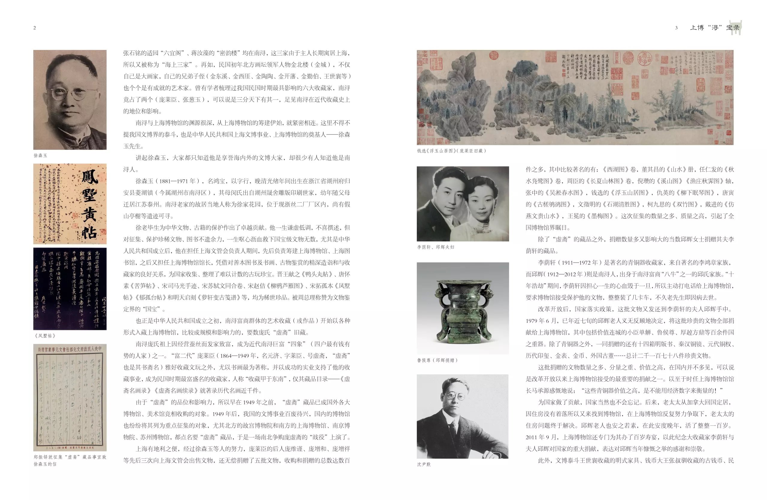 南浔与上海博物馆的渊源也很深,从上海博物馆的筹建伊始,南浔富商群体的艺术收藏(或作品)便开始以各种形式入藏上海博物馆。据不完全统计,上海博物馆馆藏文物中与南浔有关的文物总数逾万件,涉及青铜、陶瓷、玉器、书法、绘画、印章、雕塑、家具、钱币、文献、碑拓、竹刻等,几乎涵盖了上海博物馆馆藏所有门类,不仅数量多、门类广,而且质量尤为上乘。