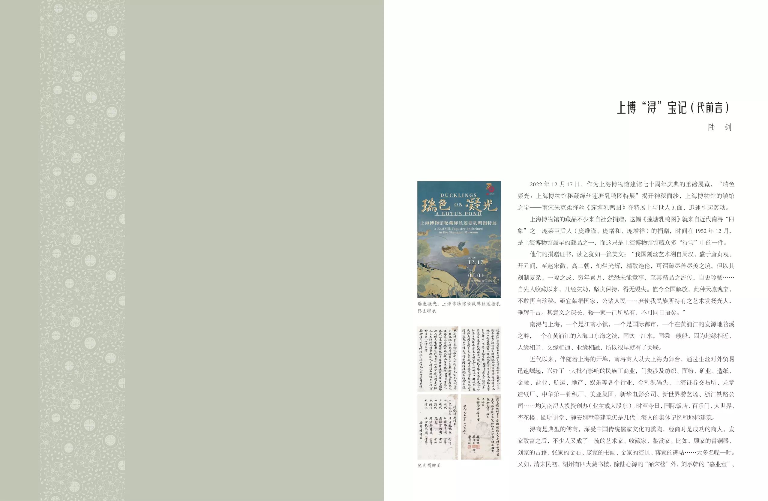 上海博物馆 2021 年推出了系列短视频节目《了不起的宝藏·探宝上海博物馆》,第一季共二十五集,所选的文物均是国宝中的国宝,其中与南浔有关的就有六集(北宋王诜《烟江叠嶂图》、南宋朱克柔缂丝《莲塘乳鸭图》、明董其昌《秋兴八景图》、明紫檀插肩榫大画案、鲁侯尊、厚趠方鼎),占总数的四分之一,可见“浔宝”的地位和价值。