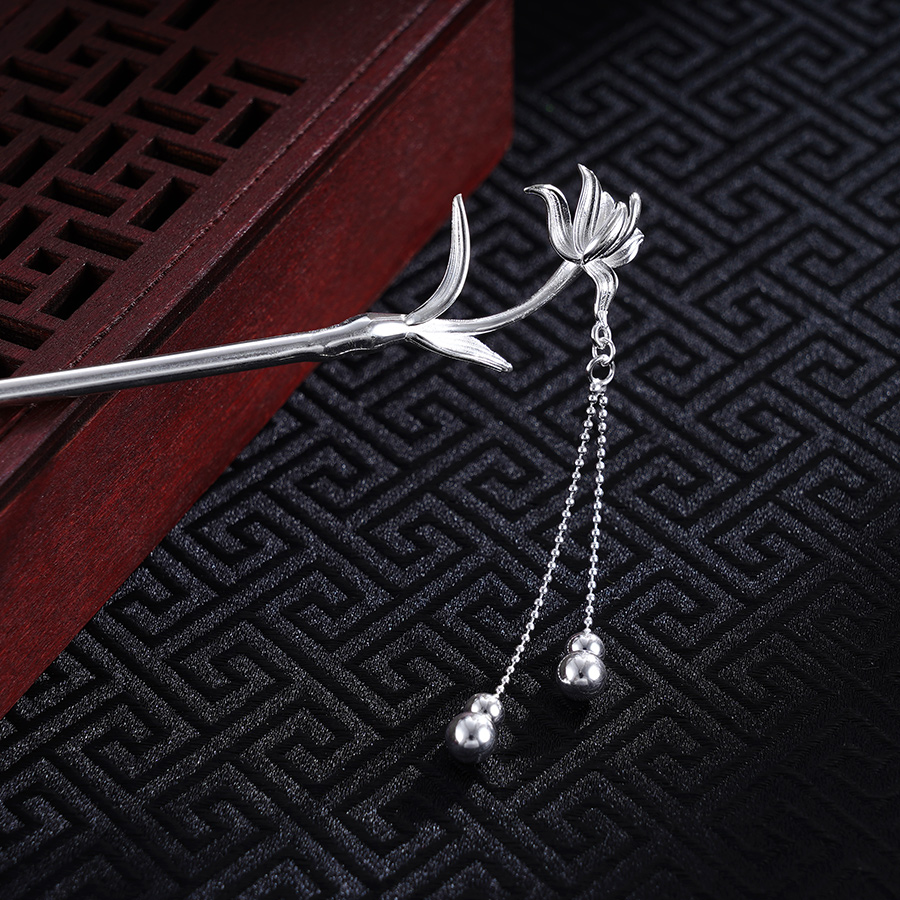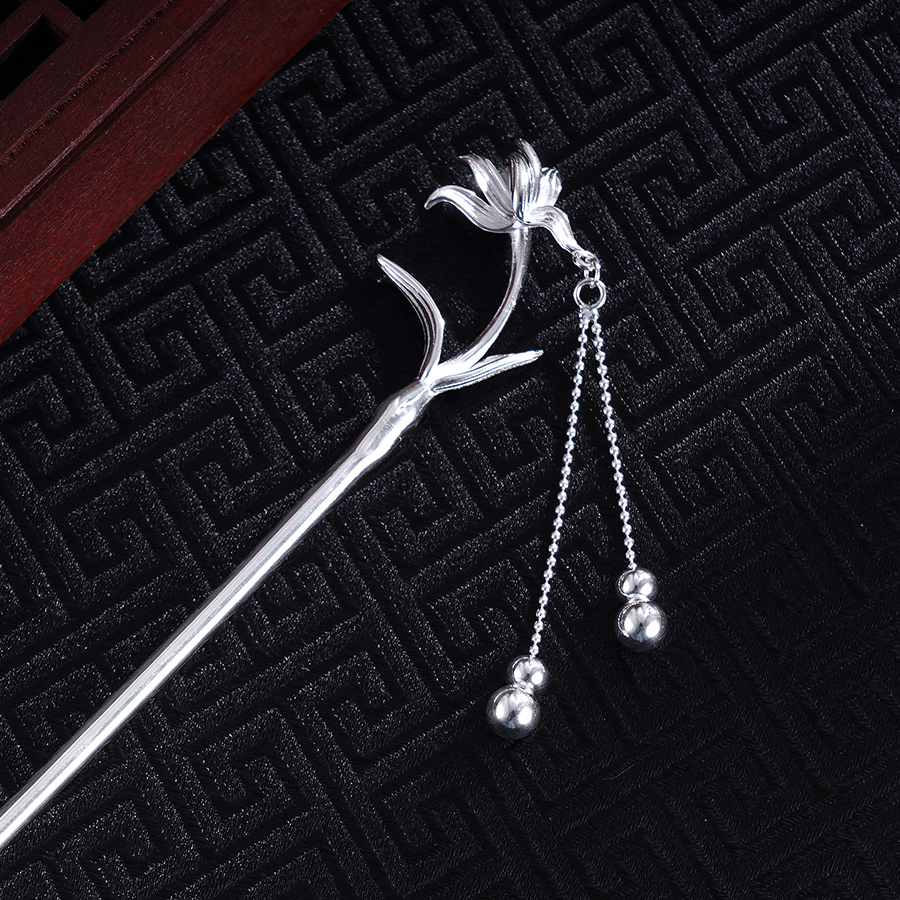 【寓意】:从大自然中采撷花朵一枝,打造纯银发簪。花朵形态舒展自如,枝叶婉转流畅。青丝轻挽,韵味非常。