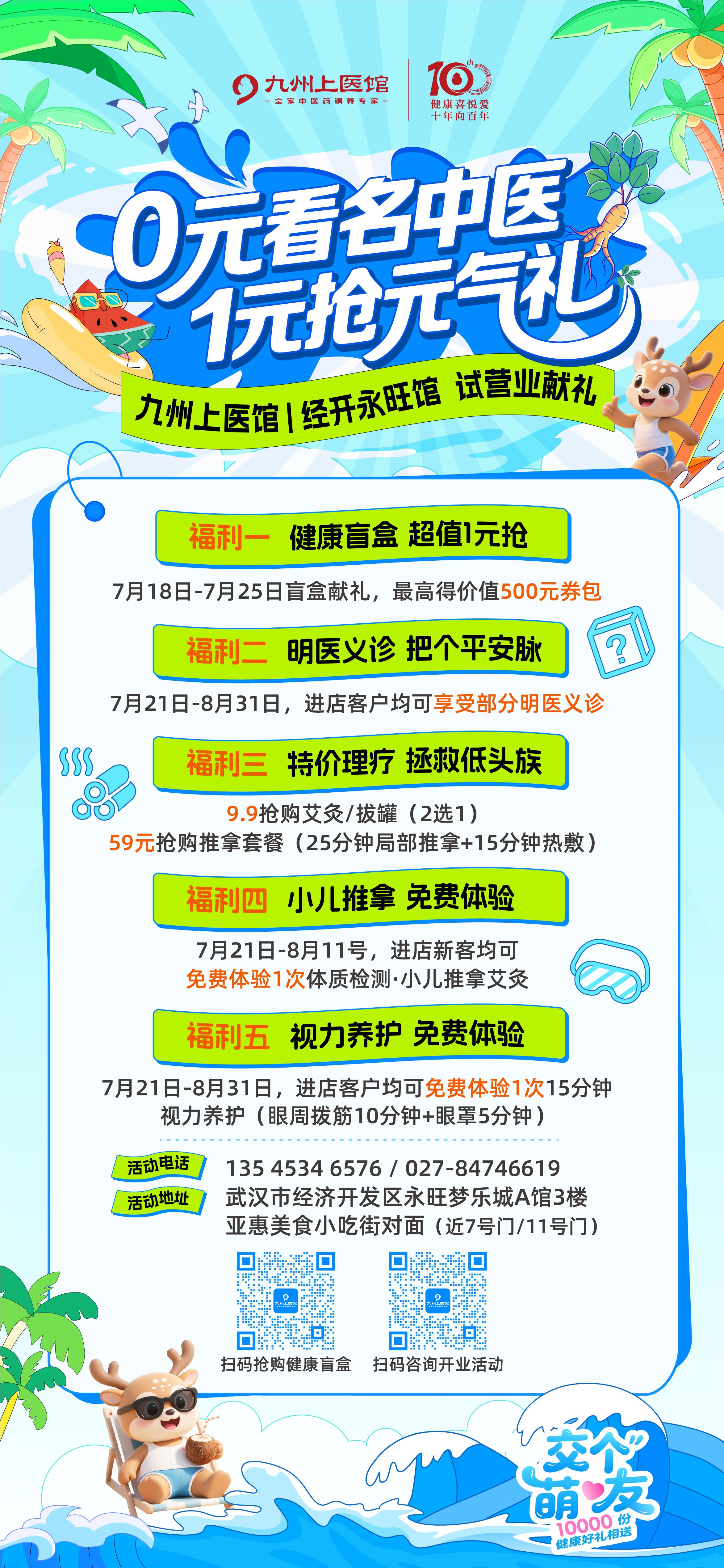 活动说明:每个账户限参与1次试营业优惠活动;抢购成功,需在有效期内线下到店核销,并抽取幸运盲盒。在法律法规允许的范围内,九州上医馆(经开永旺馆)保留本次活动的最终解释权。