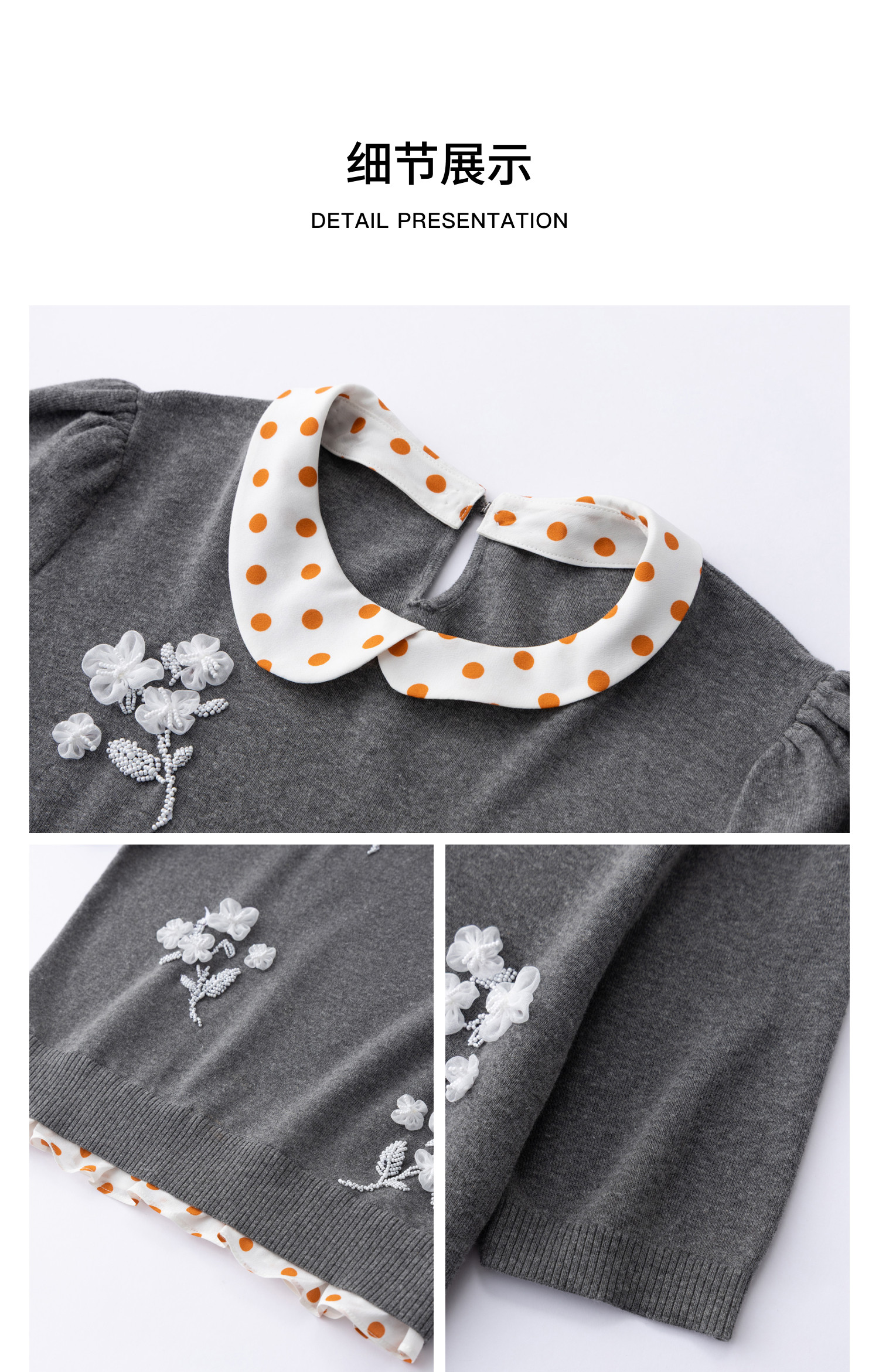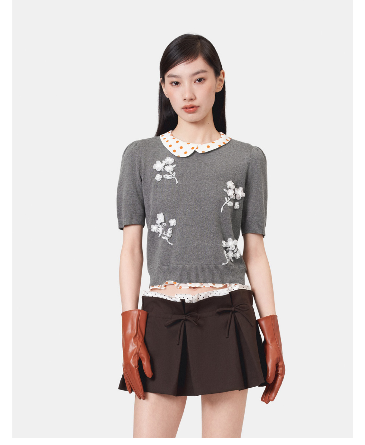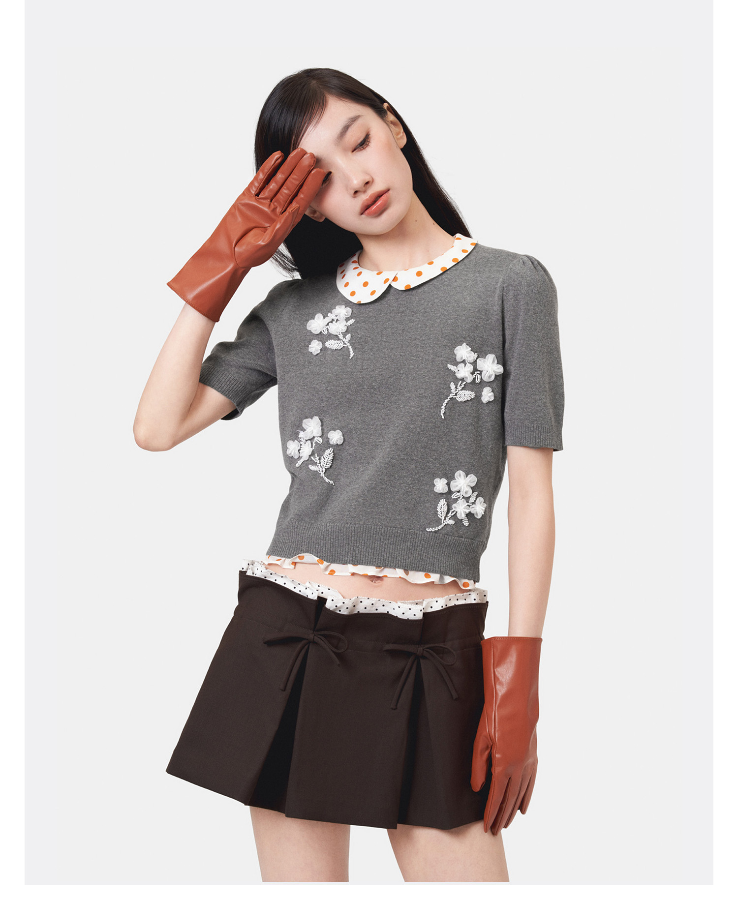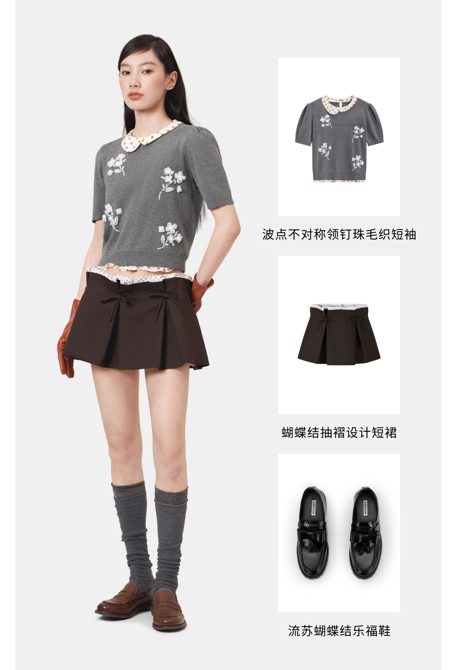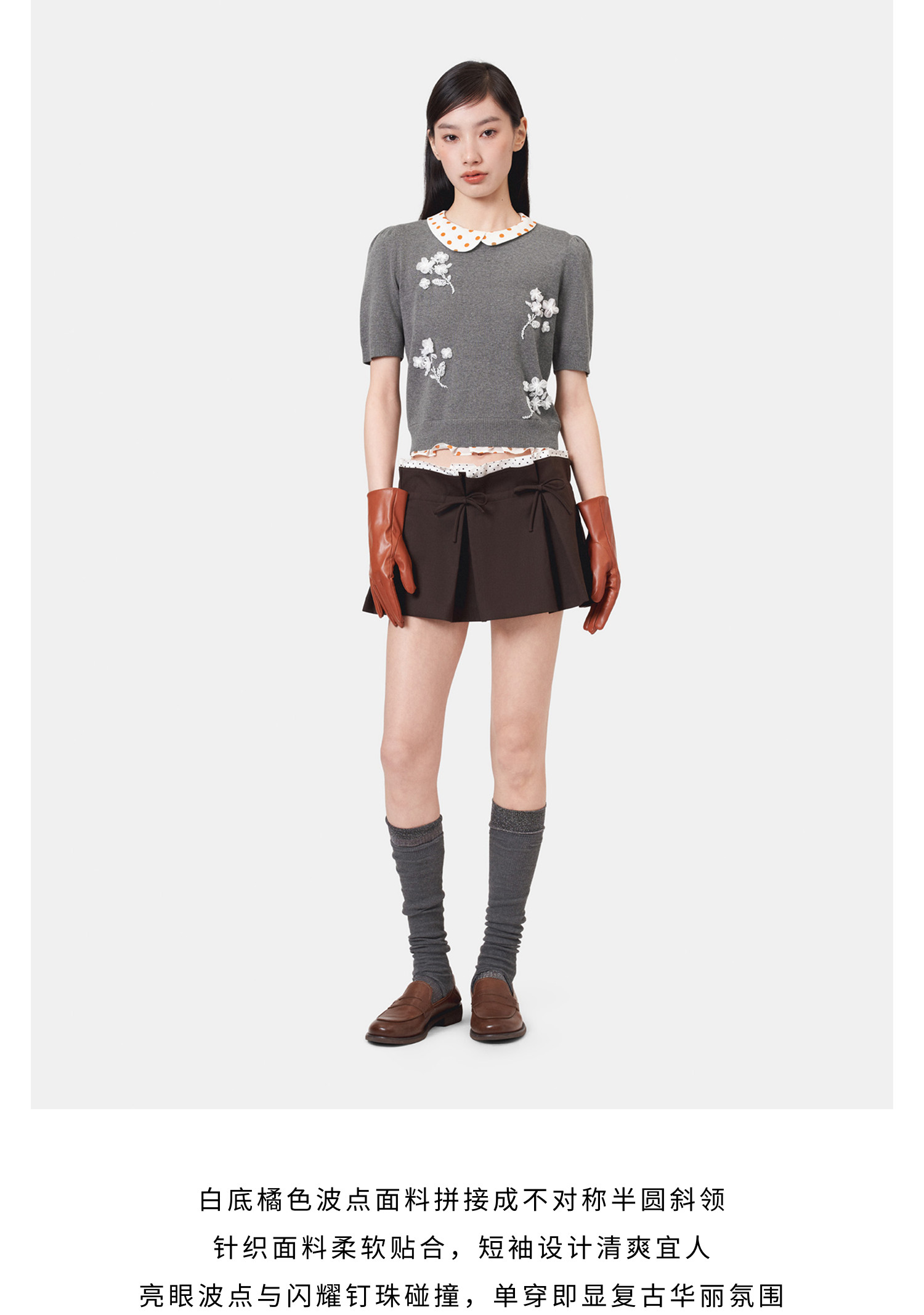 HERLIAN 2026年春季新品波点不对称领钉珠女士短袖套头针织衫