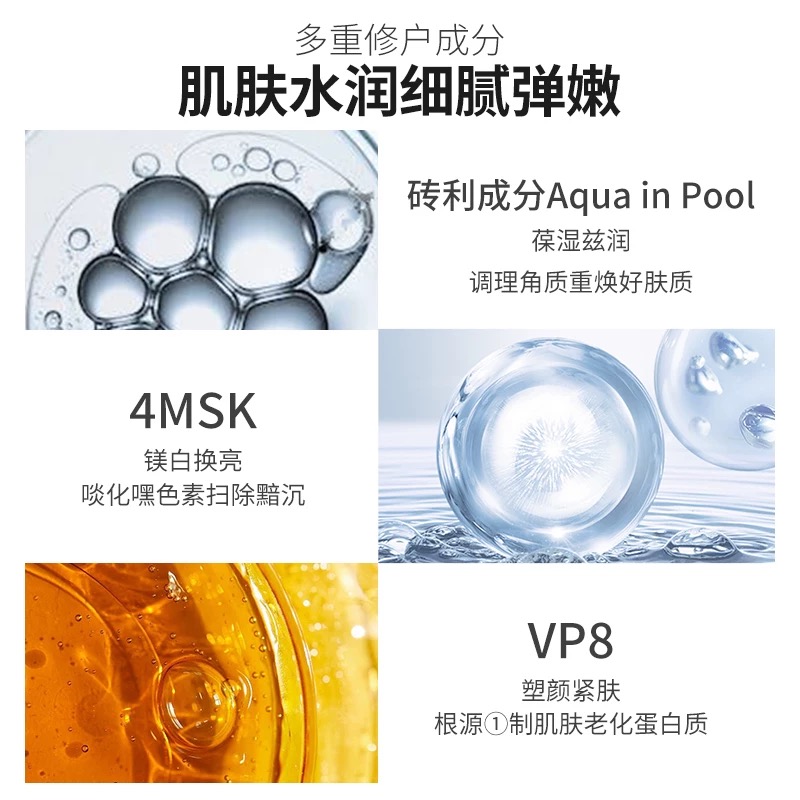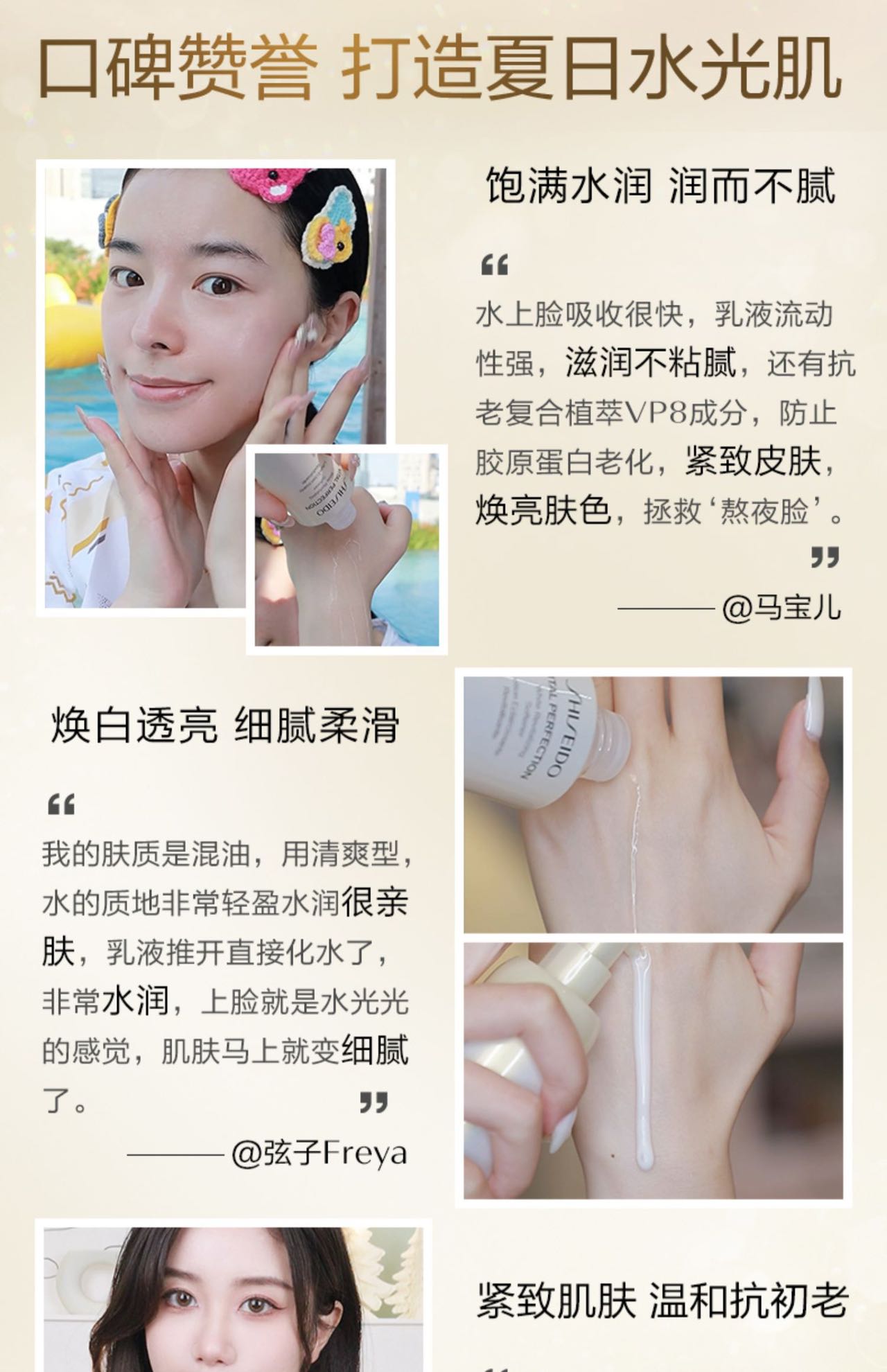 悦薇水乳含有资生堂独家革命性成分”4MSK+VP8“、玻尿酸、甘油和美肌油性玻尿酸,主打的是抗初老、改善细纹、皮肤松弛、提亮肤色、改善暗沉、美白肌肤、有效抑制黑色素转化为色斑,保持肌肤莹润有弹性。推出的这款滋润型水乳,适合中性、干性、偏干性肌肤;虽然是滋润版,但是水乳的流动性都很好,水是一种滋润且轻薄的感觉;乳液相对于清爽型更滋润一些;滋润但不会油腻。