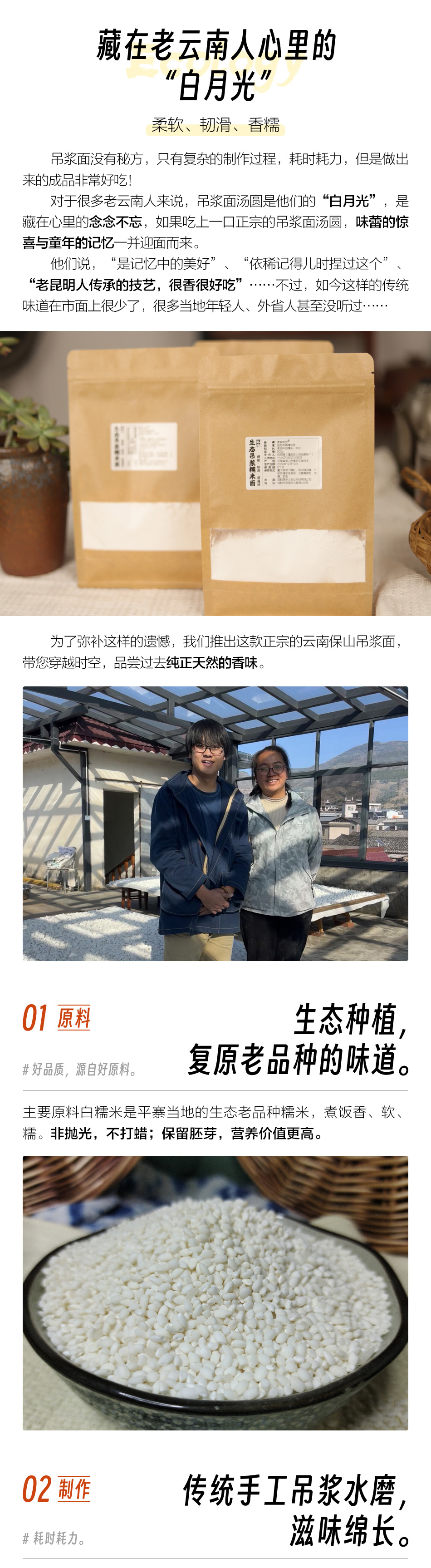 【手作者】:白丽娟(隆阳区小白妈面粉厂) 【小作坊登记证】:YNXZF0502100633 【原料】:老品种白糯米、井水 【净含量】:500g 【生产日期】:见包装 【保质期】:6个月 【储存条件】:置于阴凉干燥处,或冰箱冷藏,开封后请尽快食用,注意需密封、防潮、防虫 【生产地址】:云南省保山市隆阳区金鸡乡 【制作时间】:仅立冬后2-3个月,感兴趣的饭友们别错过哟~