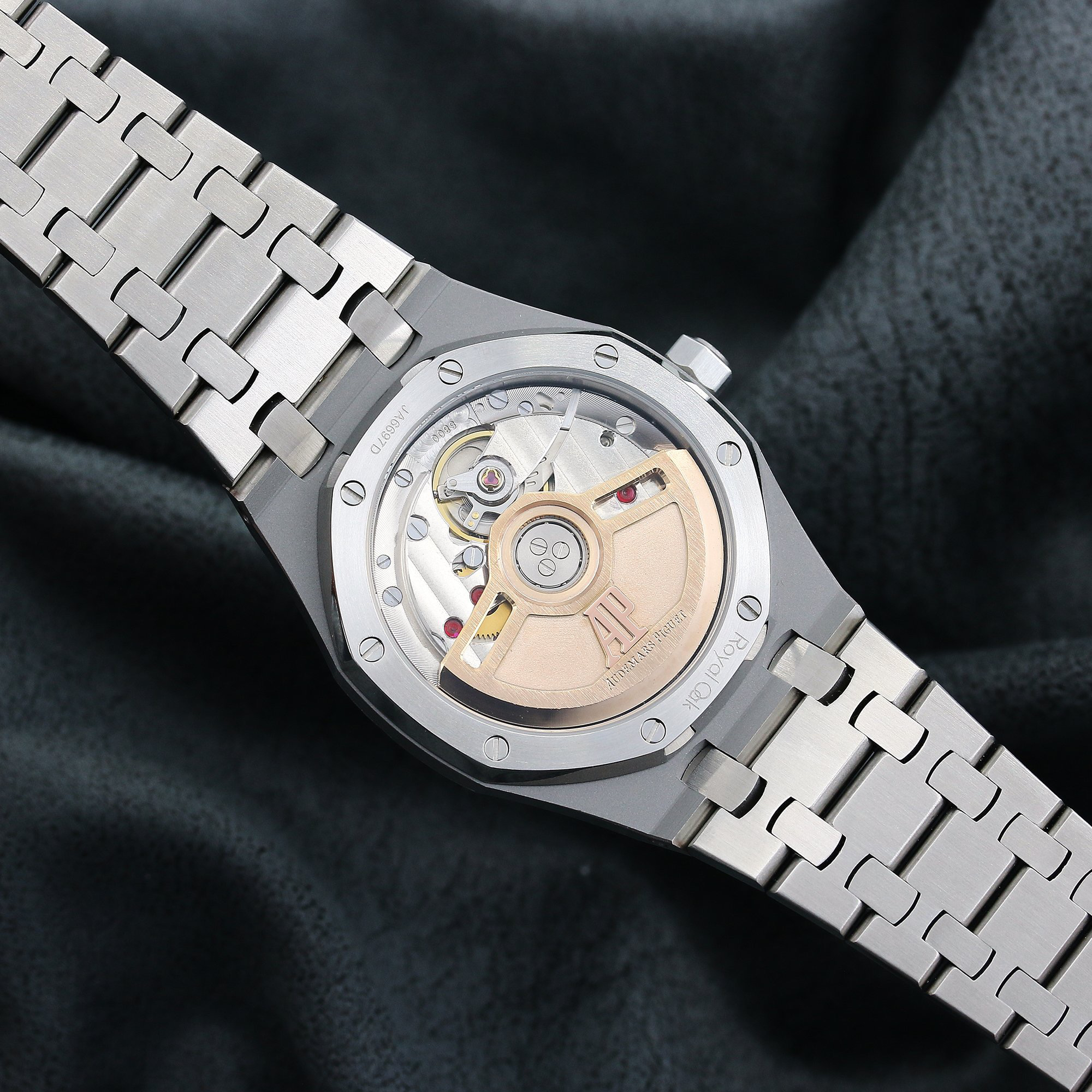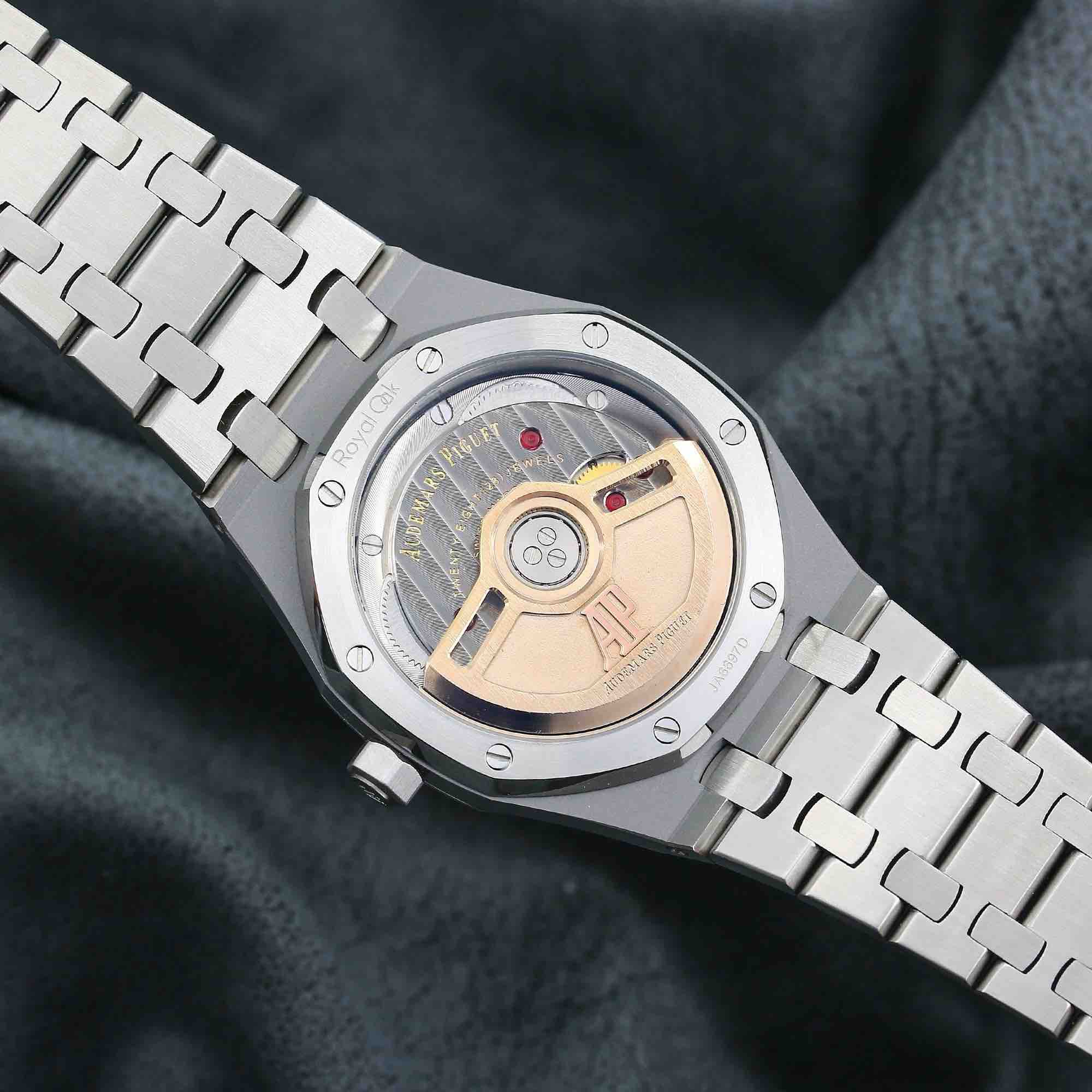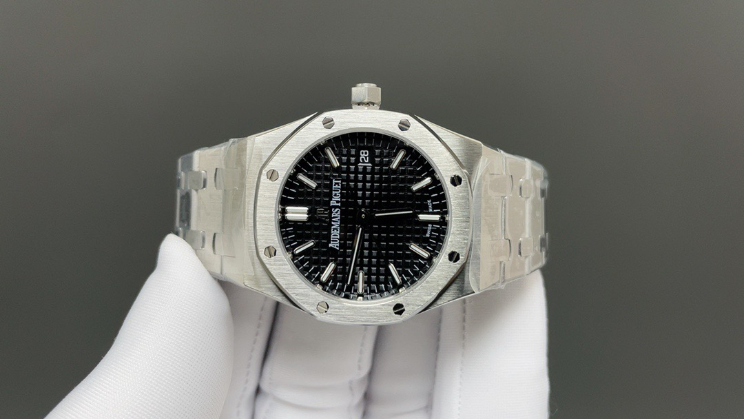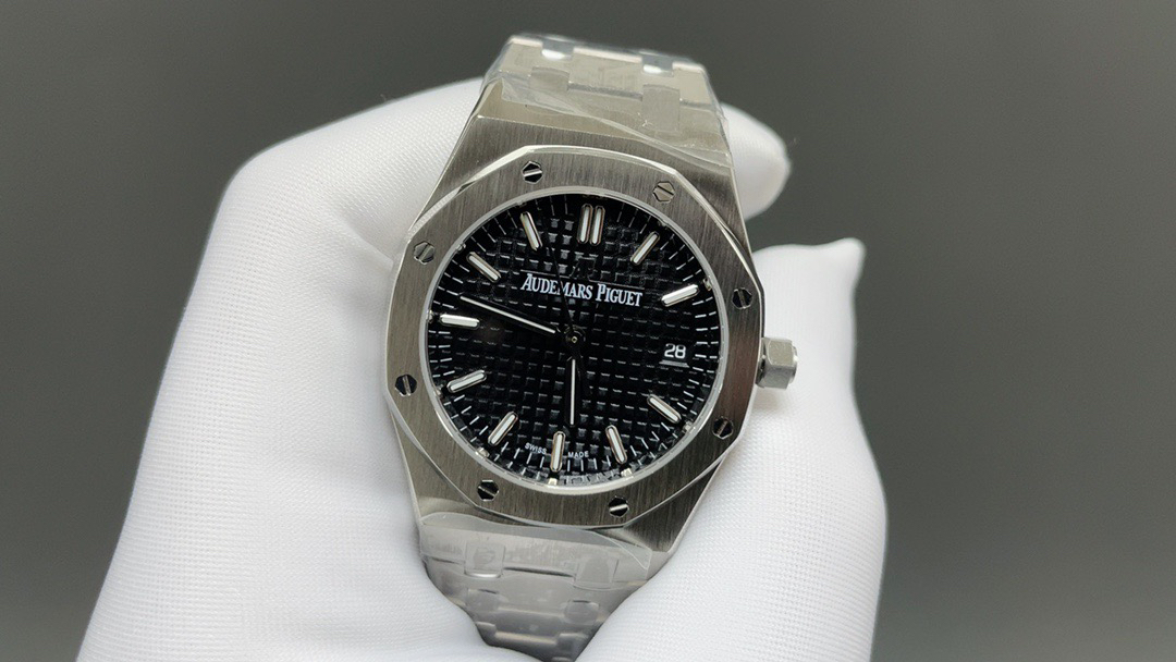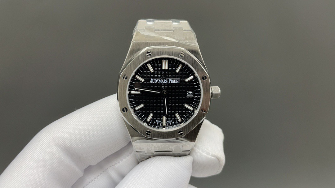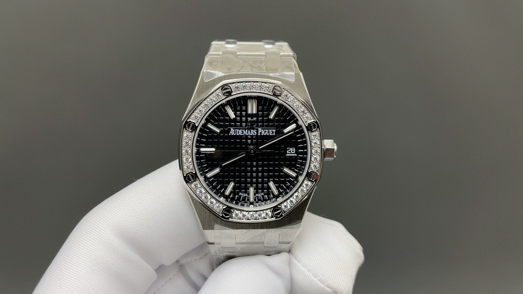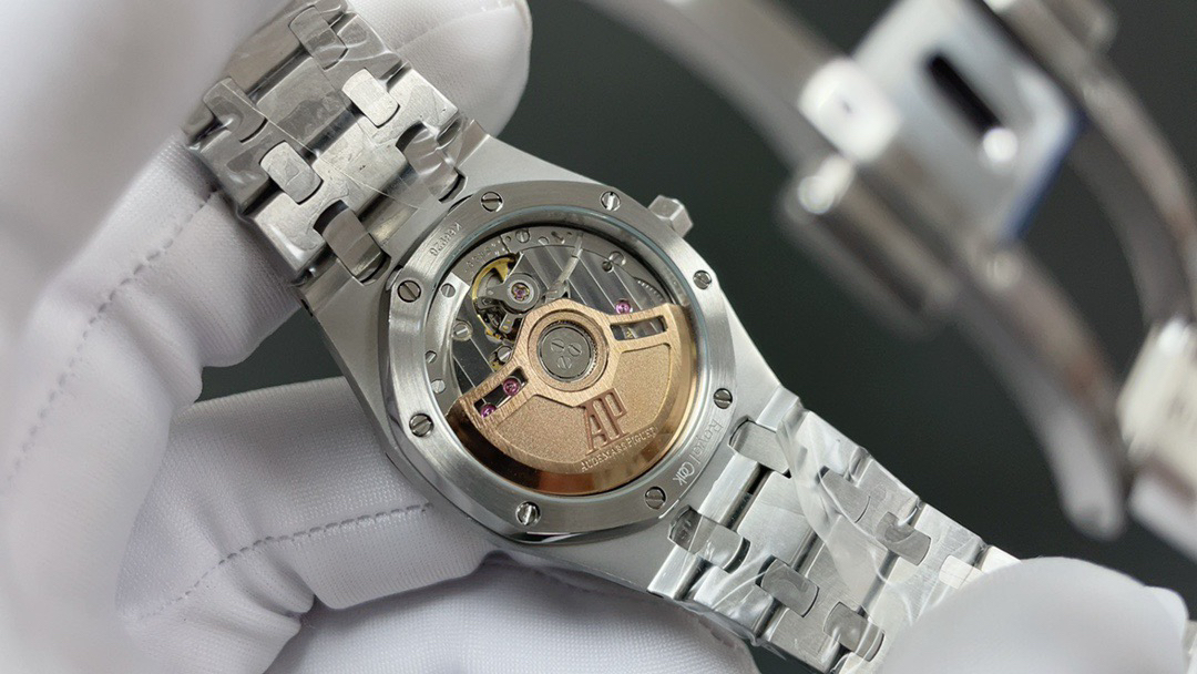 NOOB新品 直径34毫米的皇家橡树系列自动上链腕表,以全新表壳尺寸再现这一传奇系列的前卫风格,并为纤细手腕的佩戴者演绎出别样的优雅格调。全新腕表均搭载9015改Calibre 5800自动上链机芯,采用为该款式特别设计的玫瑰金金自动摆陀。