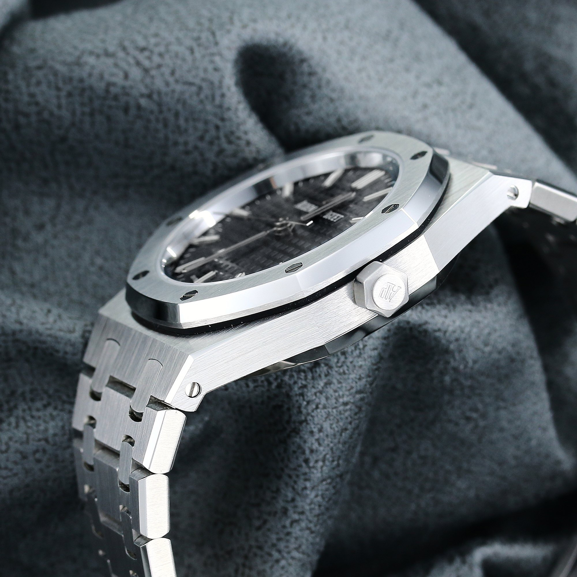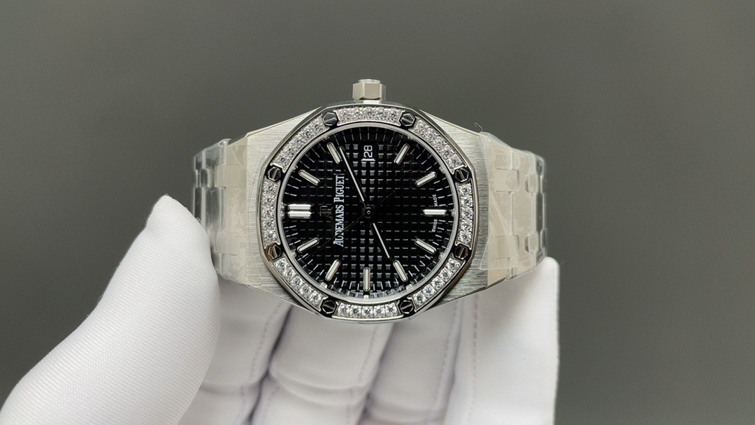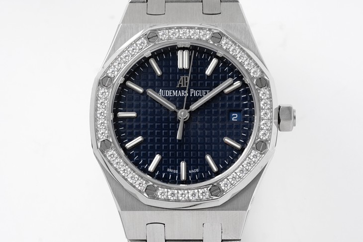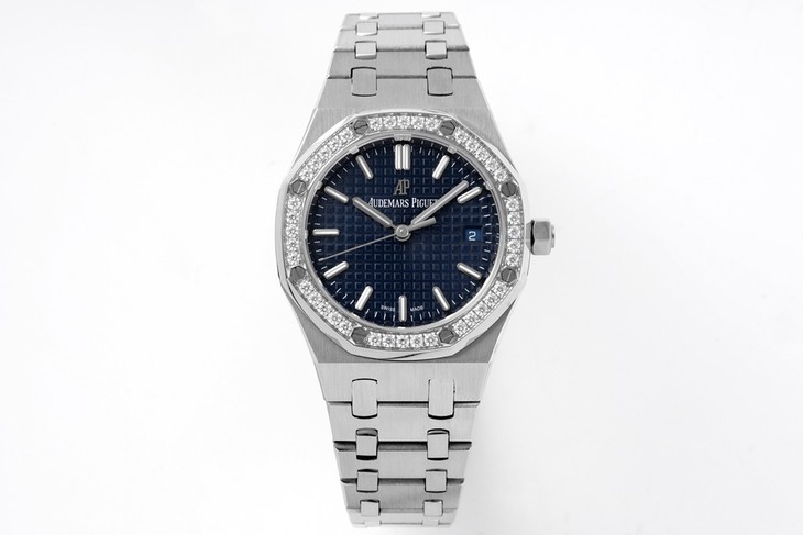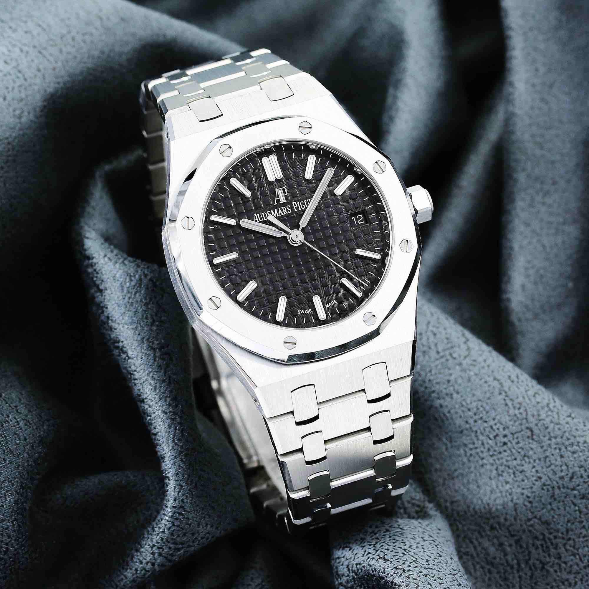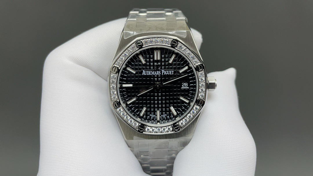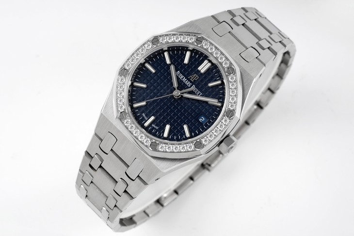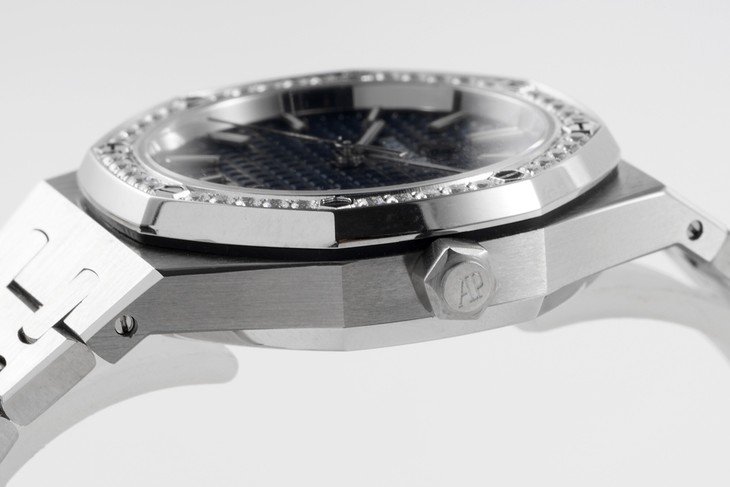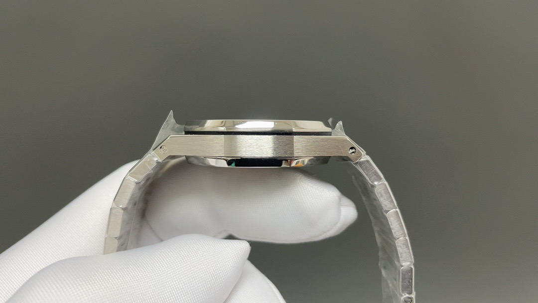 NOOB新品 直径34毫米的皇家橡树系列自动上链腕表,以全新表壳尺寸再现这一传奇系列的前卫风格,并为纤细手腕的佩戴者演绎出别样的优雅格调。全新腕表均搭载9015改Calibre 5800自动上链机芯,采用为该款式特别设计的玫瑰金金自动摆陀。